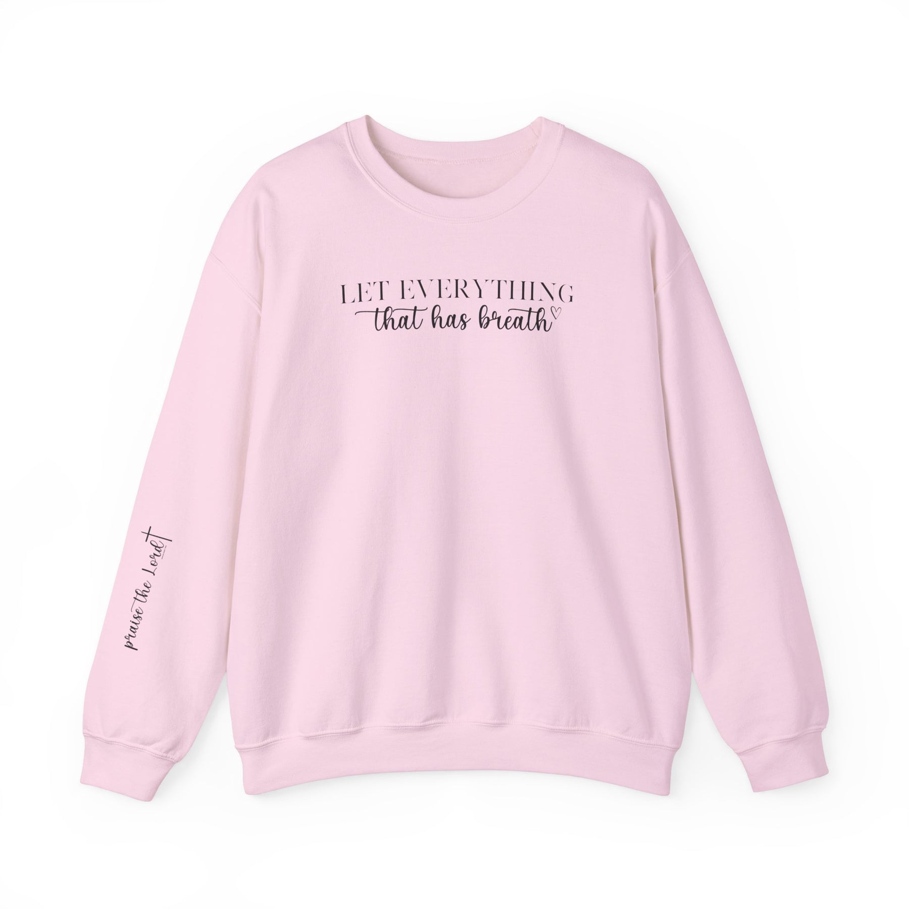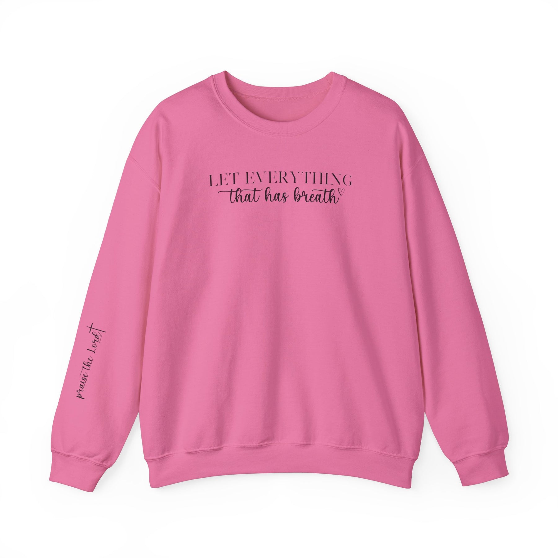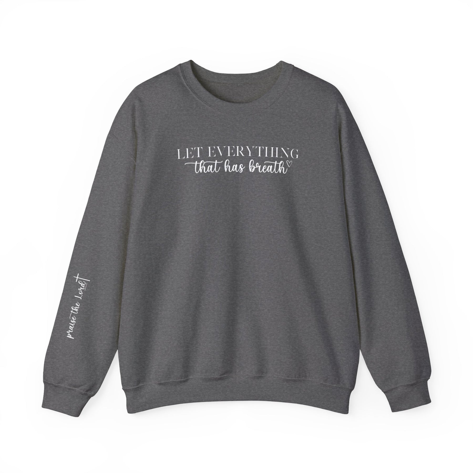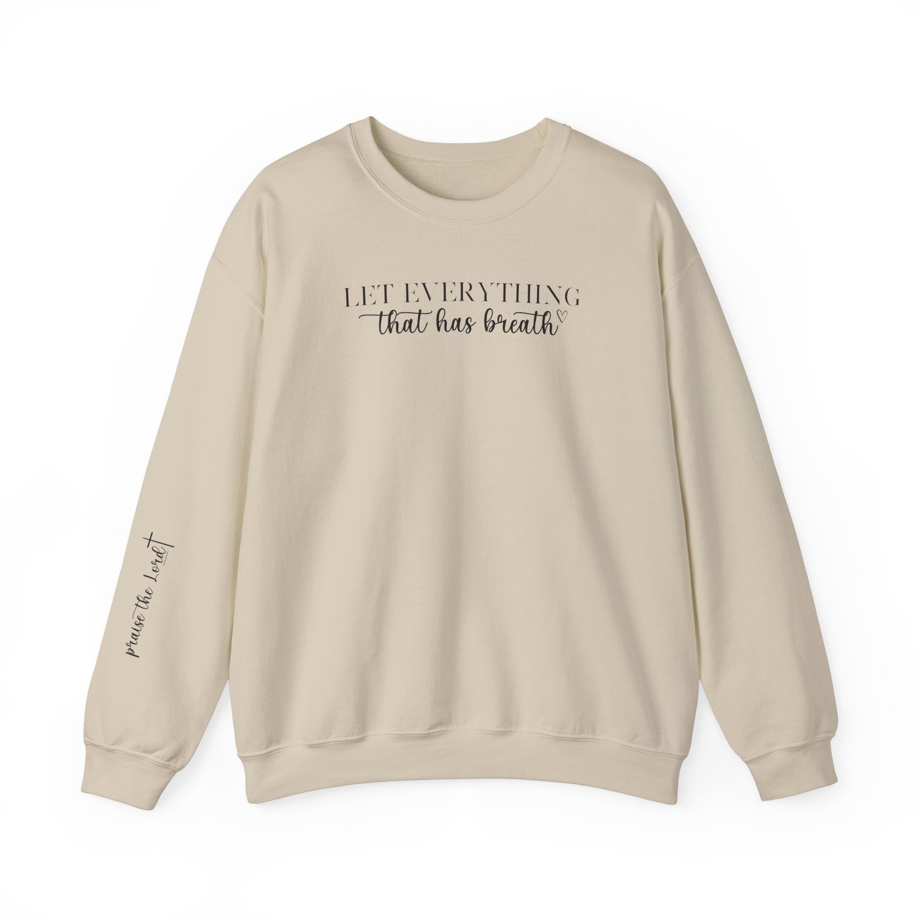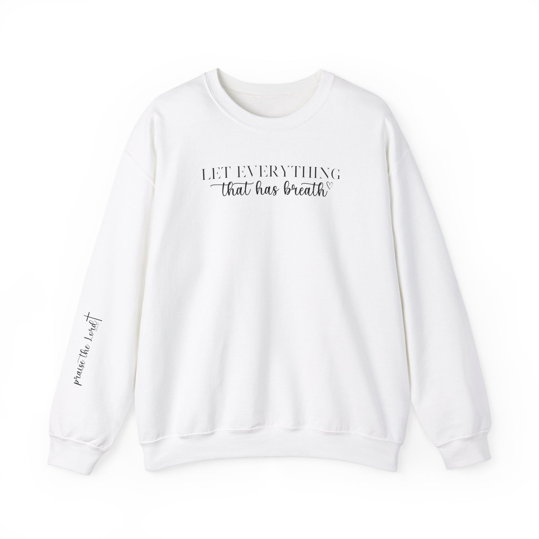 Unisex heavy blend crewneck sweatshirt featuring Let Everything That Has Breath Praise the Lord design. Medium-heavy 50% cotton, 50% polyester fabric with ribbed knit collar, double-needle stitching, and tear-away label for ultimate comfort and durability. Made ethically in the US.
