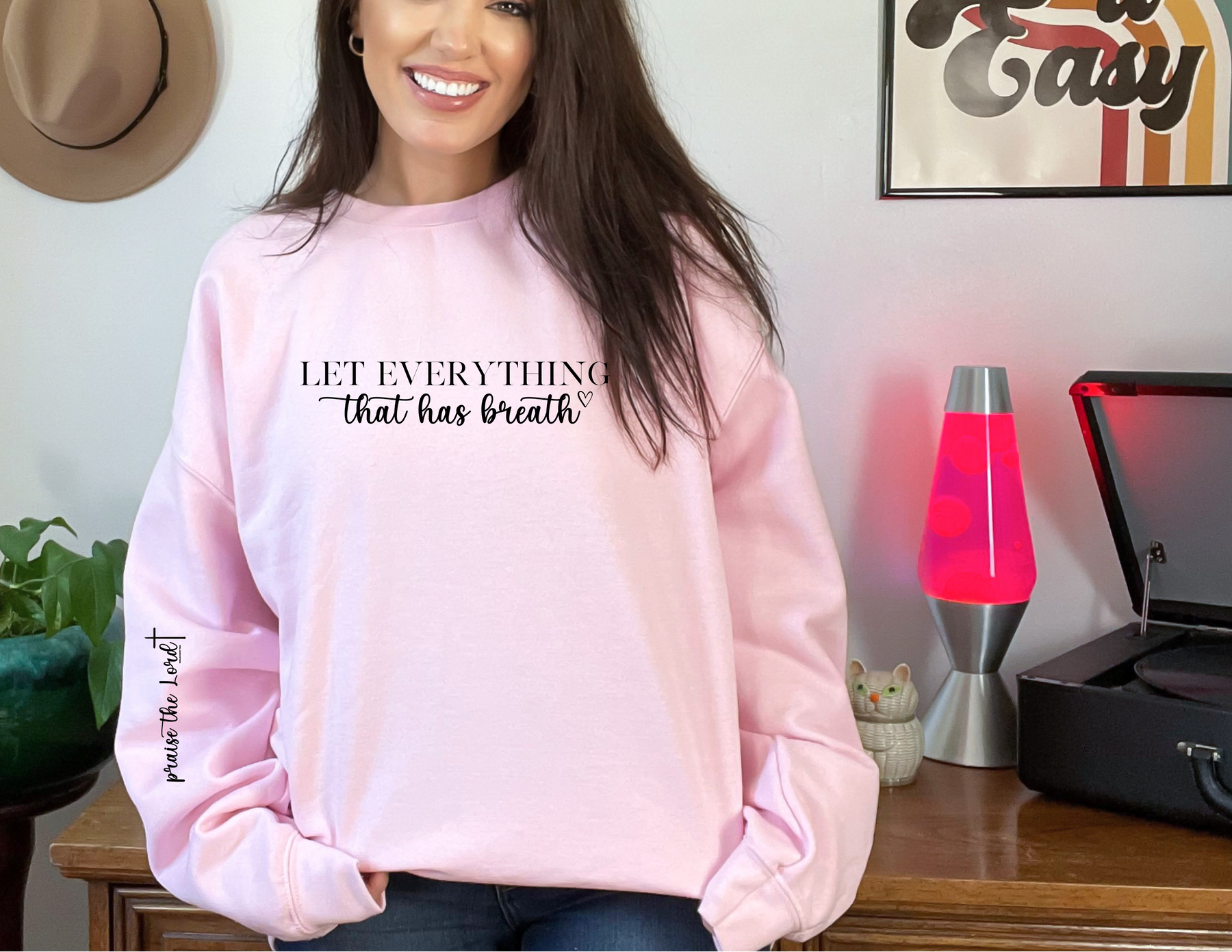 Unisex Let Everything That Has Breath Praise the Lord Crew sweatshirt, medium-heavy blend of cotton and polyester, ribbed knit collar, classic fit, double-needle stitching for durability, tear-away label, ethically grown US cotton.