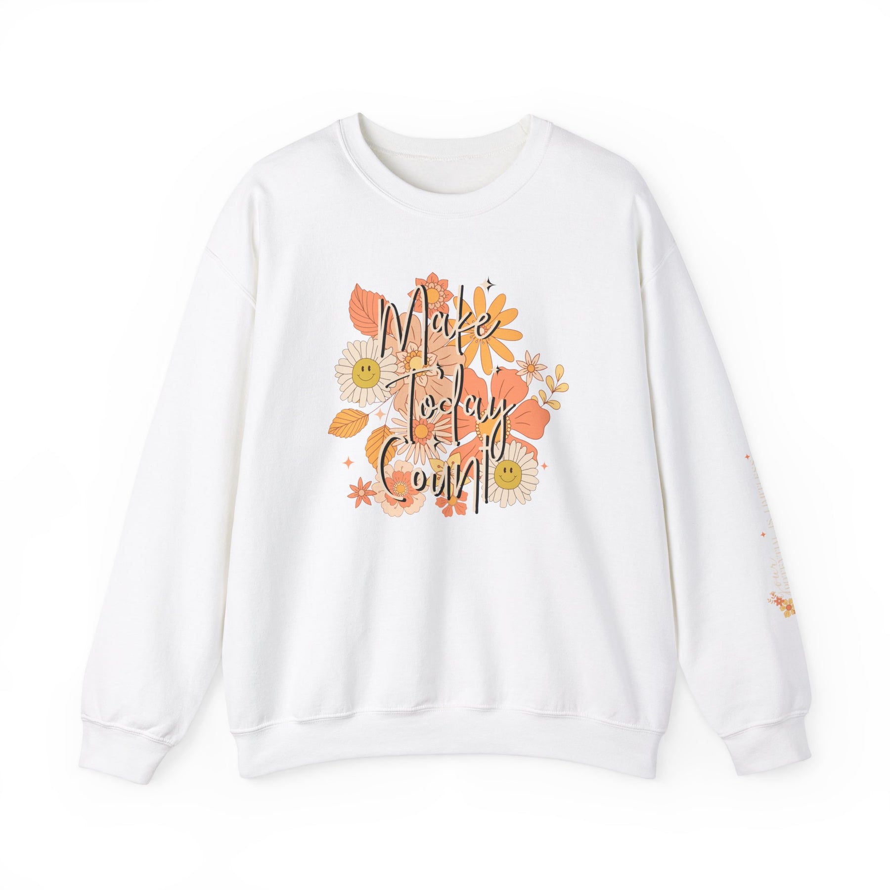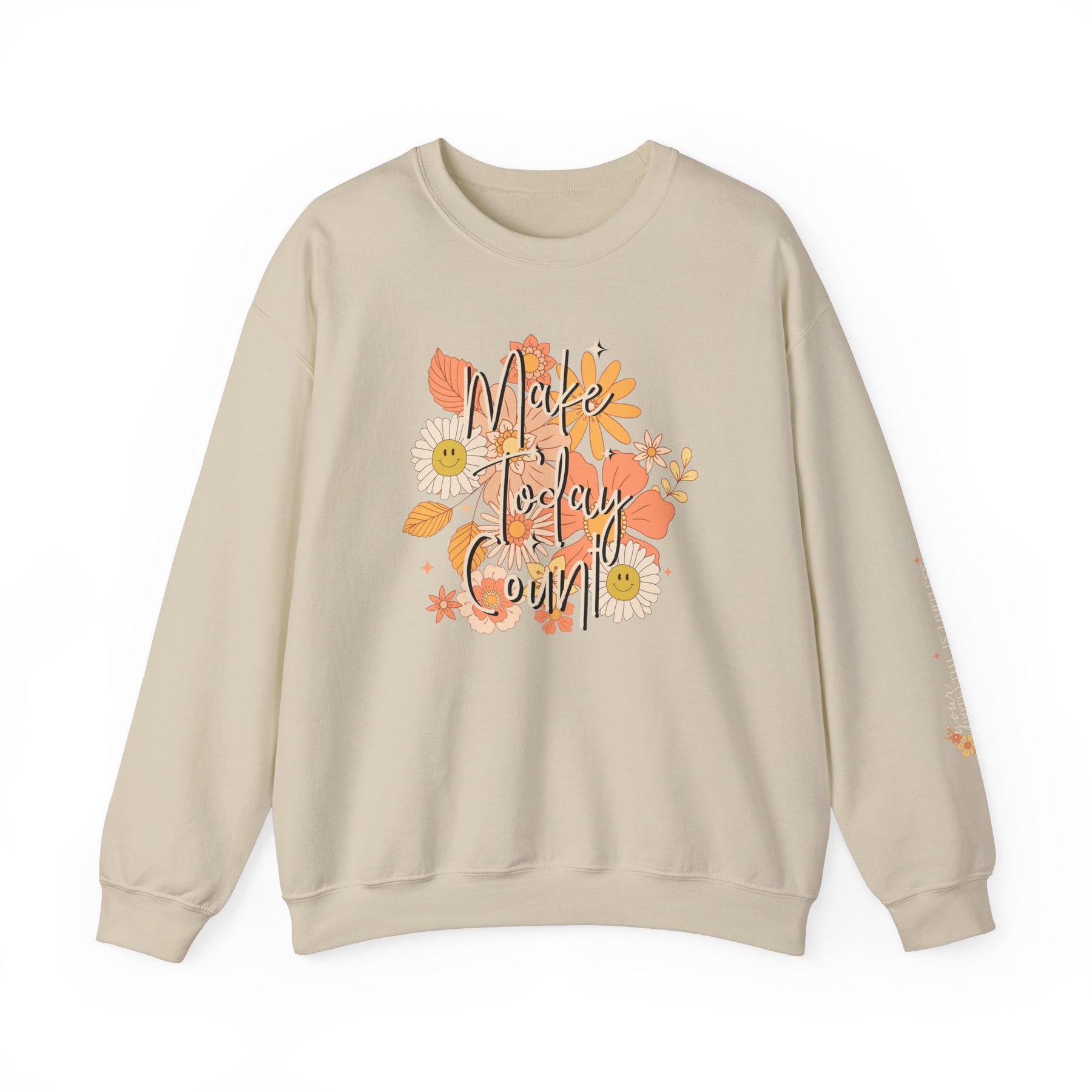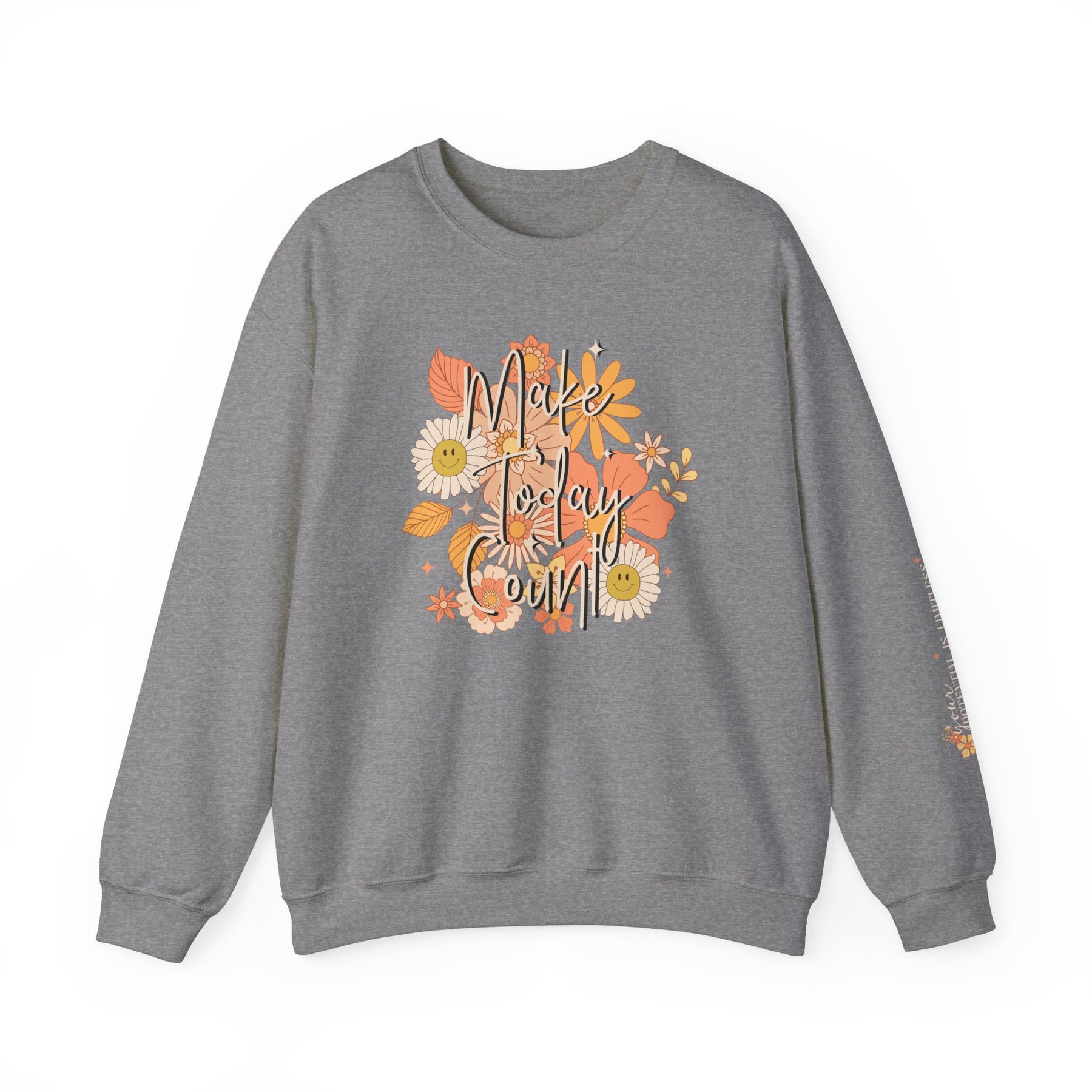 A comfortable unisex heavy blend crewneck sweatshirt, the Make Today Count Crew, features a flower design. 50% cotton, 50% polyester, ribbed knit collar, loose fit, medium-heavy fabric. Ideal for everyday wear.