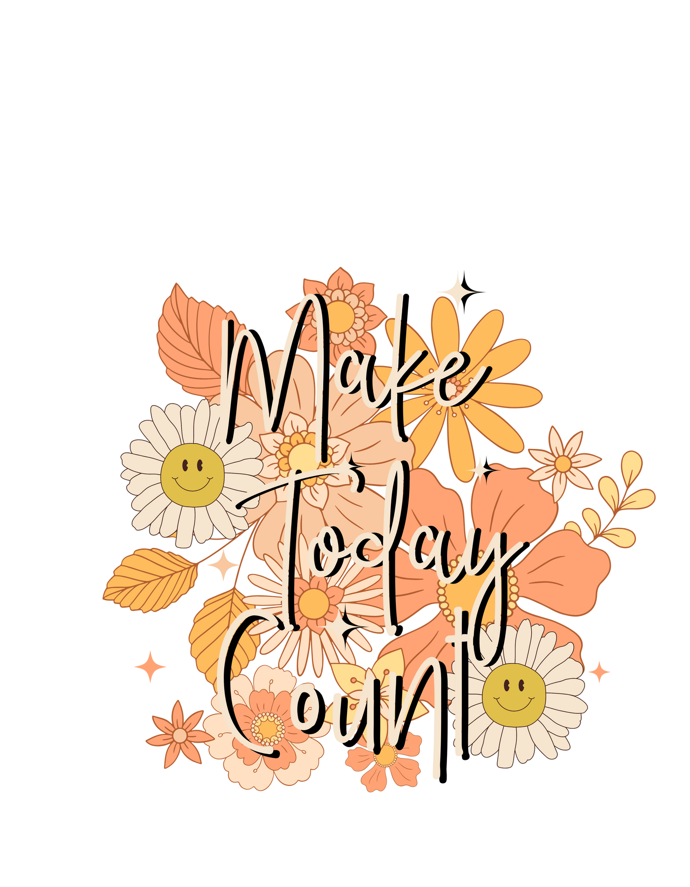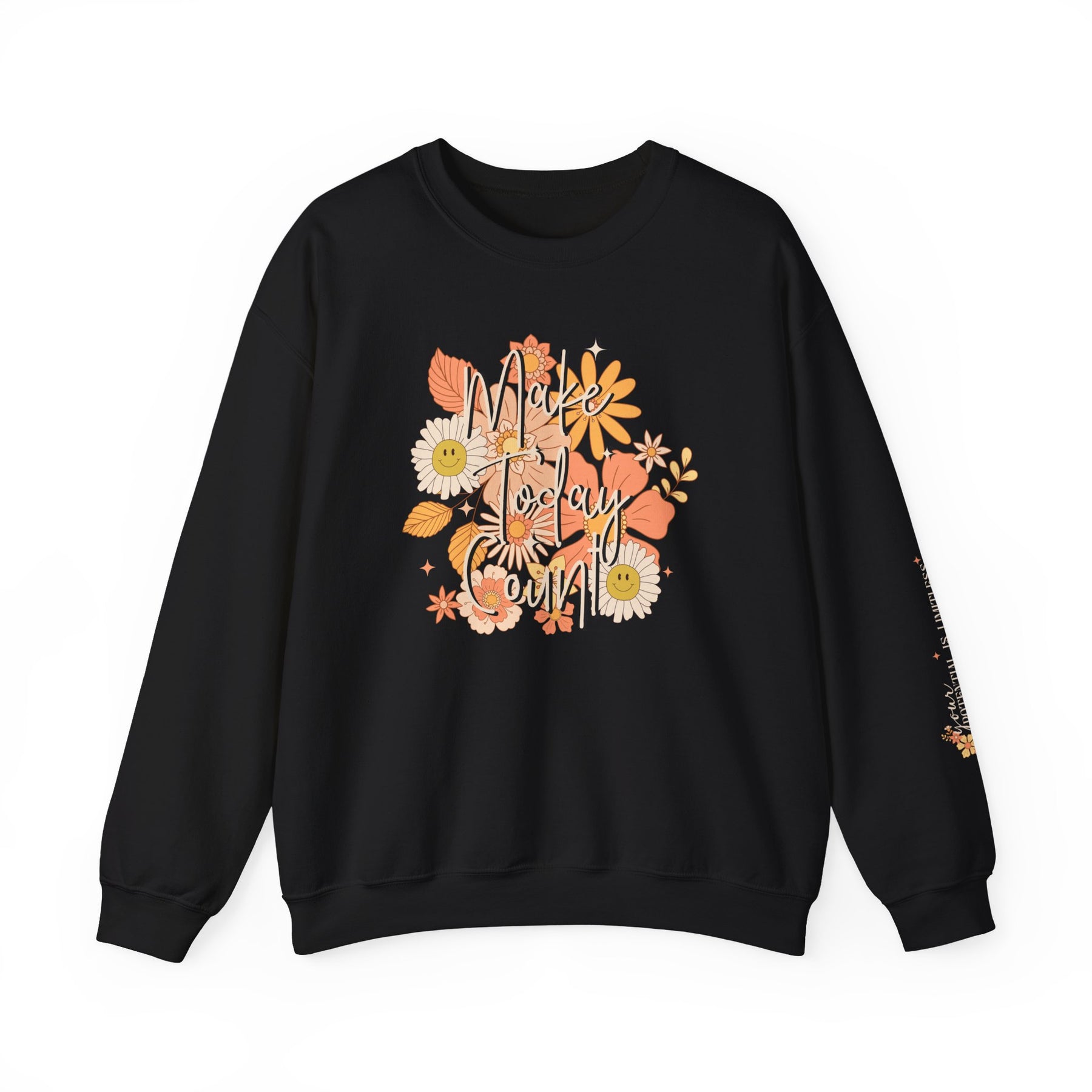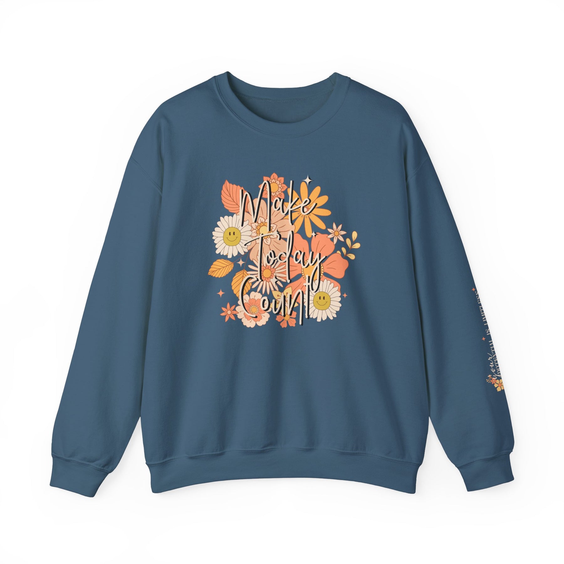 A comfortable unisex heavy blend crewneck sweatshirt, the Make Today Count Crew, features a flower design. 50% cotton, 50% polyester, ribbed knit collar, loose fit, medium-heavy fabric. Ideal for everyday wear.