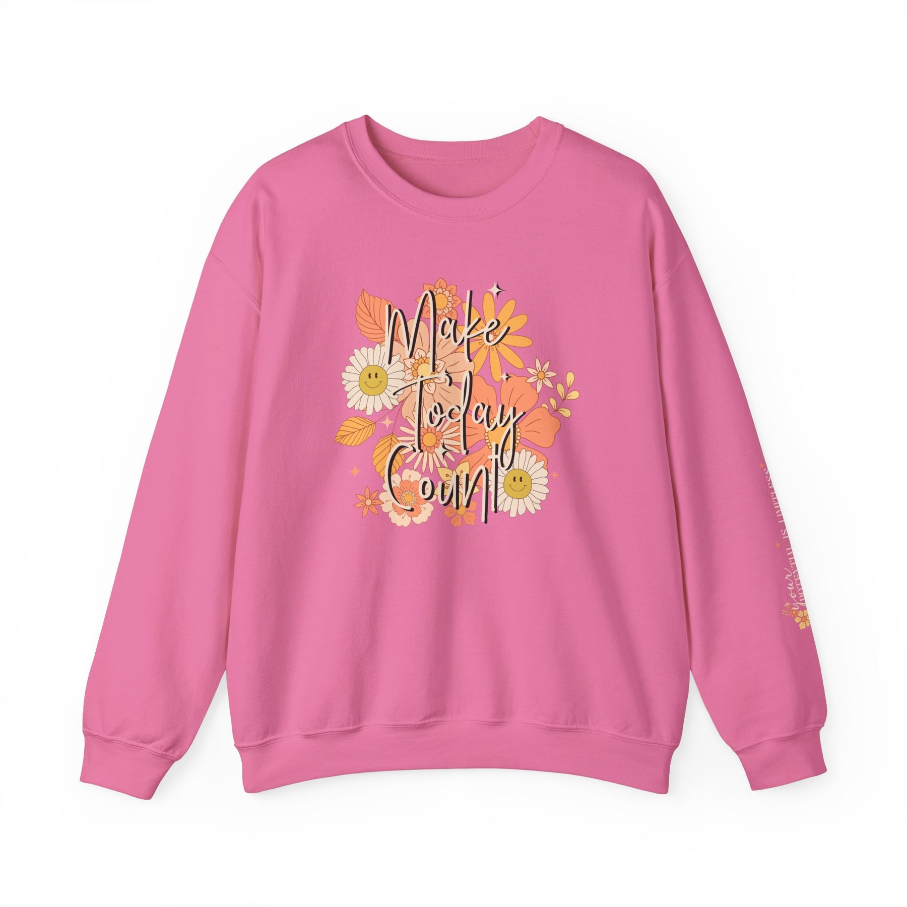 A pink sweatshirt with floral design, the Make Today Count Crew, a comfy unisex blend of polyester and cotton. Ribbed knit collar, no itchy seams, loose fit, medium-heavy fabric. Ideal for all occasions.