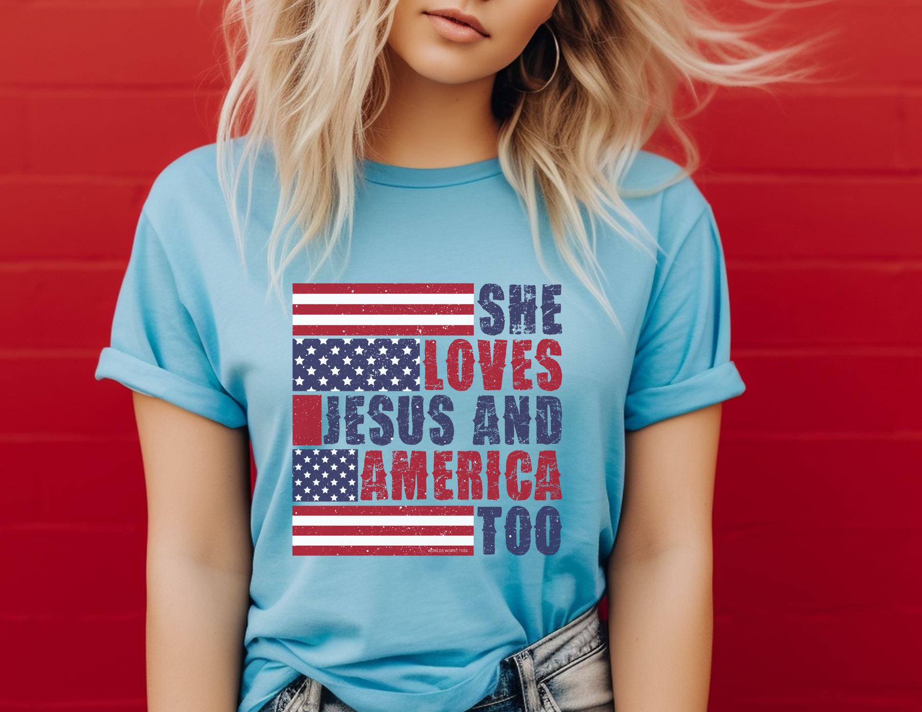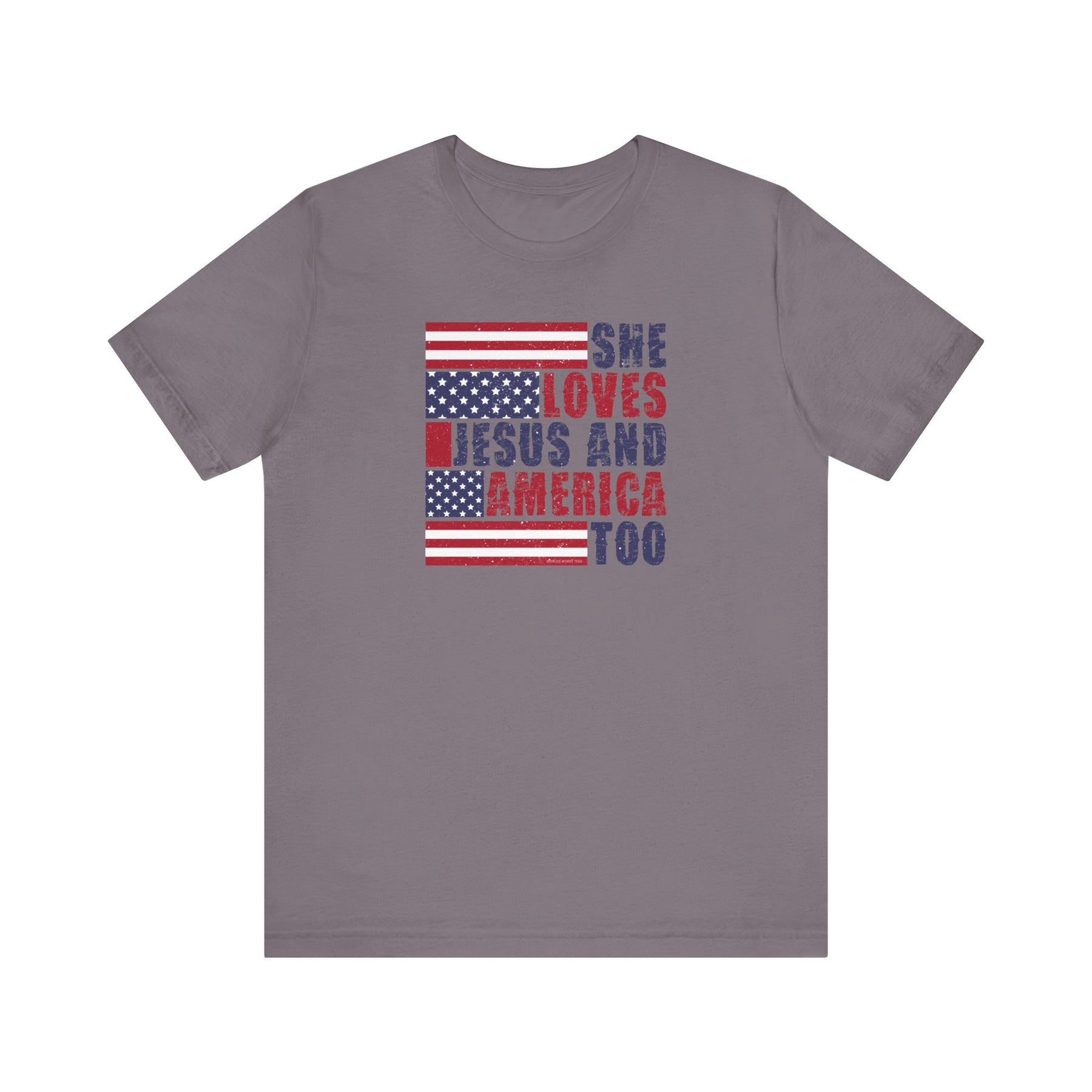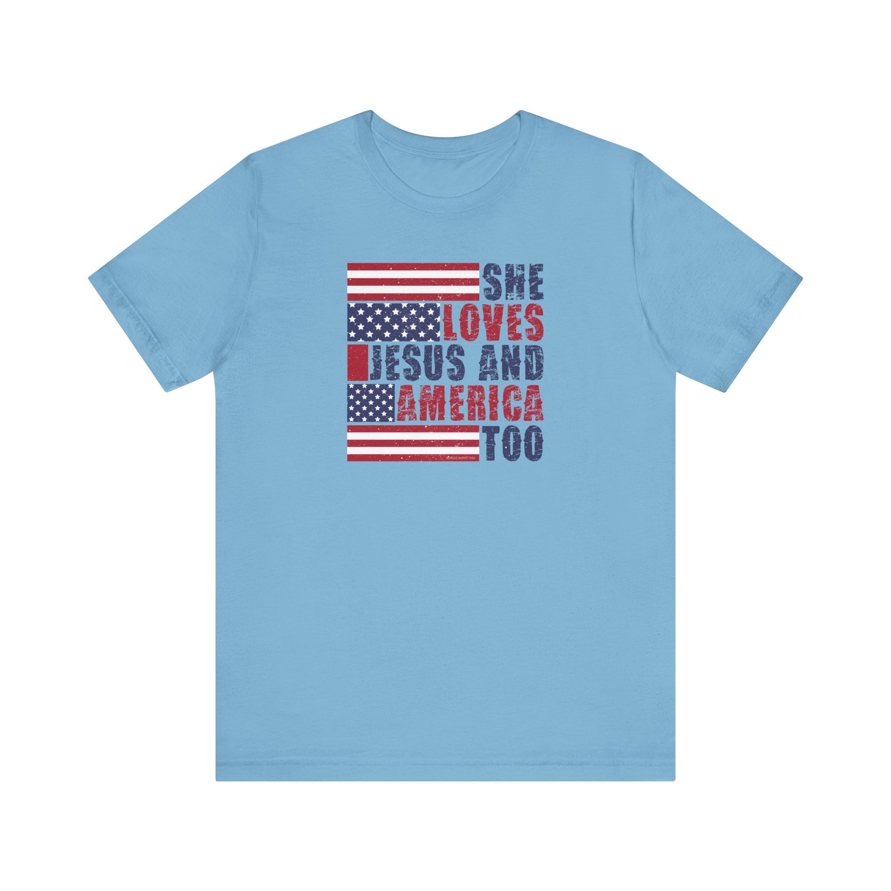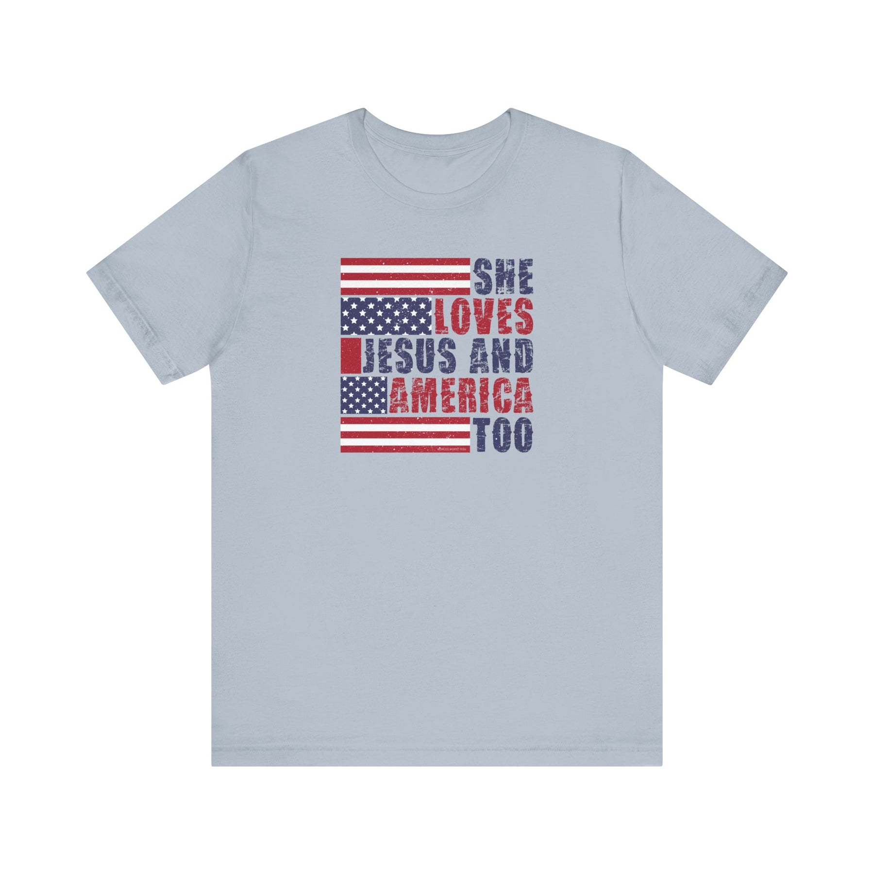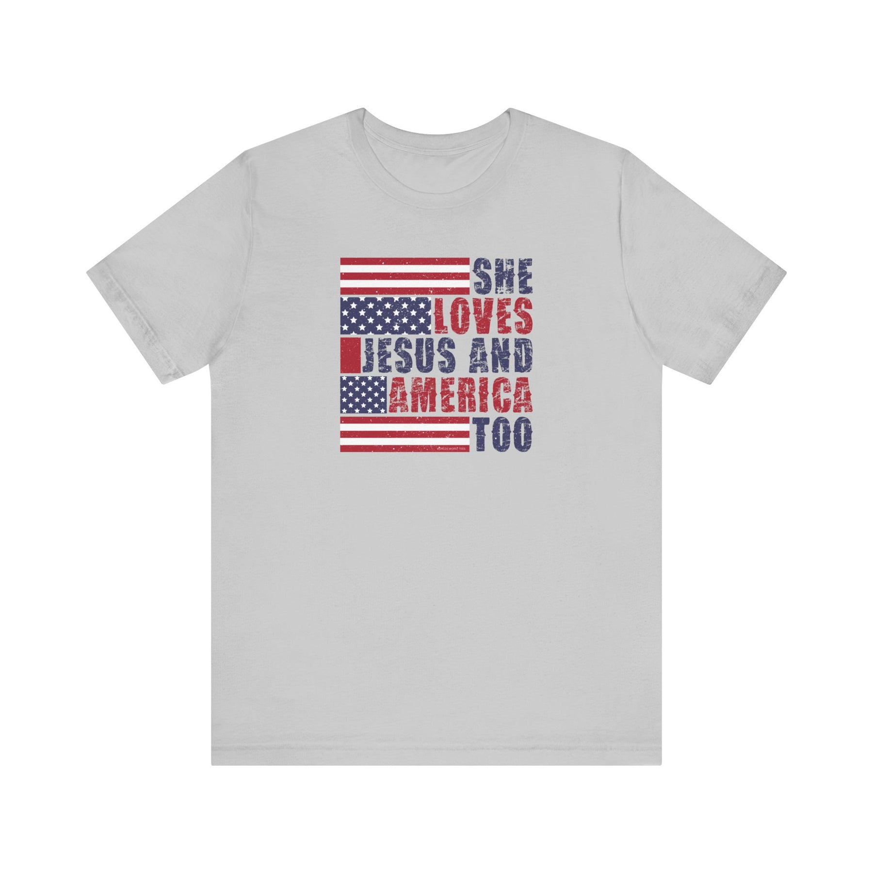 A unisex jersey tee featuring She Loves Jesus and America text. Made of 100% cotton, light fabric, ribbed knit collars, and tear-away label. Retail fit with dual side seams for shape retention.