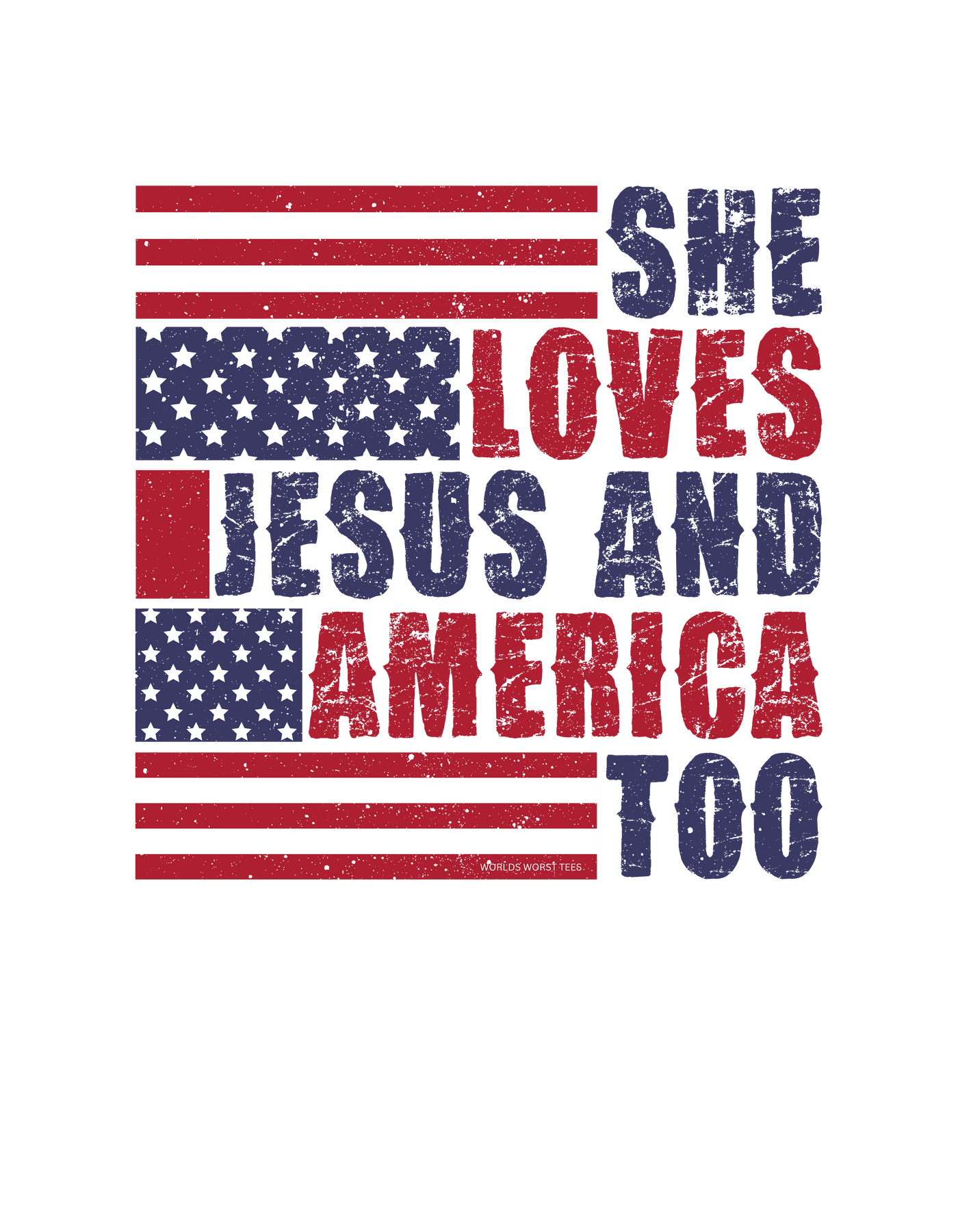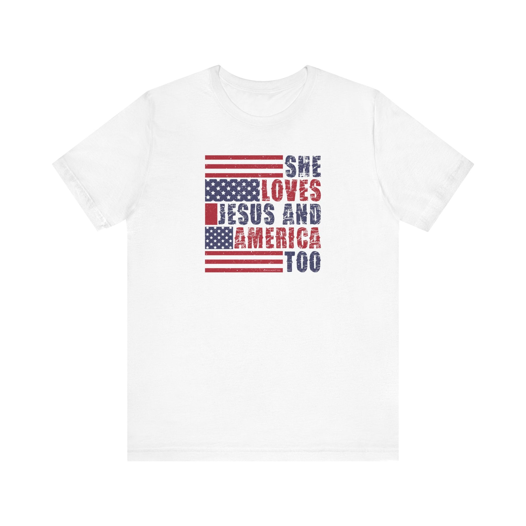 A beloved She Loves Jesus and America Tee, a white shirt with red and blue text. Unisex jersey tee with ribbed knit collars, taping on shoulders, and tear-away label. 100% Airlume combed cotton, retail fit.