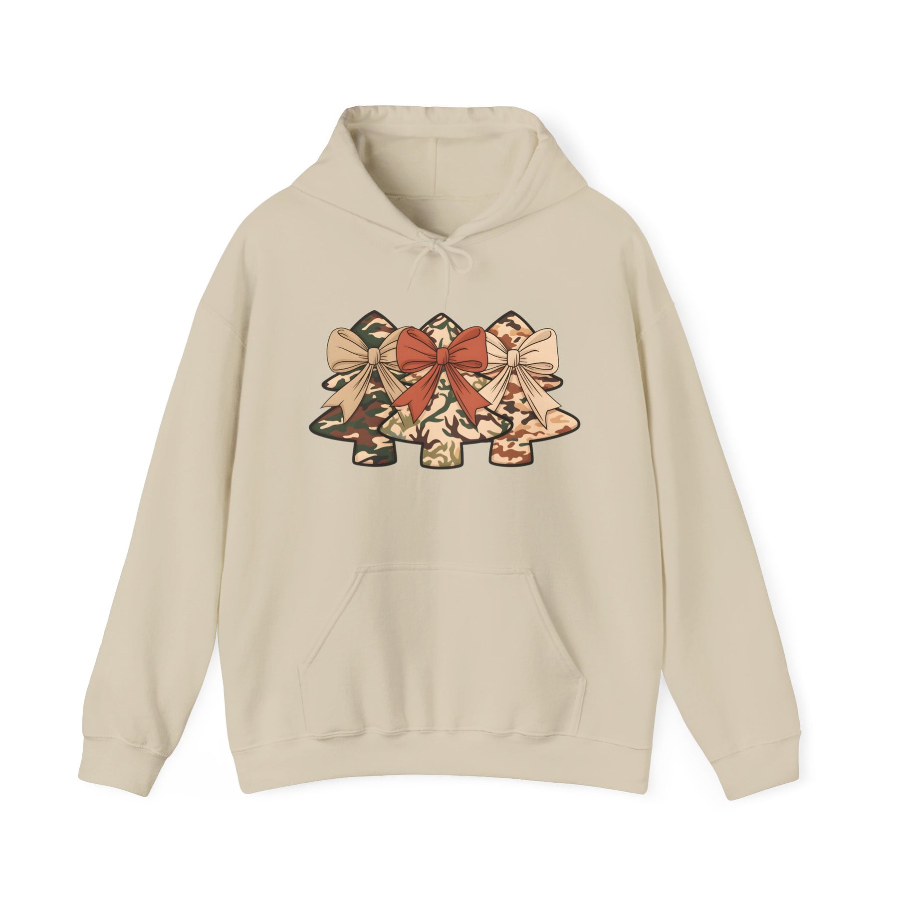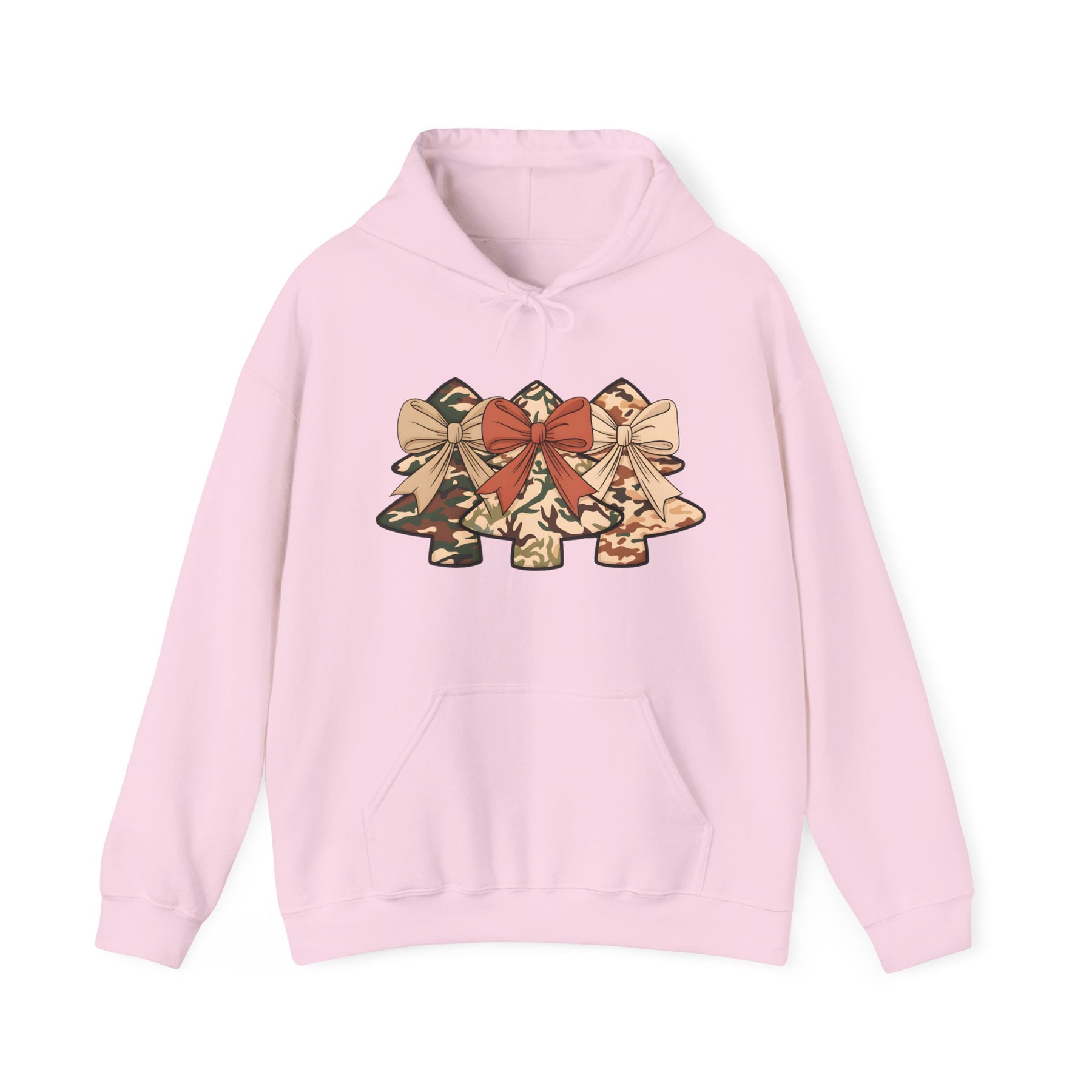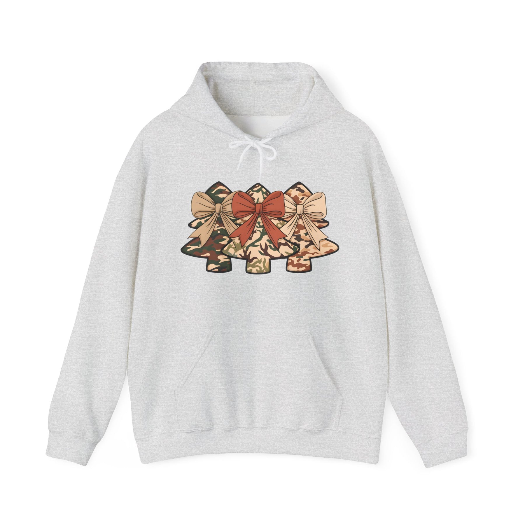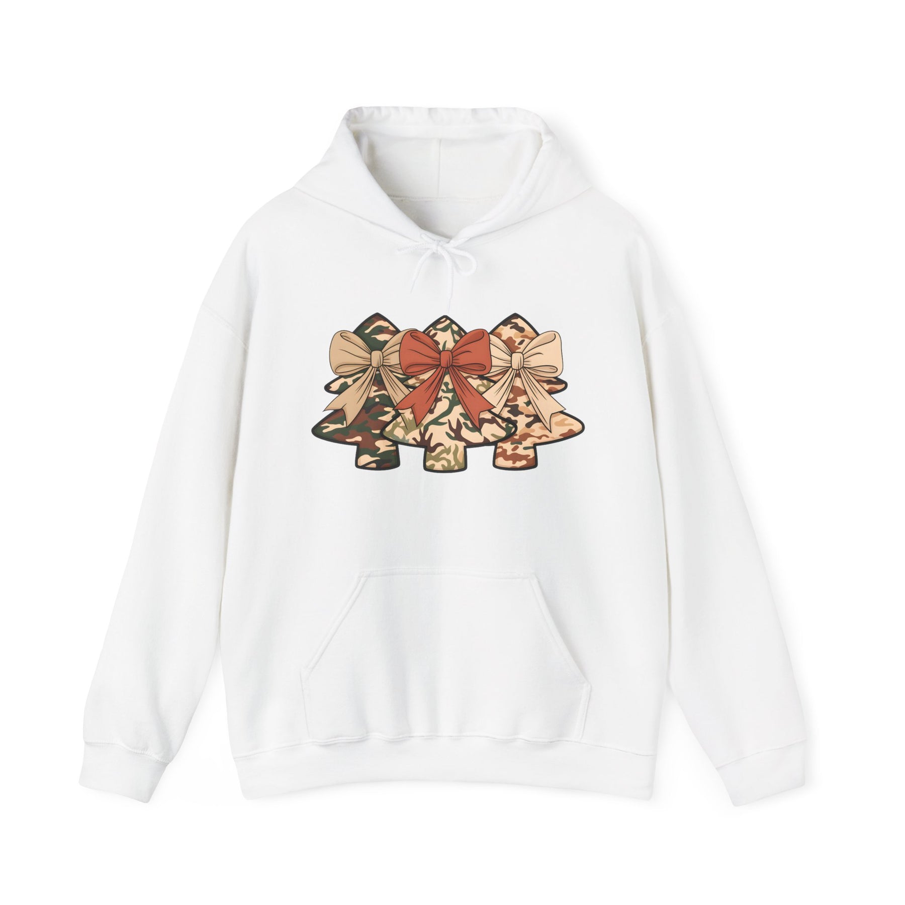 Camo Christmas Tree Hoodie featuring festive camo-patterned trees with bows, on a plush cotton-poly blend, classic fit, with kangaroo pocket and matching drawstring.