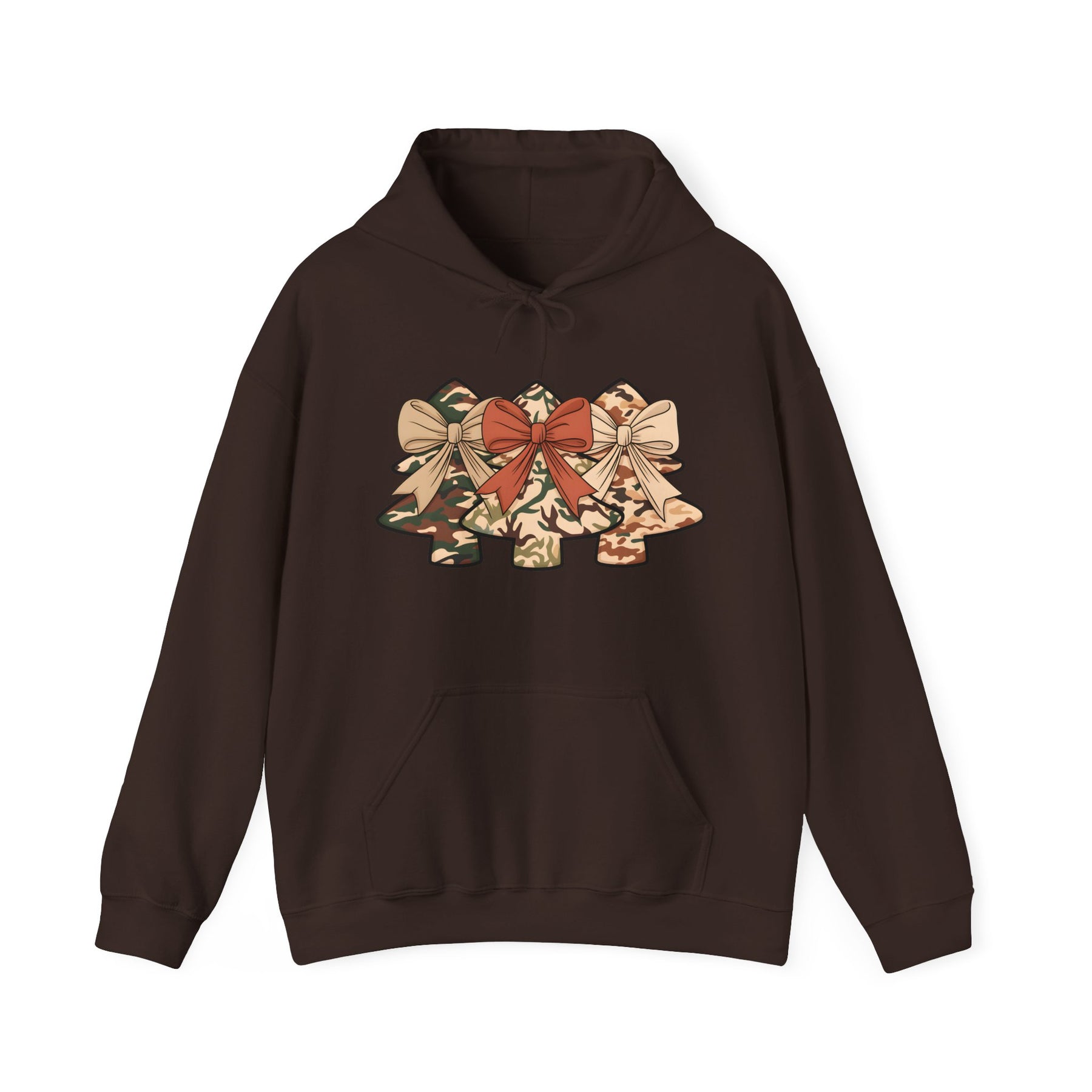 Camo Christmas Tree Hoodie with three camo-patterned trees and festive bows on the chest, featuring a kangaroo pocket and drawstring hood for a cozy fit.