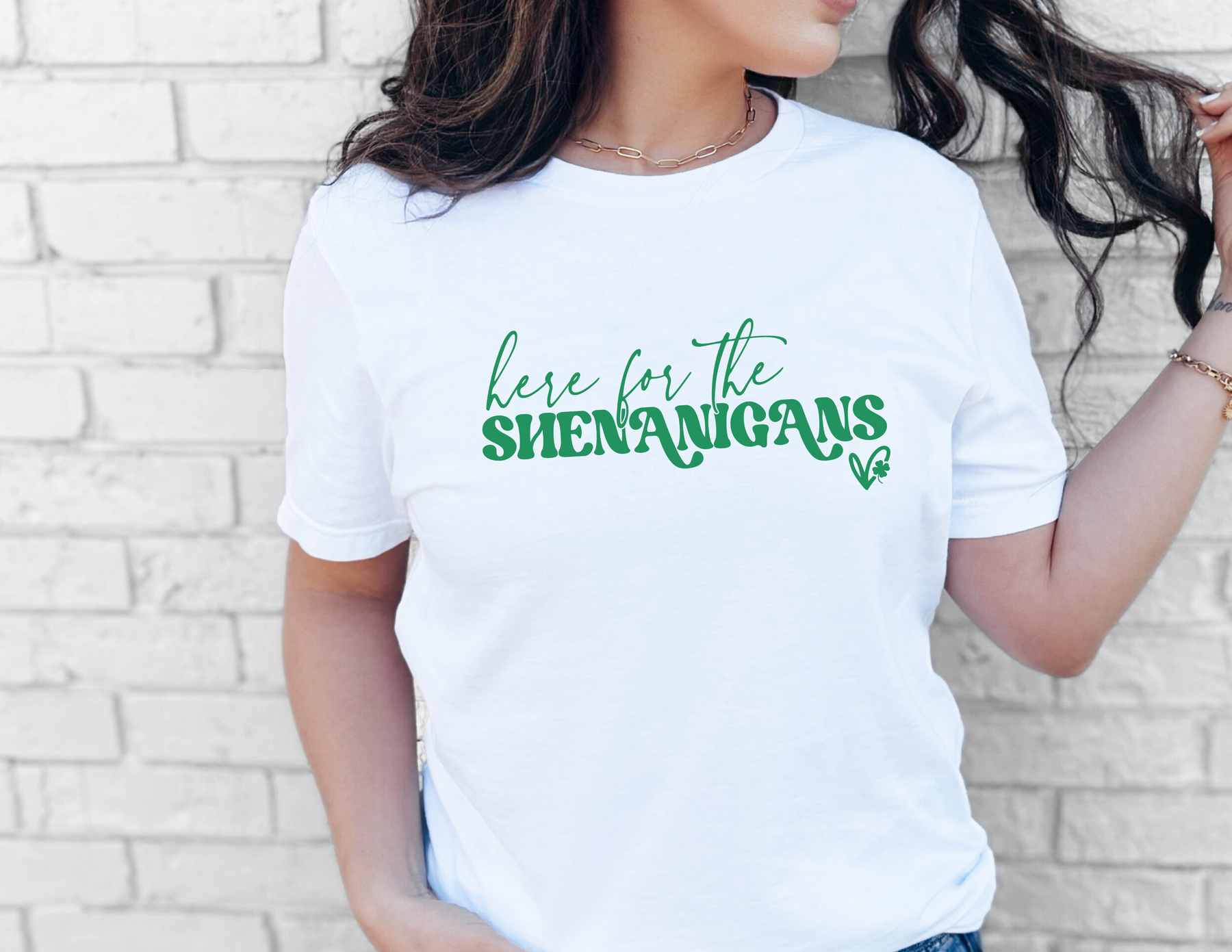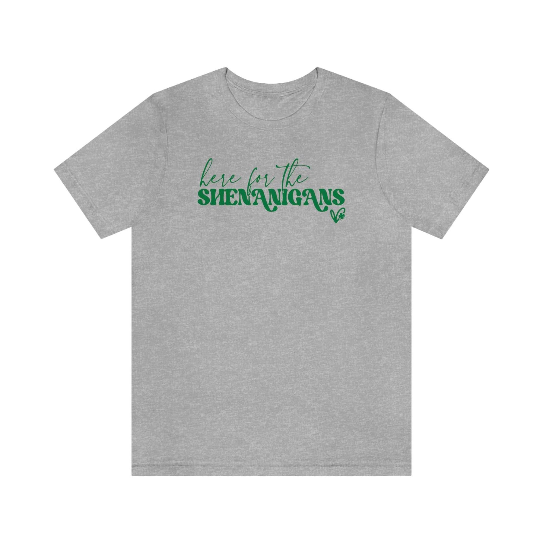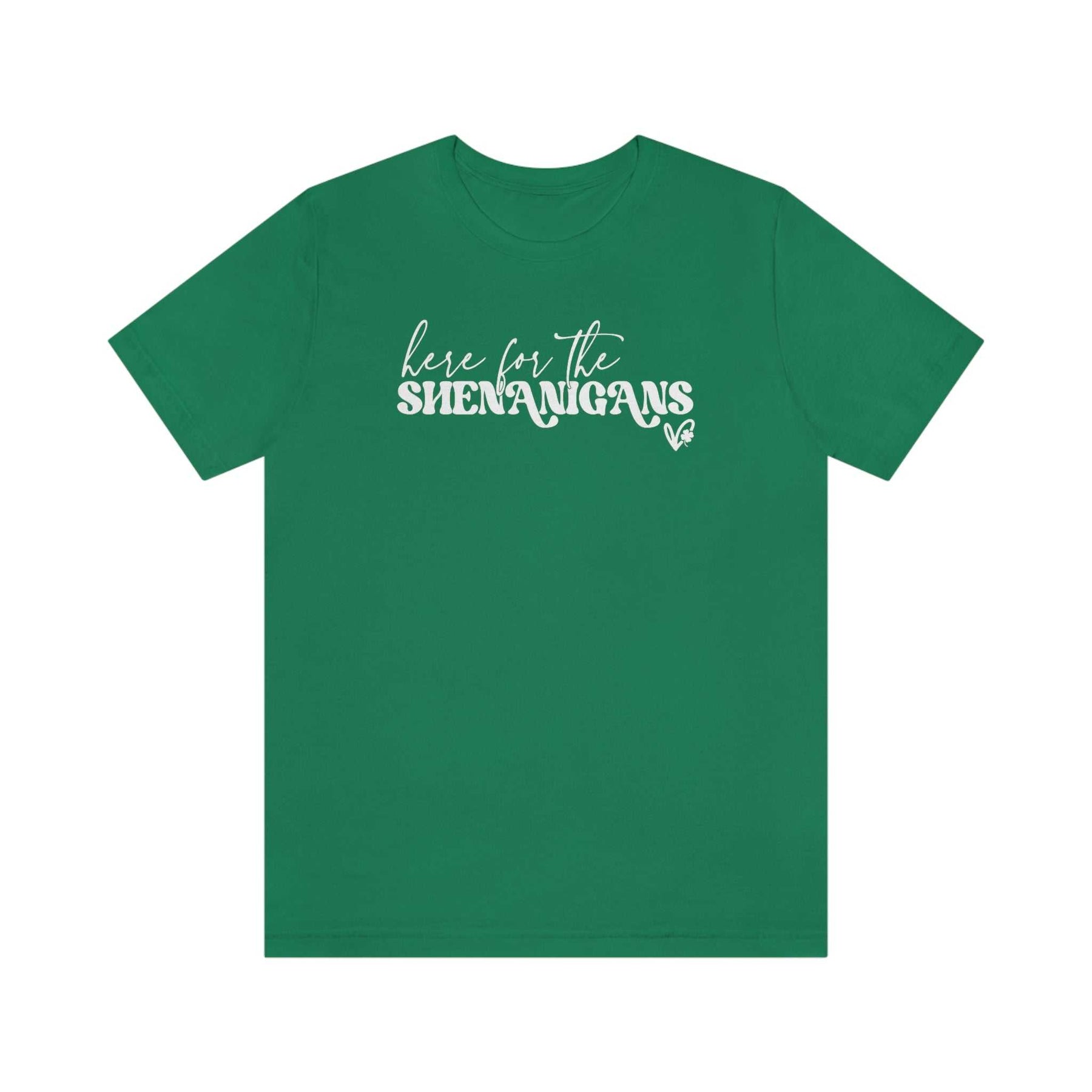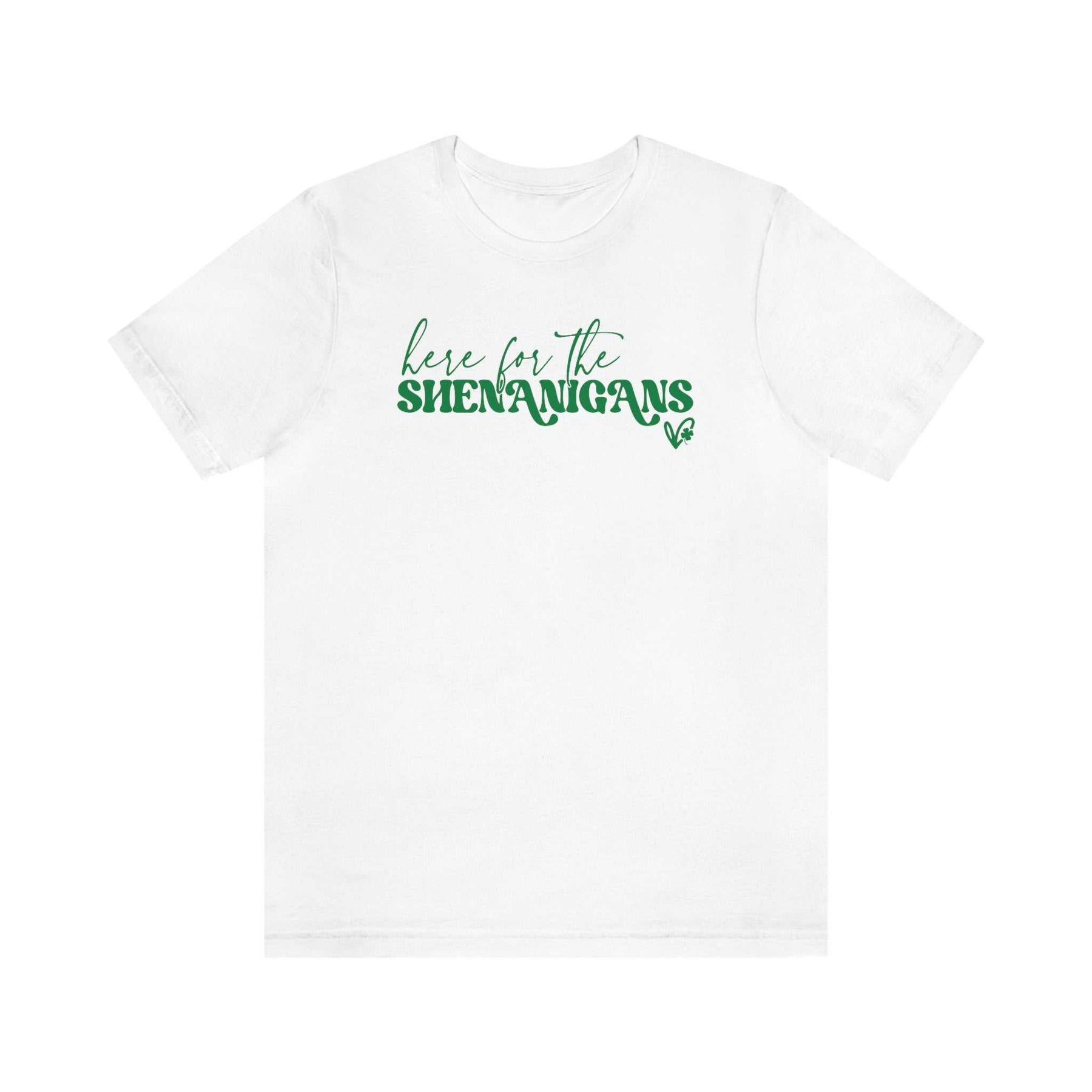 A classic unisex jersey tee featuring the Here for the Shenanigans design. Soft cotton, ribbed collar, and shoulder taping for a comfortable fit. Retail fit, 100% cotton.