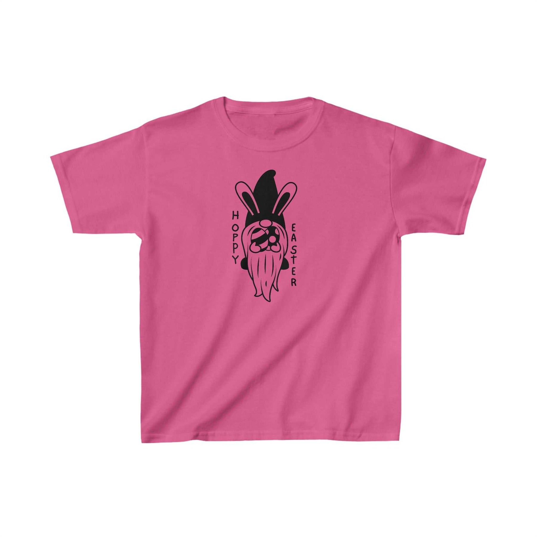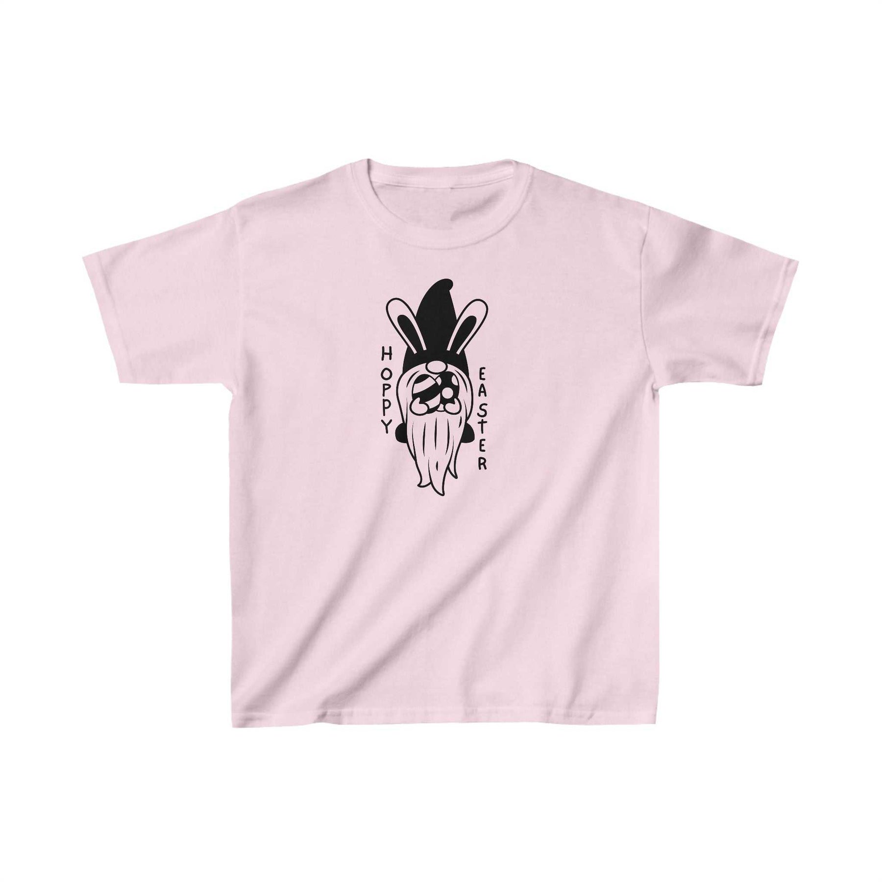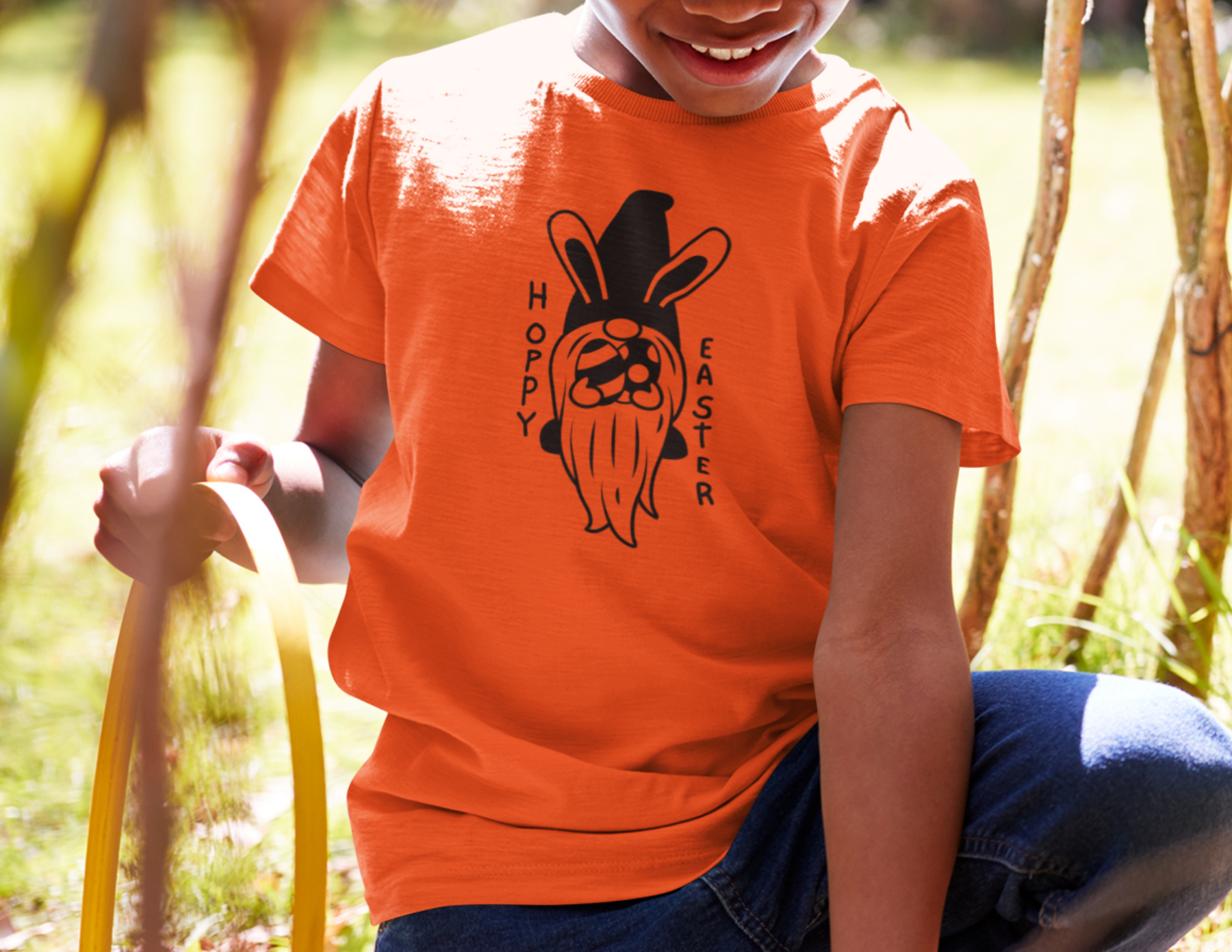 The kids Hoppy Easter Toddler Tee is a heavy cotton tee is perfect for everyday use. The fabric is 100% cotton for solid colors. Polyester is included for heather-color variants. These fabrics are prime materials for printing. The shoulders have twill tape for improved durability. The collar is curl resistant due to ribbed knitting. There are no seams along the sides.