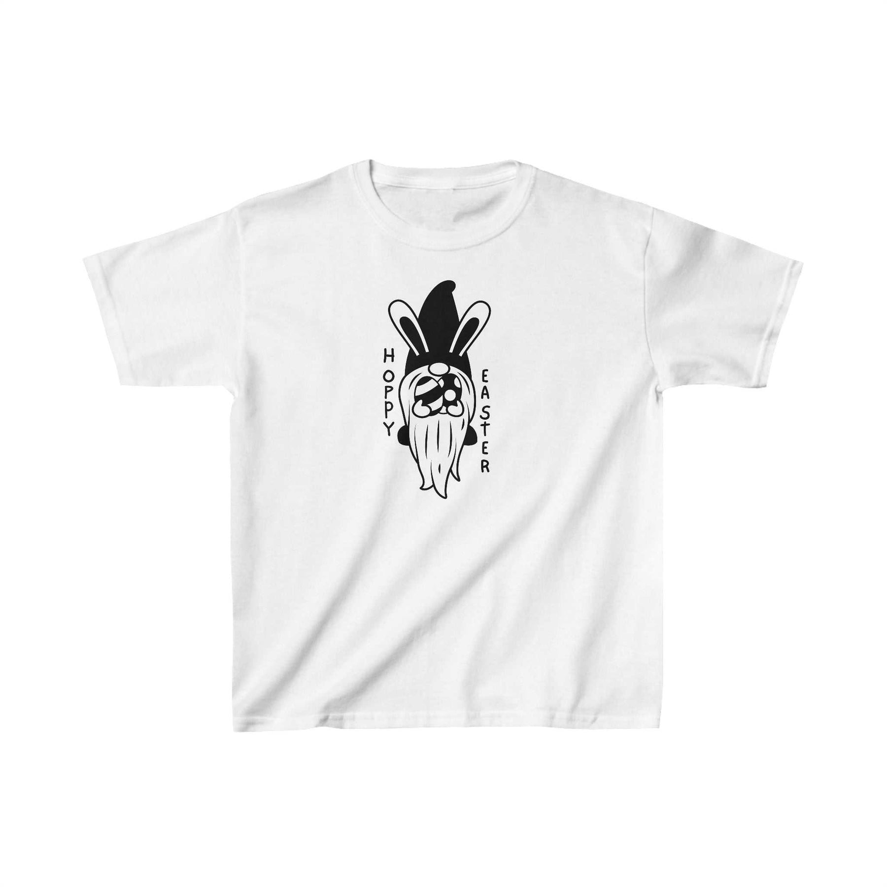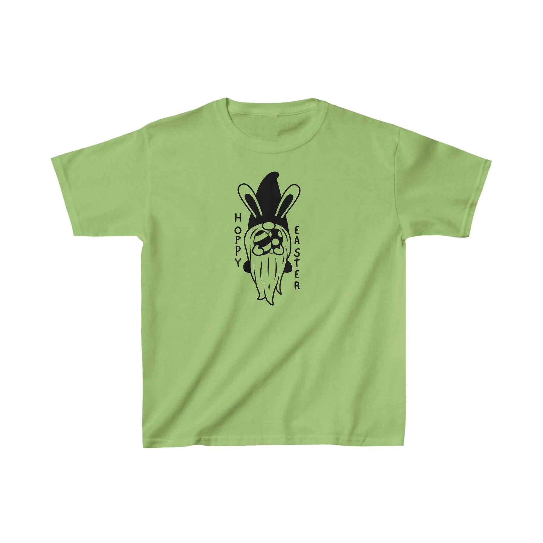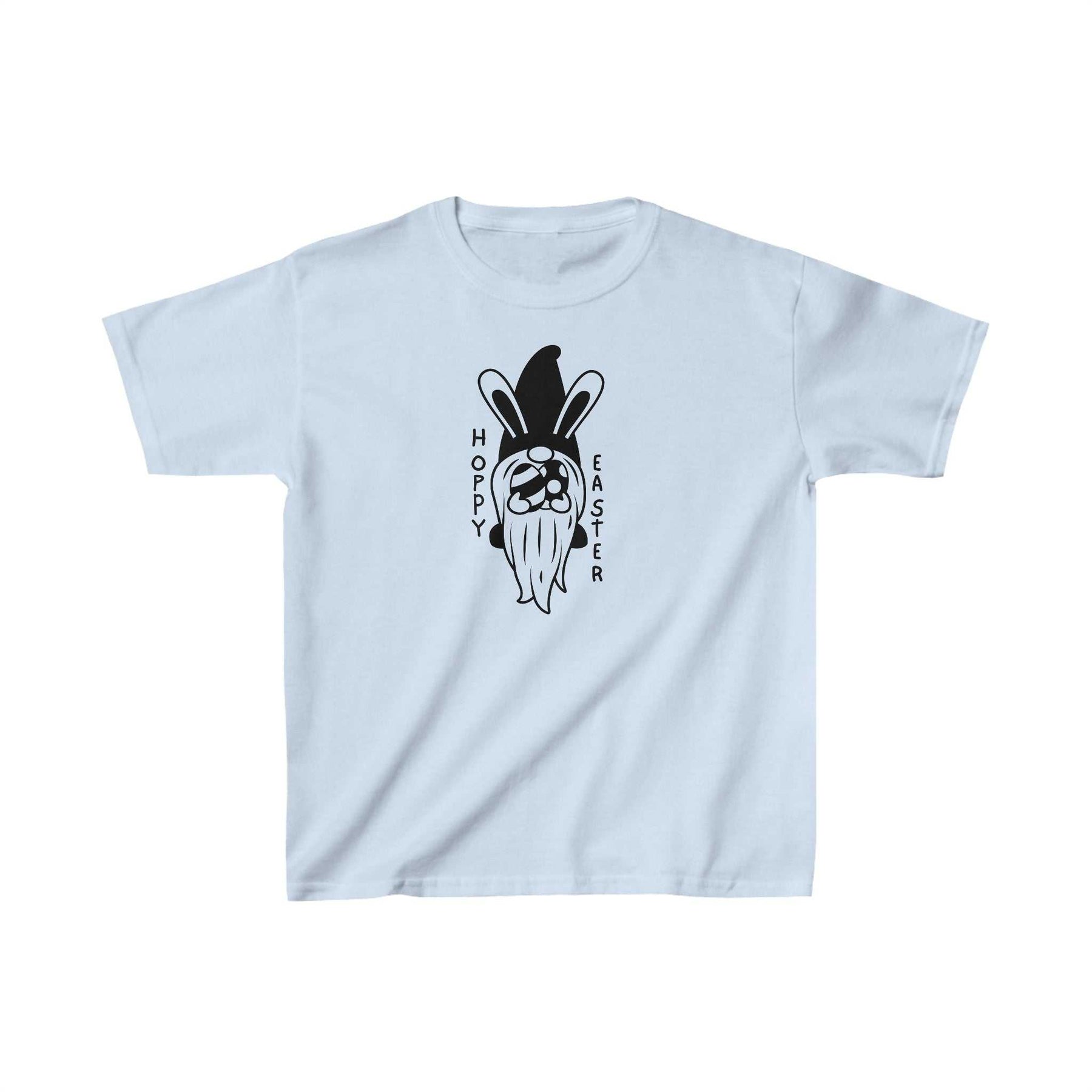 The kids Hoppy Easter Toddler Tee is a heavy cotton tee is perfect for everyday use. The fabric is 100% cotton for solid colors. Polyester is included for heather-color variants. These fabrics are prime materials for printing. The shoulders have twill tape for improved durability. The collar is curl resistant due to ribbed knitting. There are no seams along the sides.