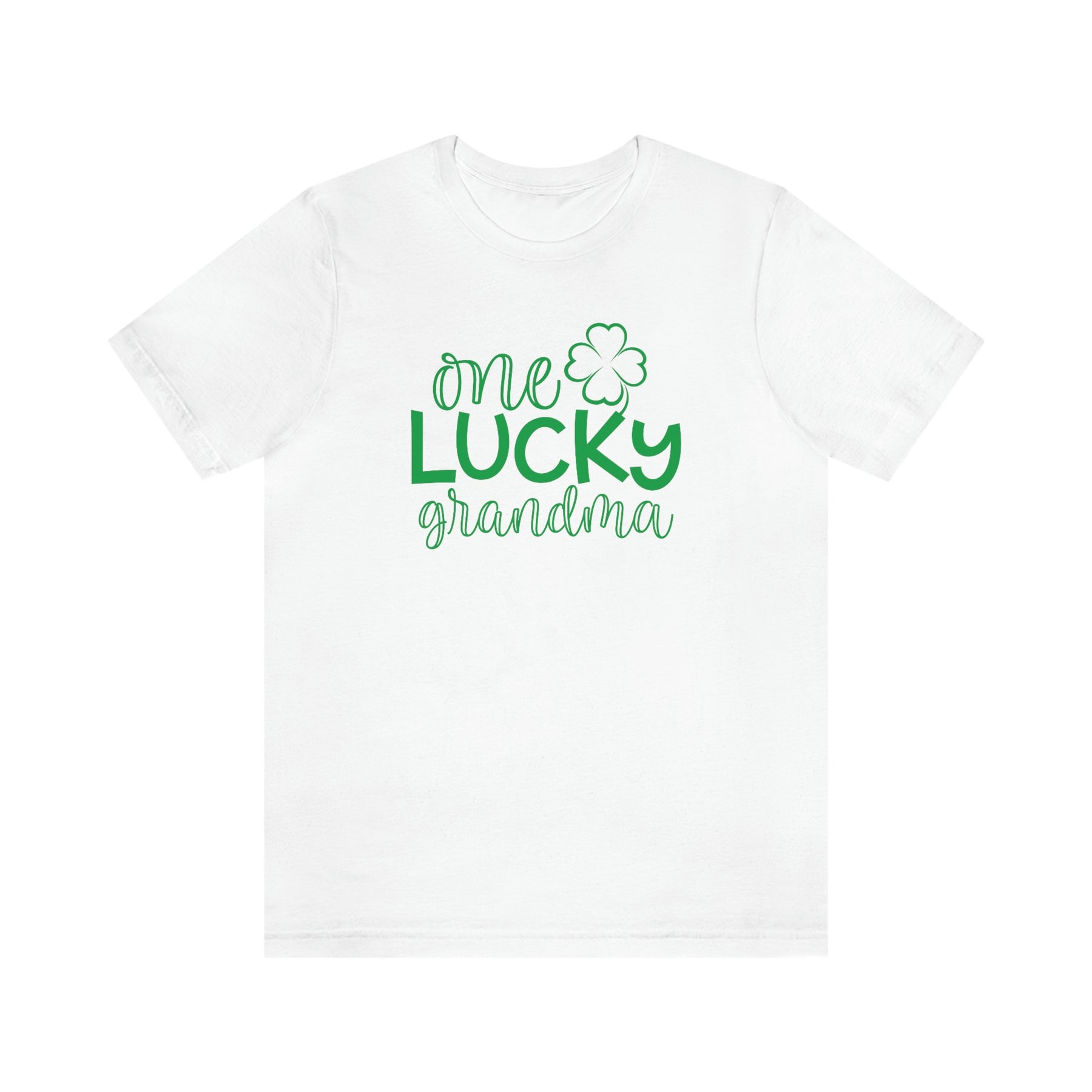 A classic white unisex tee with green text, featuring a four-leaf clover design. Made of soft cotton, ribbed knit collars, and shoulder taping for durability. Perfect for lucky grandmas.