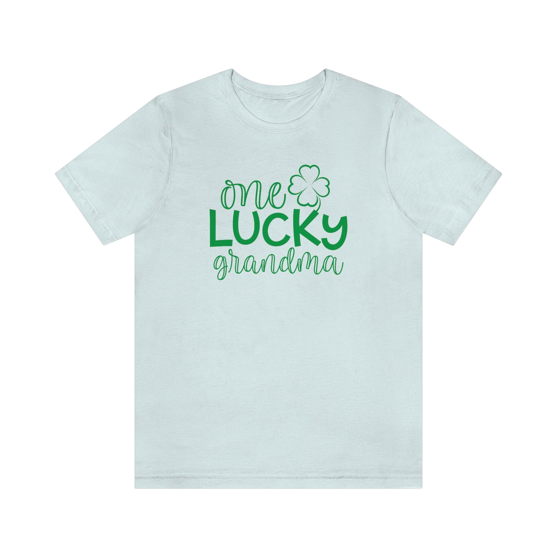 A classic unisex jersey tee featuring One Lucky Grandma text. Soft cotton, ribbed knit collars, and shoulder taping for durability. Retail fit, 100% cotton, light fabric. Sizes XS to 3XL.