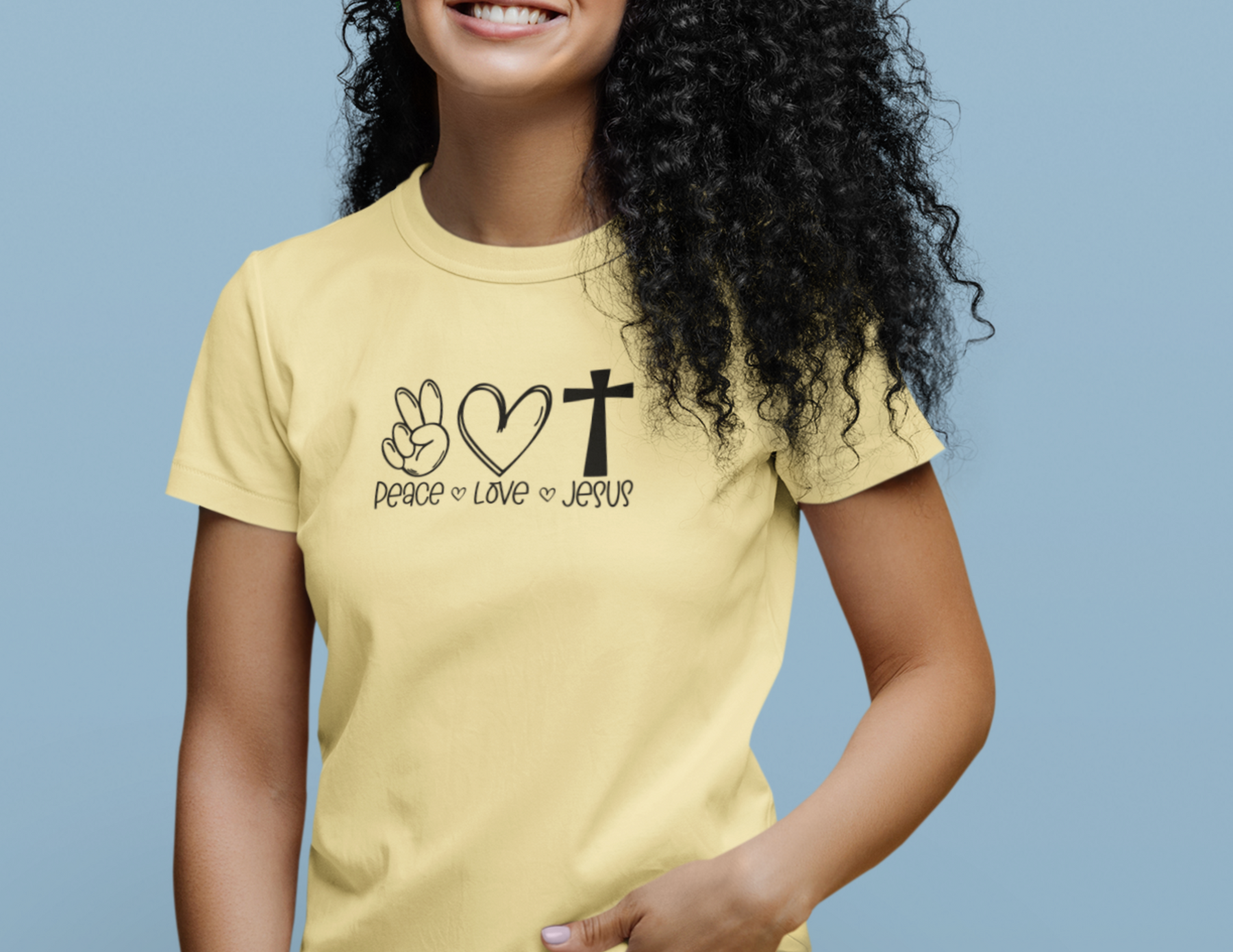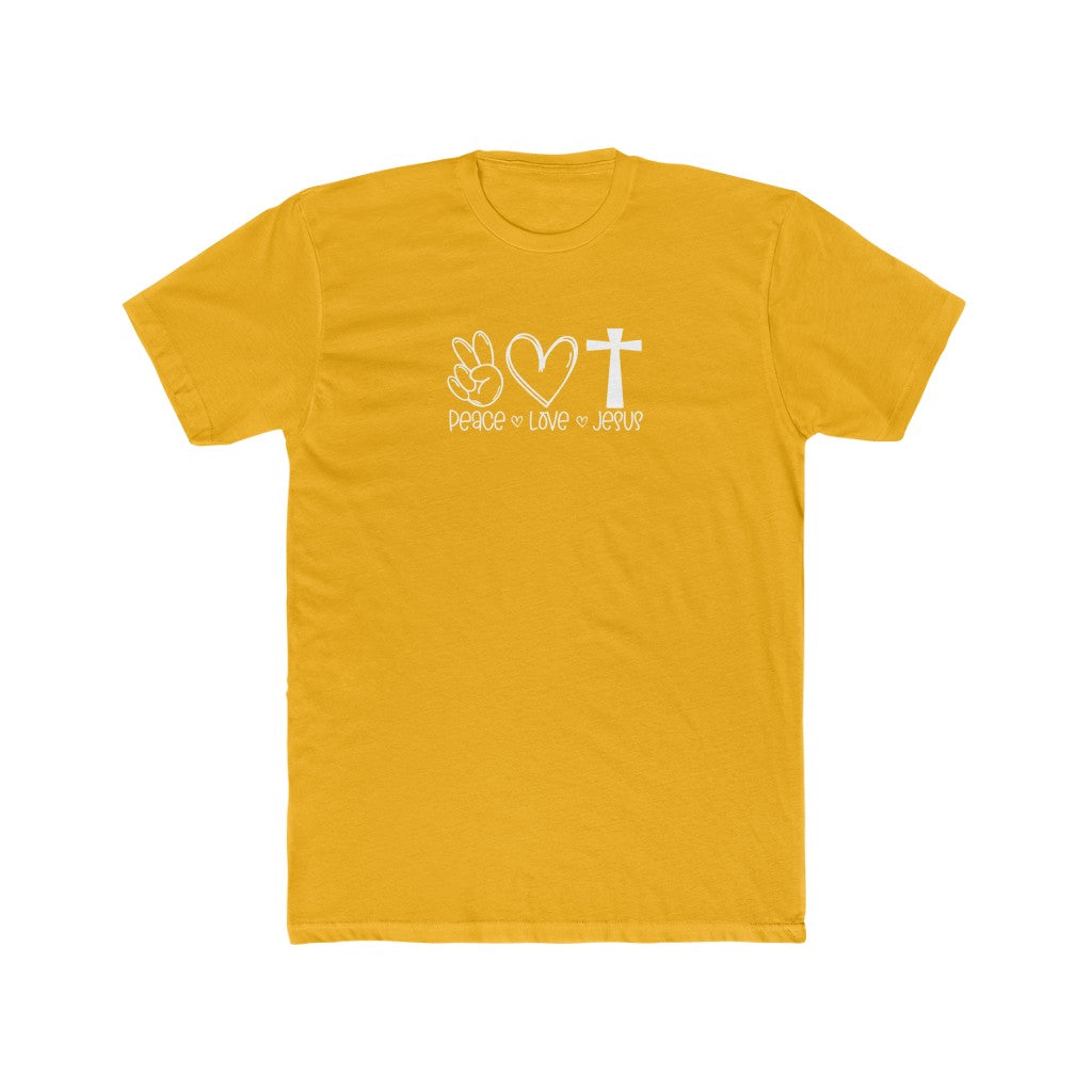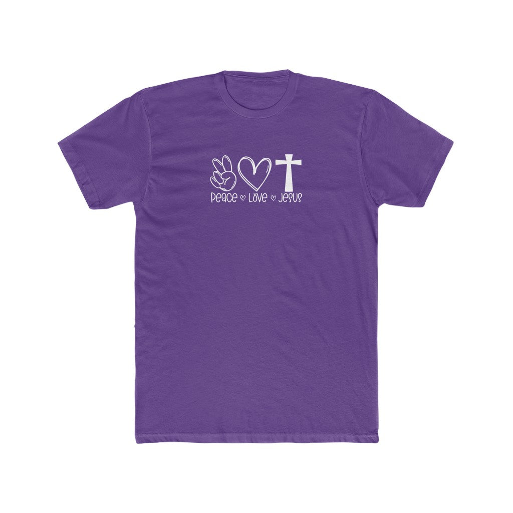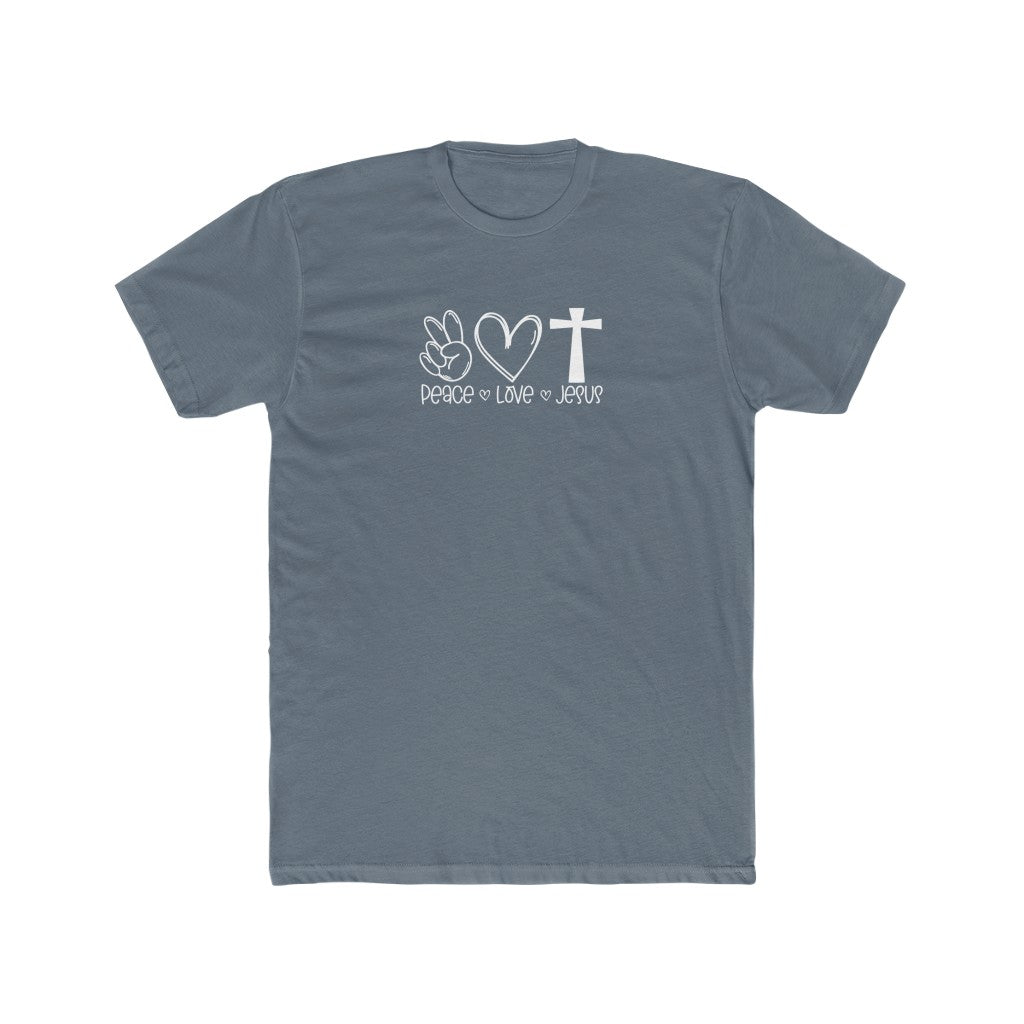This premium Peace Love Jesus Tee is a classic choice that is both comfy and light. The high quality material adds a statement to one’s workout or everyday routine. Ribbed knit makes the collar highly elastic and helps retain its shape. Side seams help hold the garment's shape longer and give it structural support. Roomy and comfortable. Solid colo rs are 100% cotton, heather colors are 90% cotton, 10% polyester.
