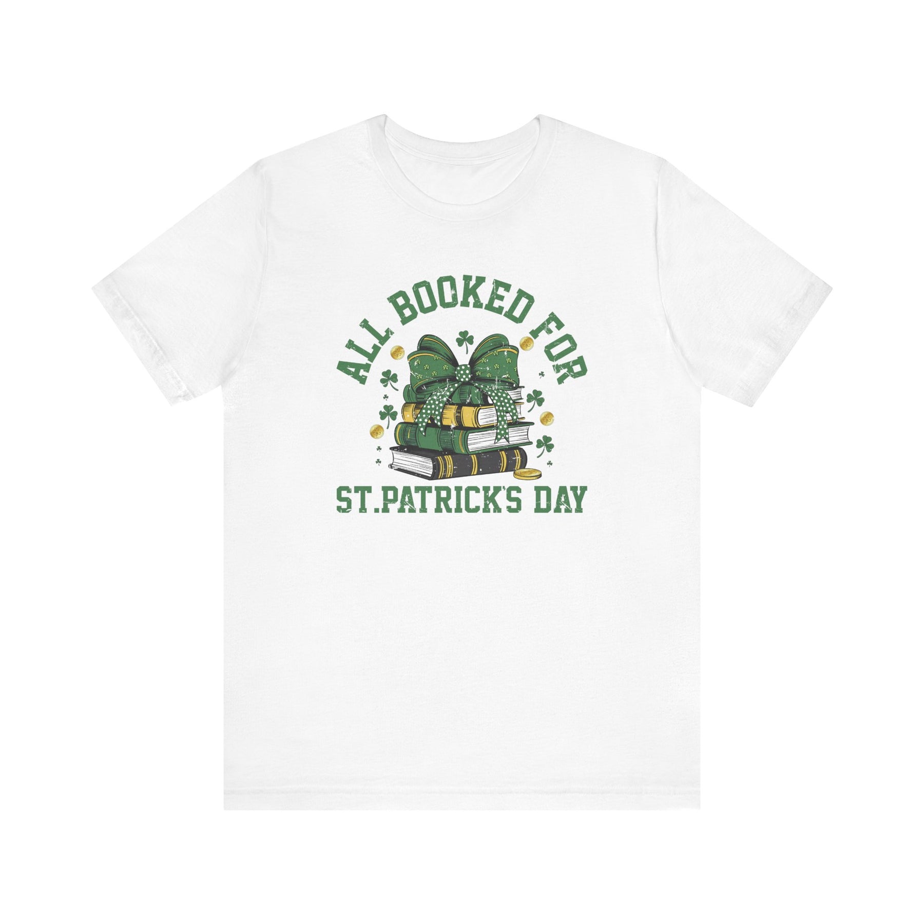 Booked for St. Patrick's Day Tee: A white t-shirt featuring green text and graphics, perfect for festive occasions. Made from soft cotton for comfort and durability.