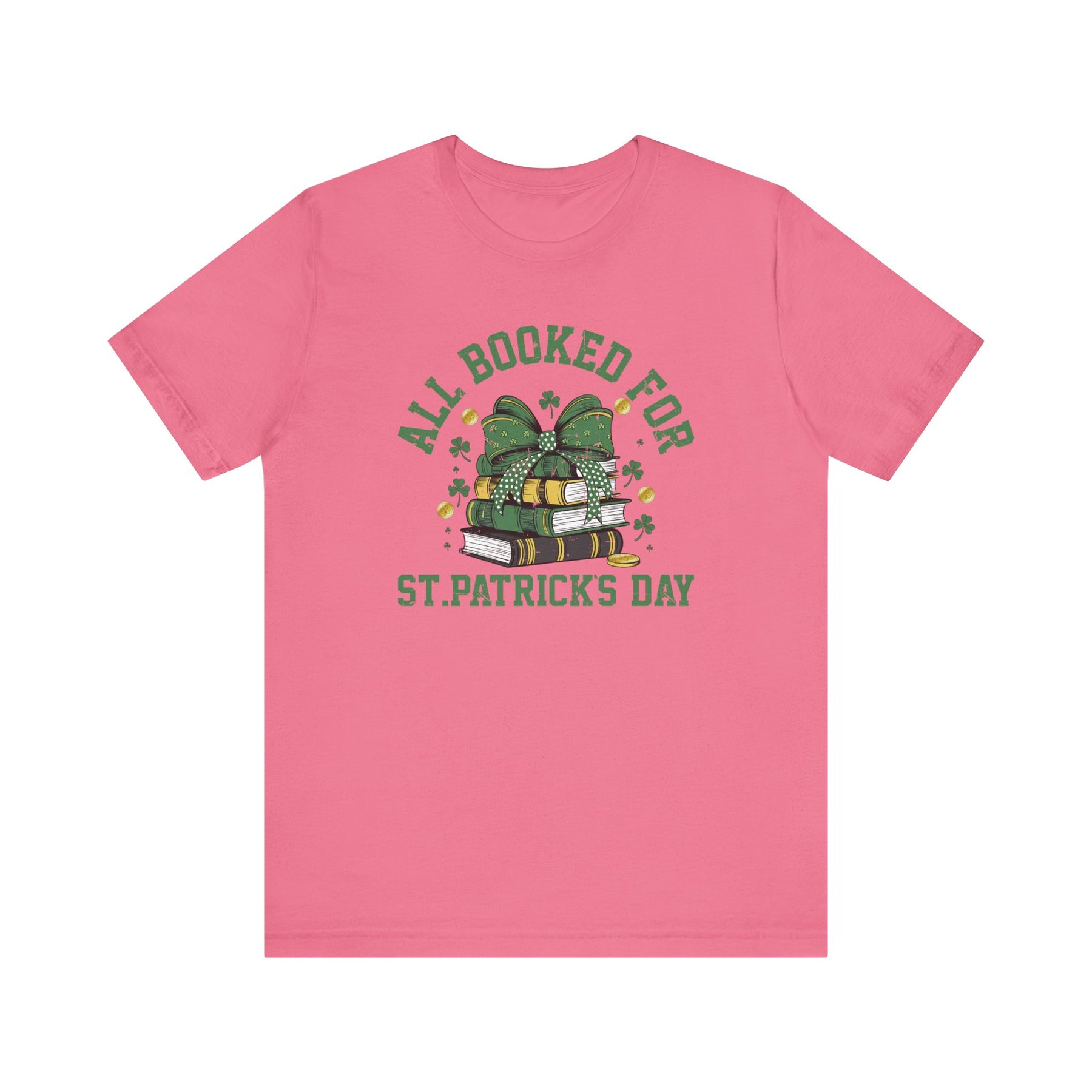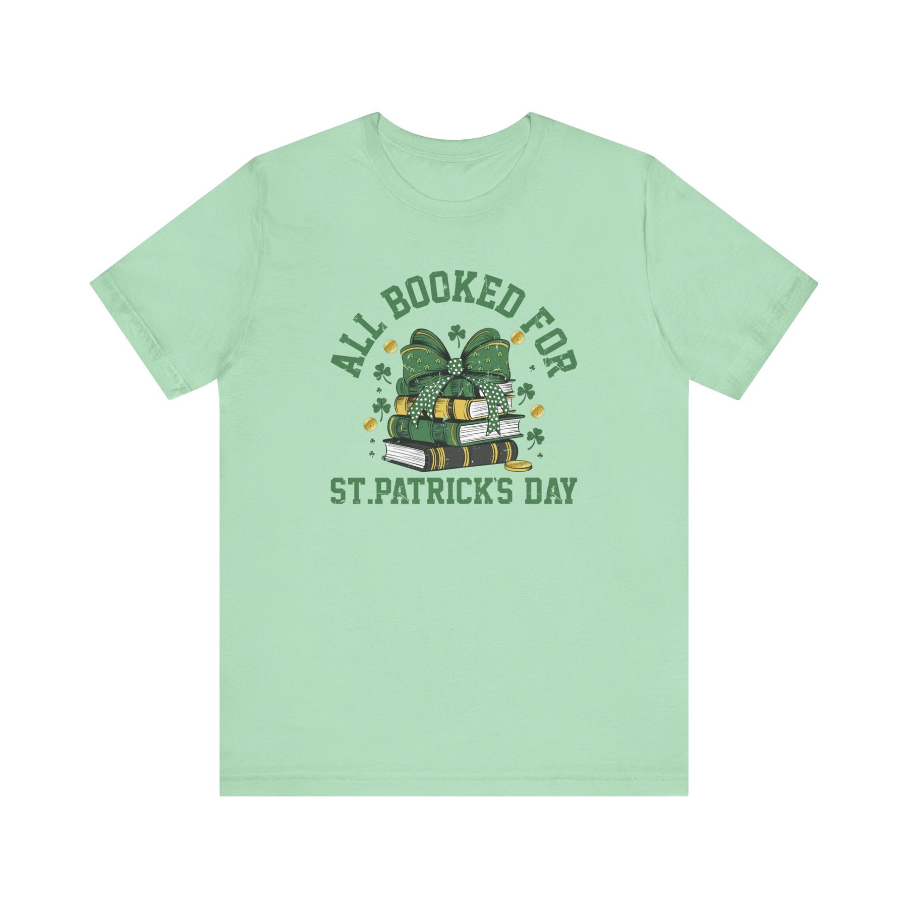 Booked for St. Patrick's Day Tee featuring a green graphic design on a soft, unisex short sleeve t-shirt, perfect for festive occasions.