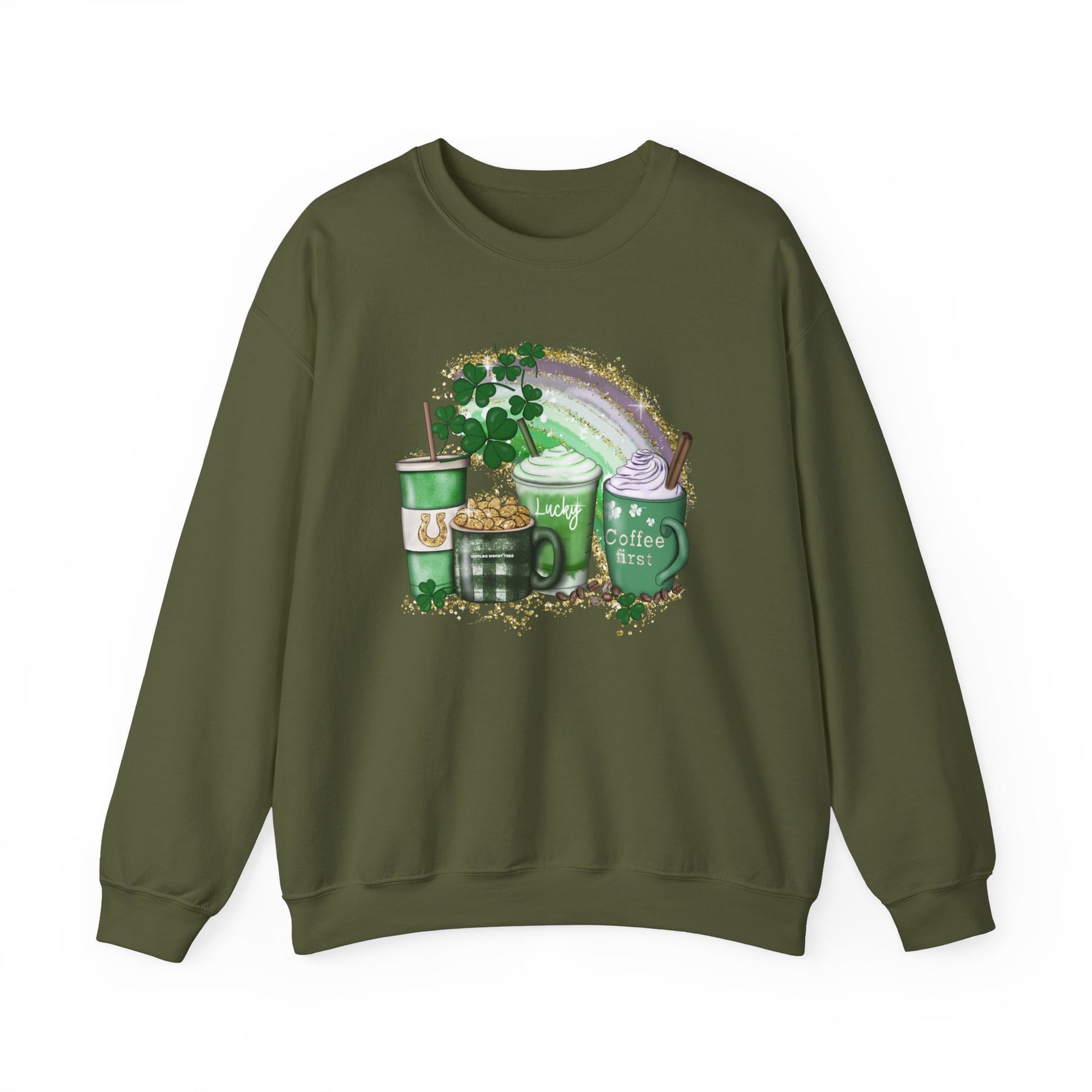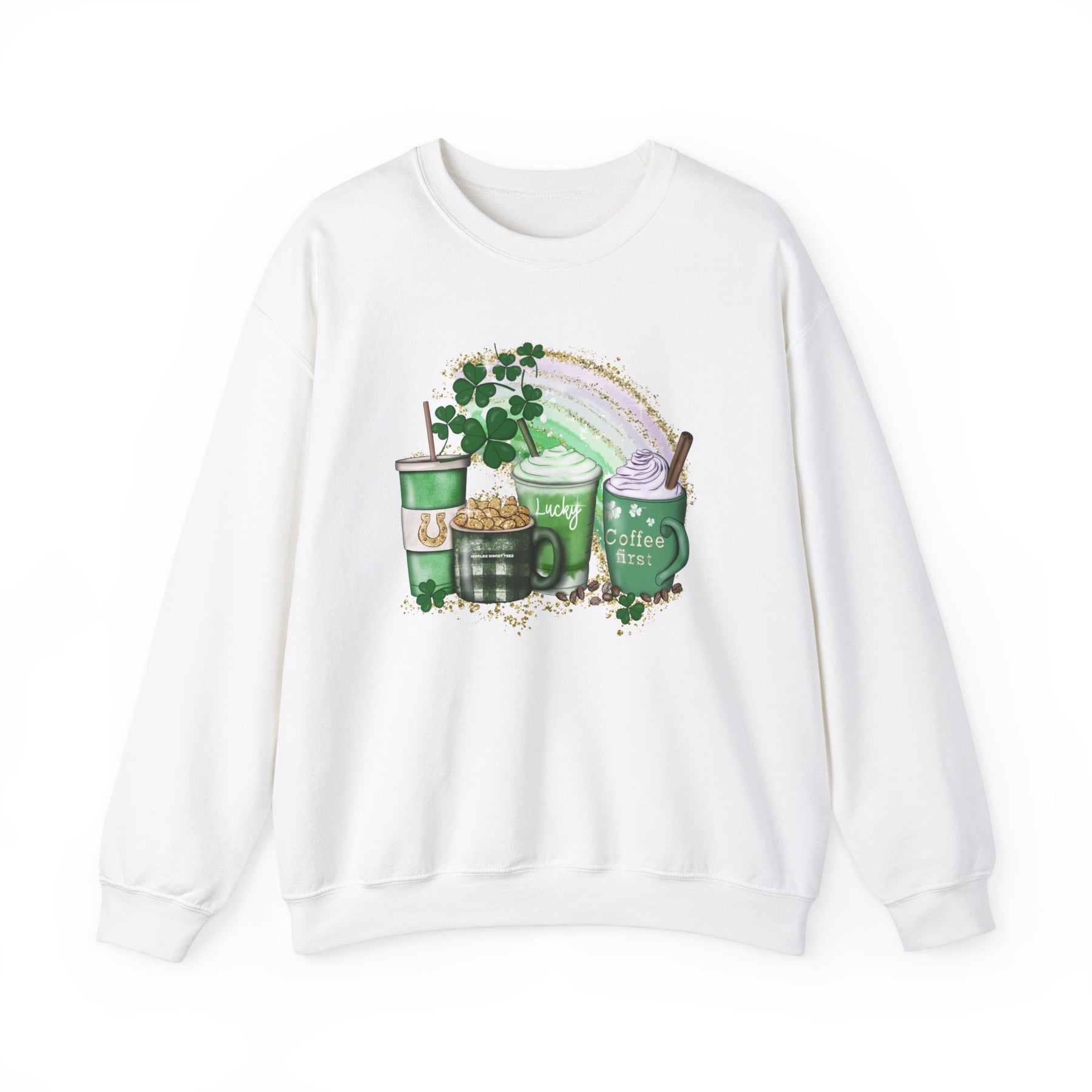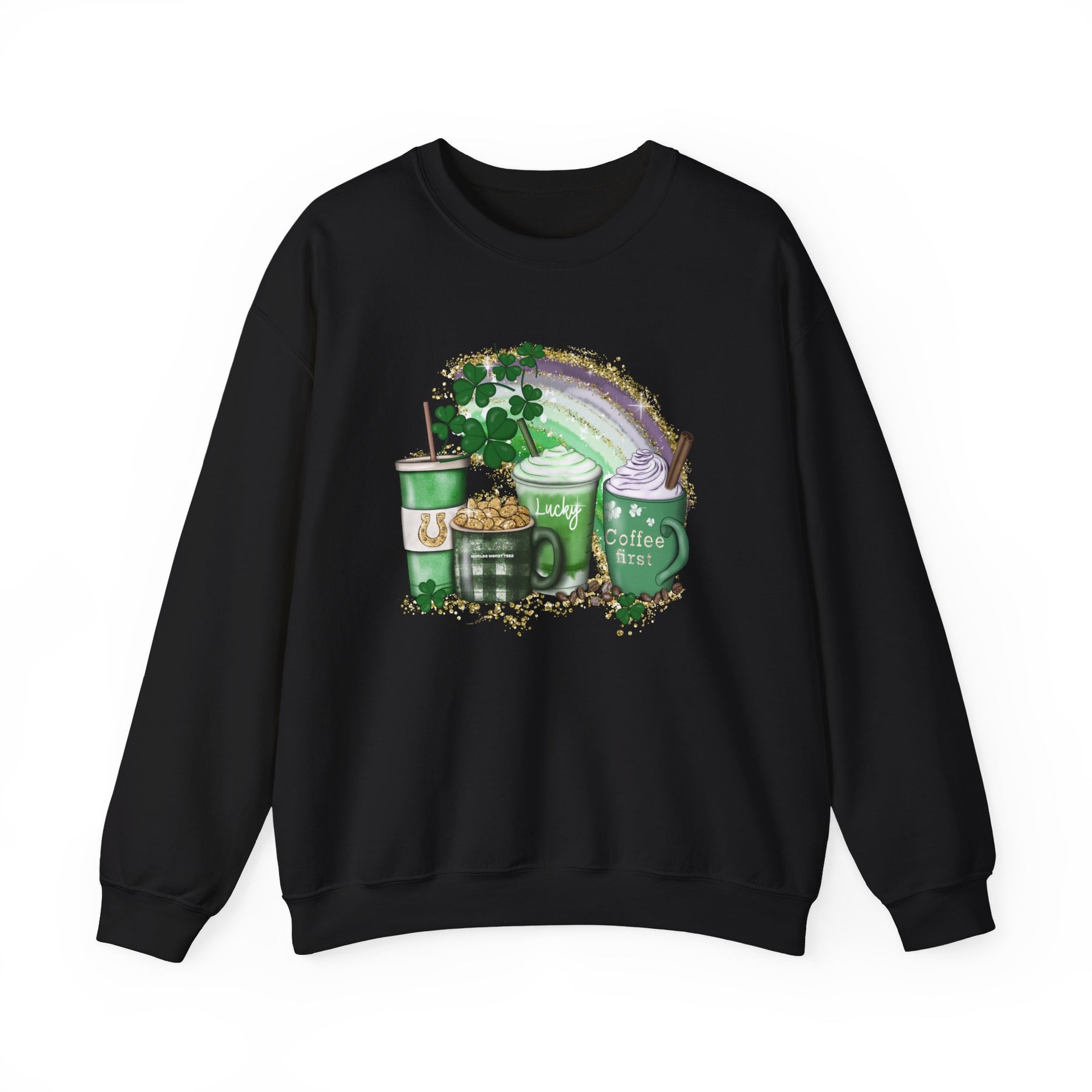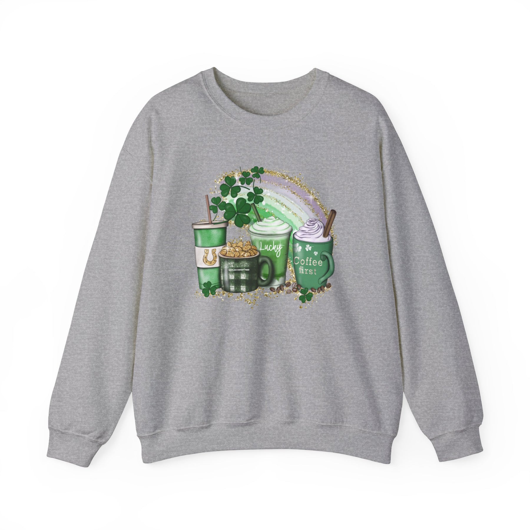 A lucky coffee crew sweatshirt featuring a group of coffee cups, gold coins, and shamrocks. Unisex, heavy blend fabric with ribbed knit collar for comfort. 50% cotton, 50% polyester, loose fit.