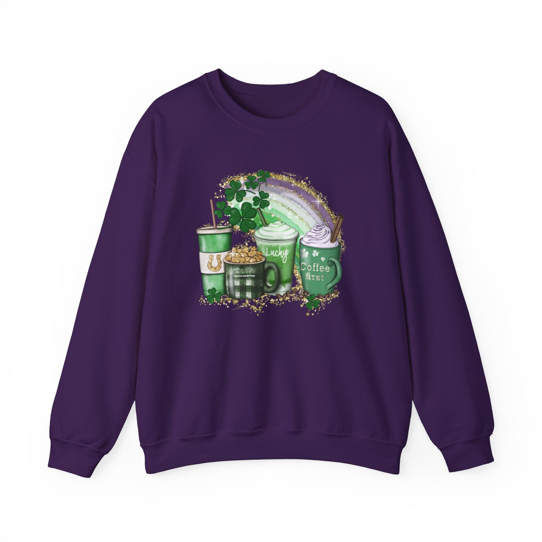 Lucky Coffee Crew unisex sweatshirt with shamrock and coffee design. Heavy blend fabric, ribbed knit collar, no itchy seams. 50% cotton, 50% polyester, loose fit, sewn-in label. Sizes S-5XL.