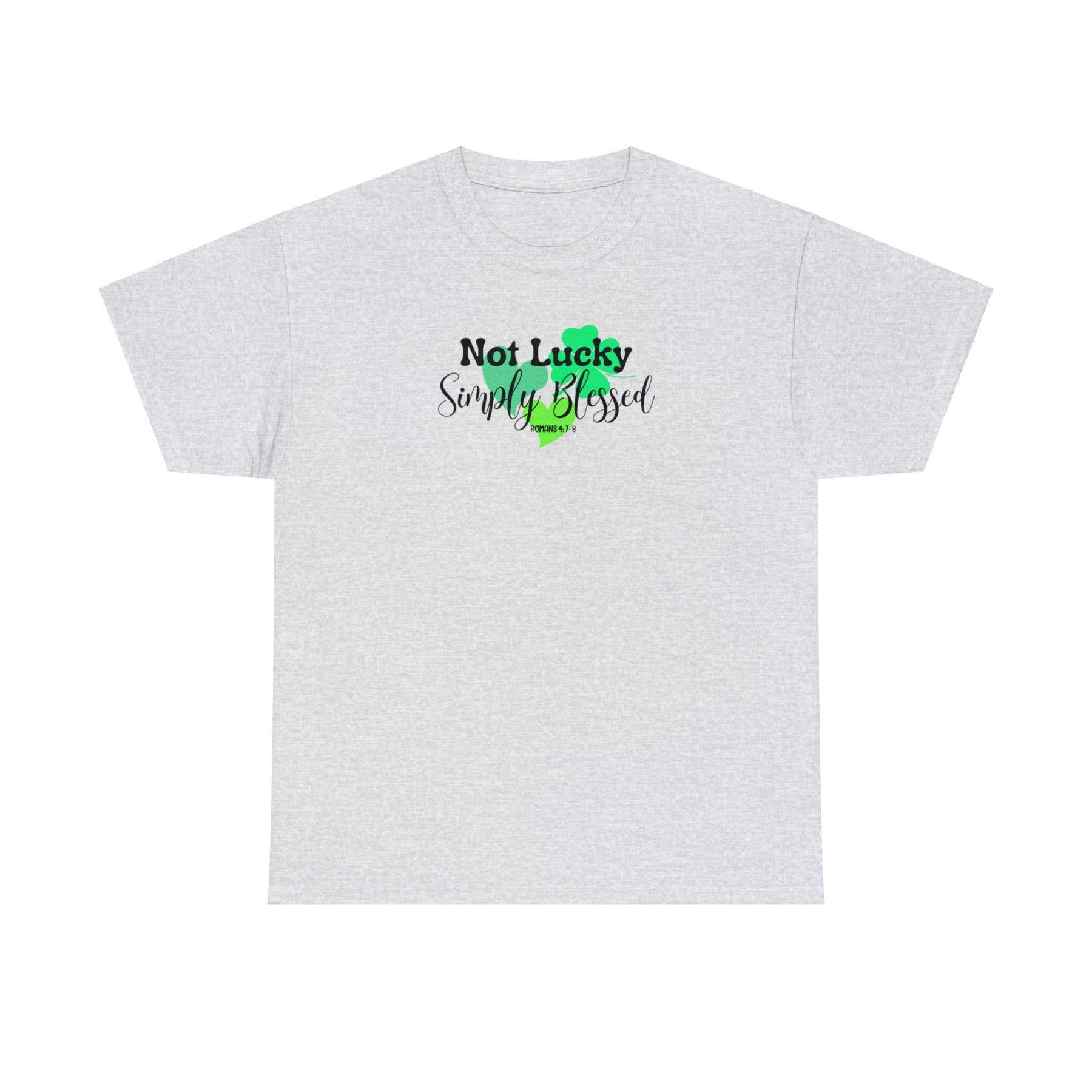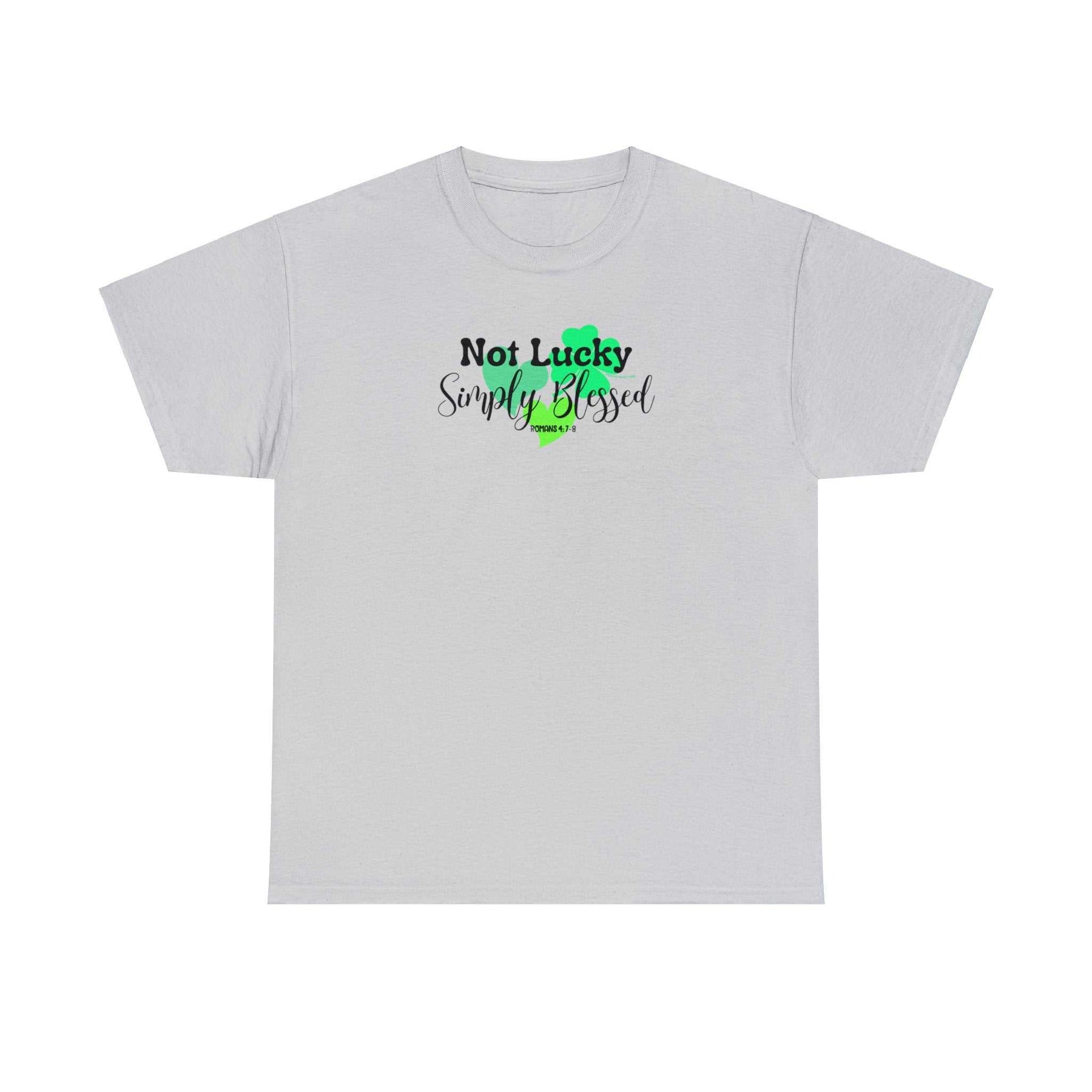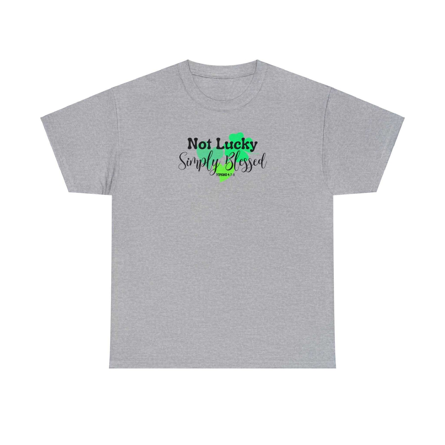 Unisex heavy cotton tee, Not Lucky Simply Blessed design. Basic wardrobe staple with no side seams, durable shoulders, and ribbed knit collar. Medium weight fabric, classic fit, true to size.