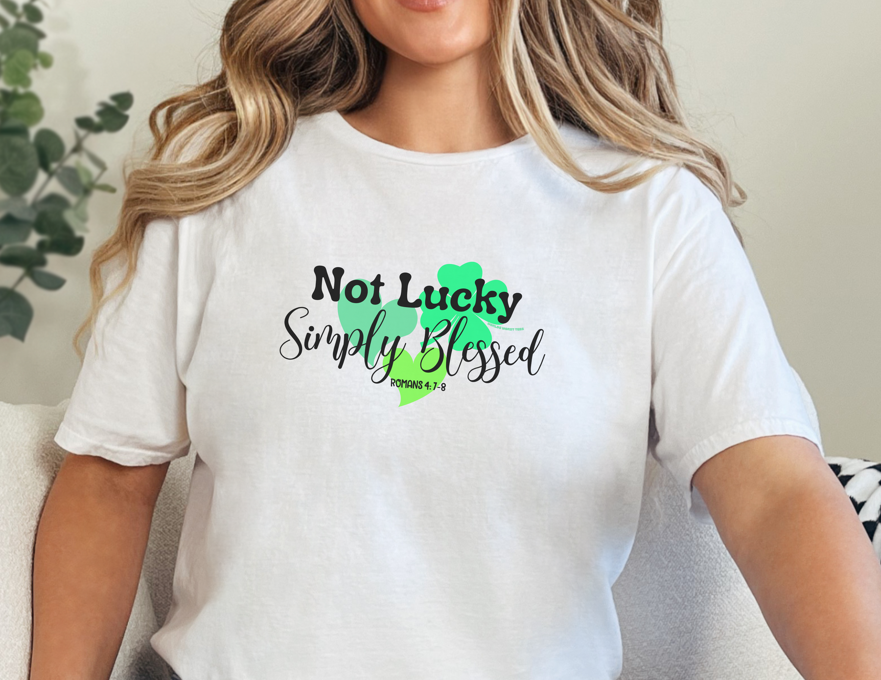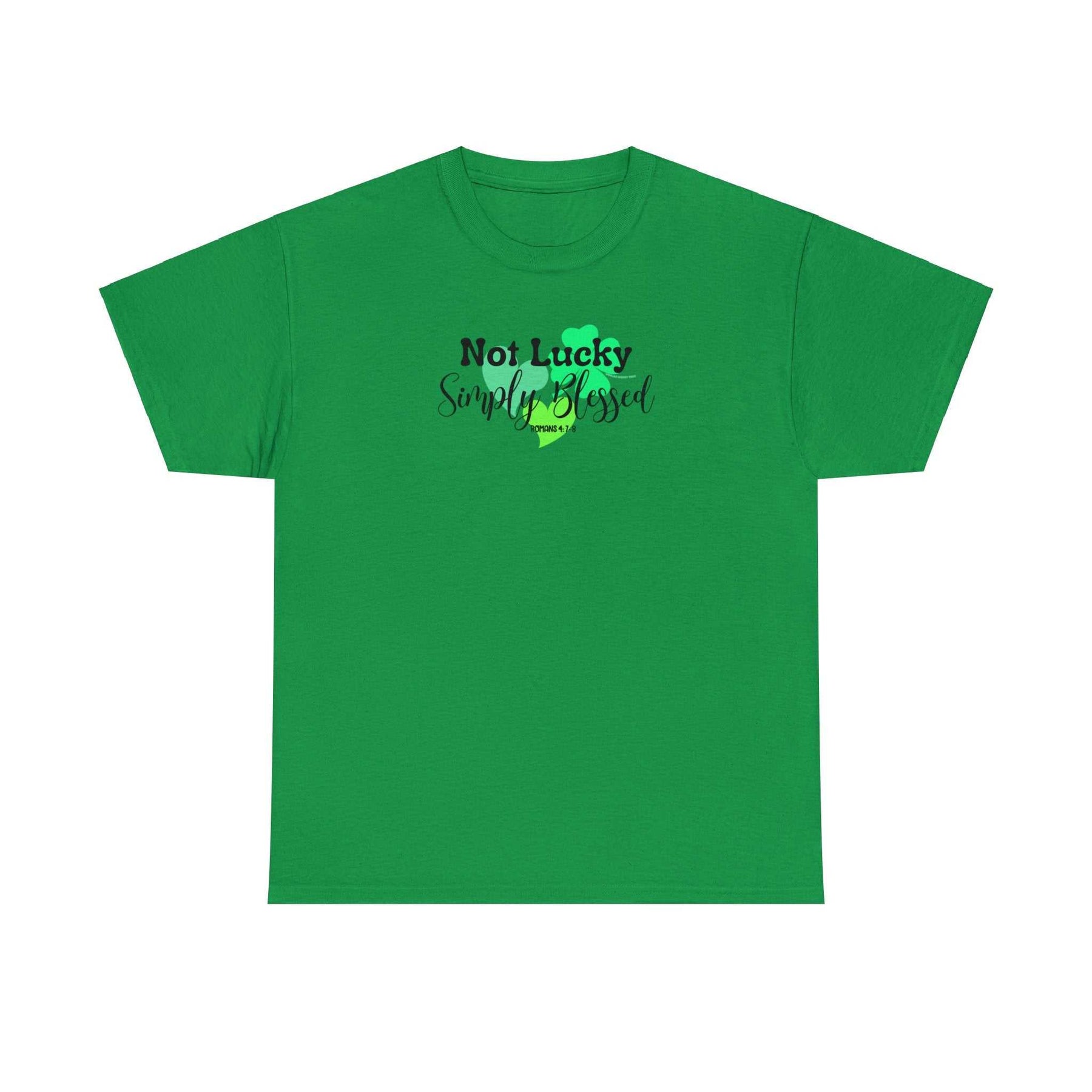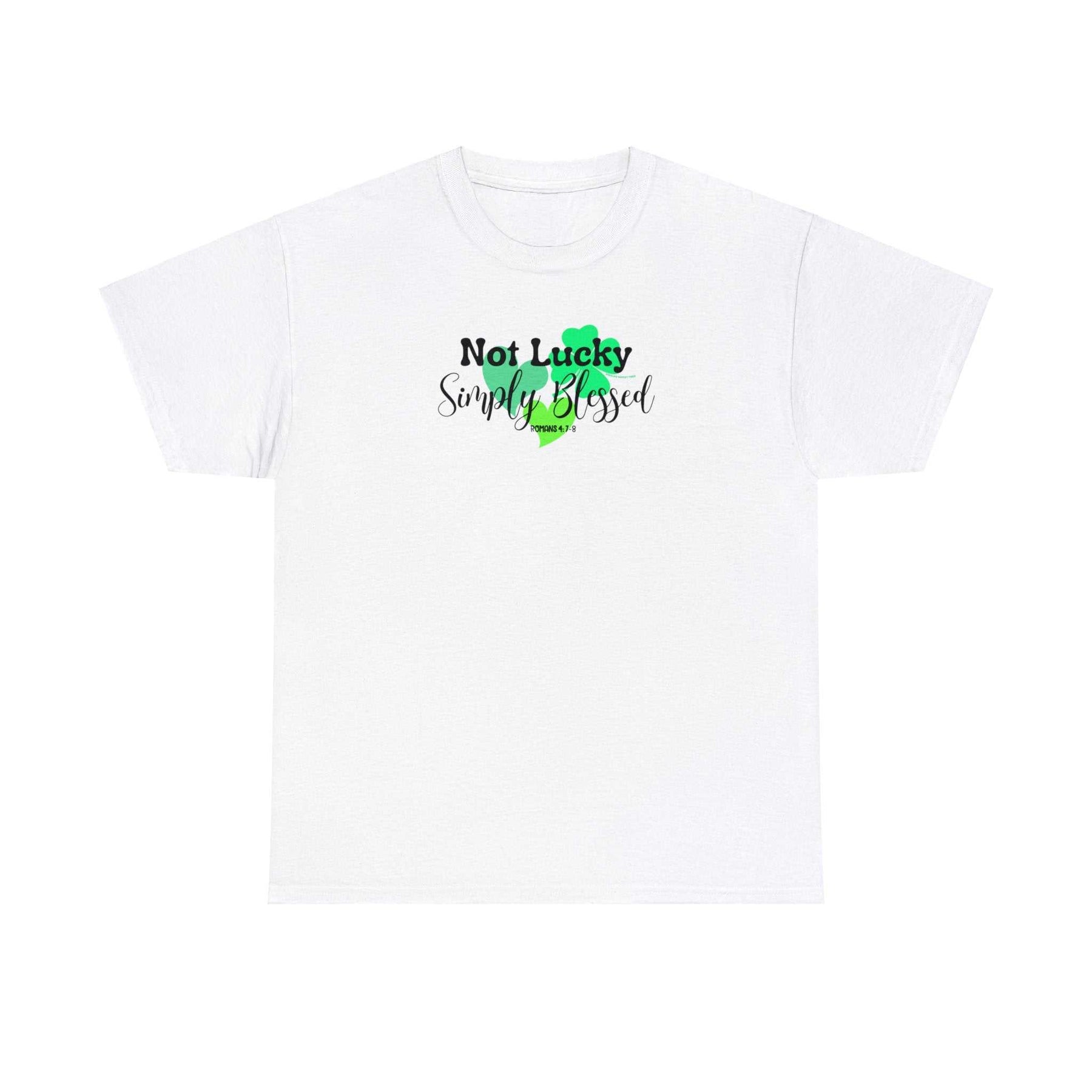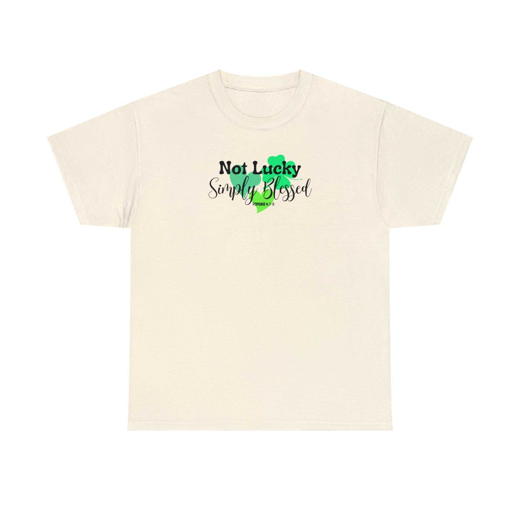 Unisex heavy cotton tee, Not Lucky Simply Blessed design. Basic wardrobe staple with no side seams, durable shoulders, and ribbed knit collar. Medium weight fabric, classic fit, true to size.