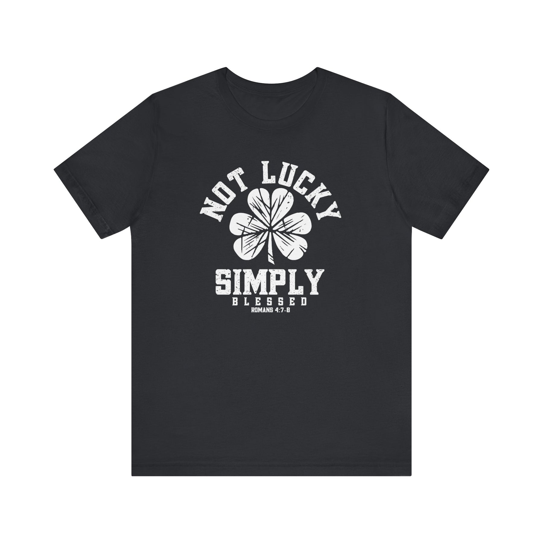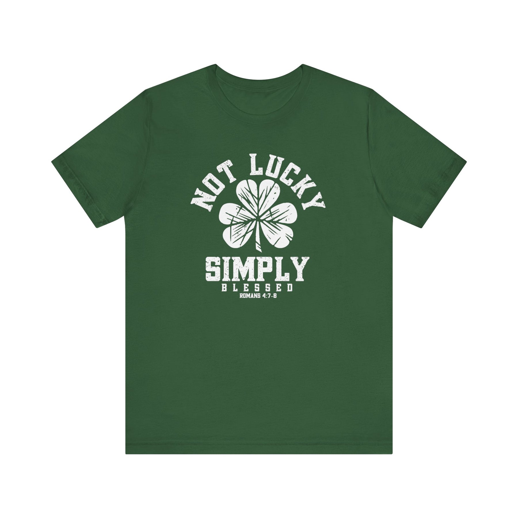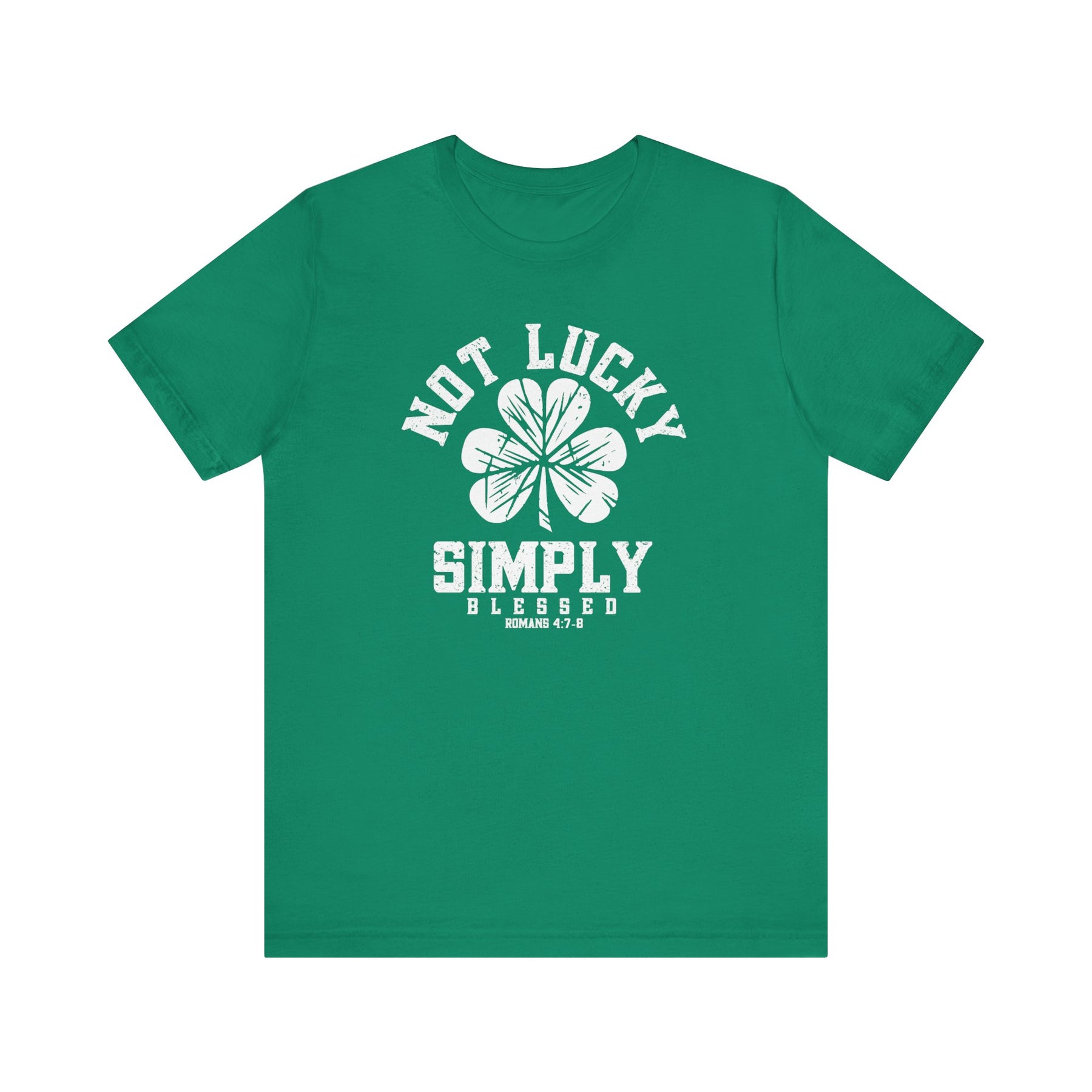 Not Lucky Tee featuring a four-leaf clover graphic on a green unisex jersey short sleeve, made from soft cotton for a comfortable fit.