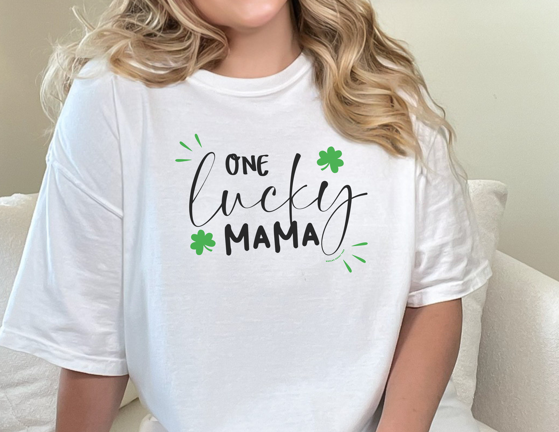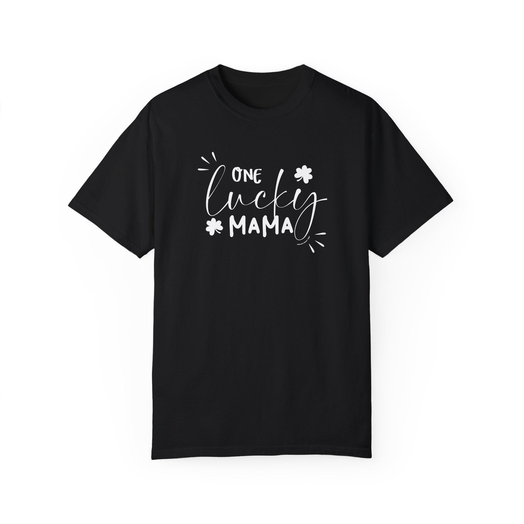 A ring-spun cotton One Lucky Mama Tee, garment-dyed for coziness. Relaxed fit, double-needle stitching for durability, no side-seams for shape retention. Ideal for daily wear.