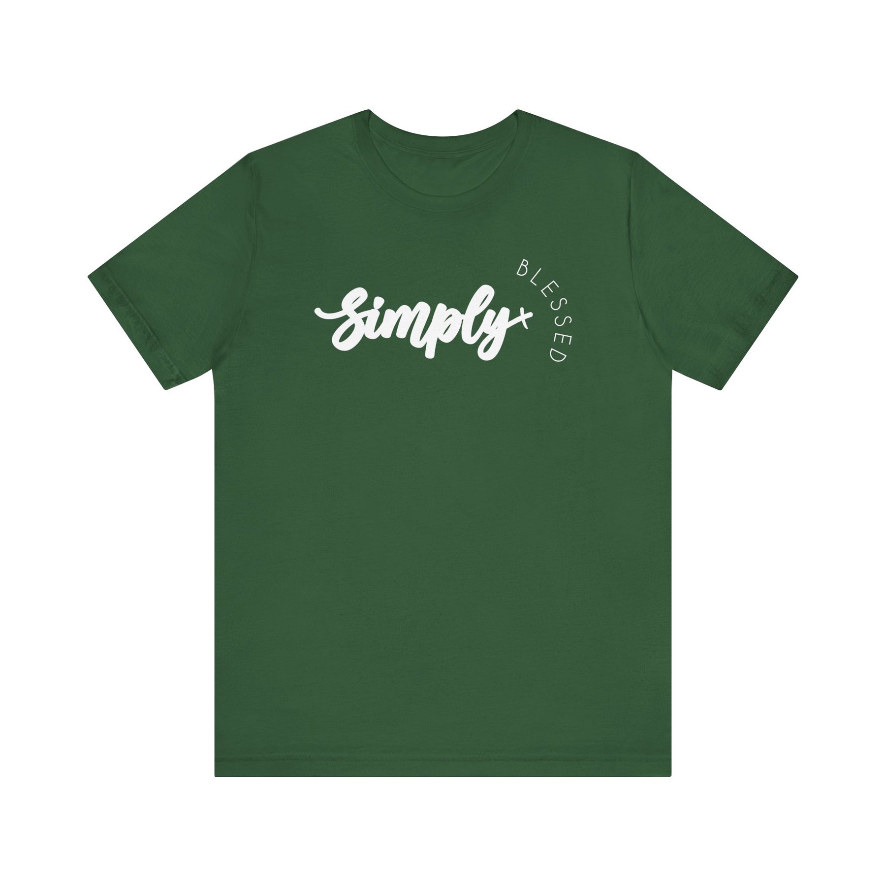 Simply Blessed Tee, a green unisex short sleeve shirt with white text, made from soft cotton, featuring ribbed knit collars and dual side seams for durability.