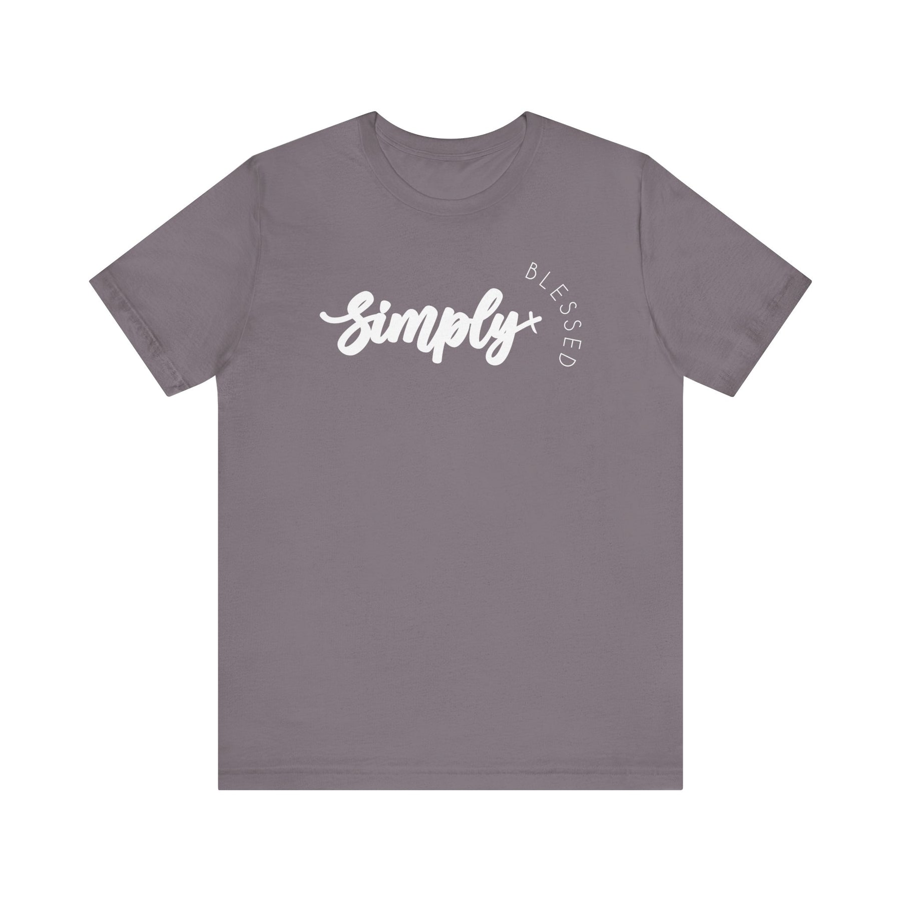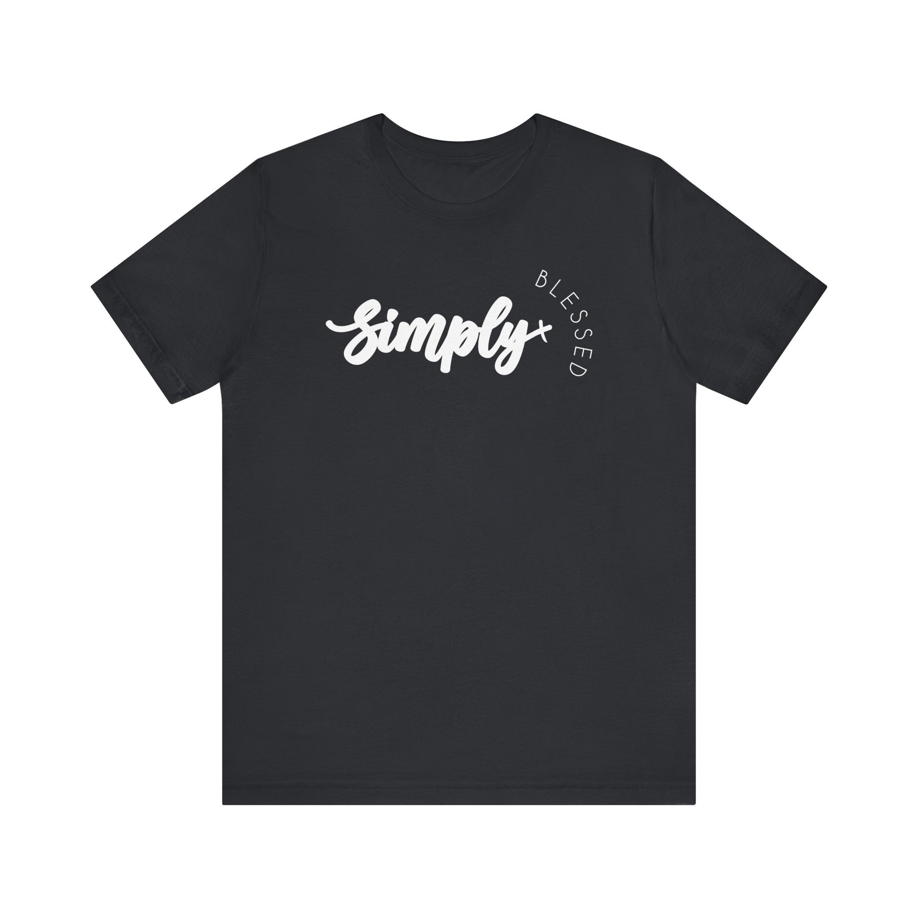 Simply Blessed Tee: A grey t-shirt featuring white text, crafted from soft cotton with ribbed knit collars and dual side seams for a lasting, comfortable fit.
