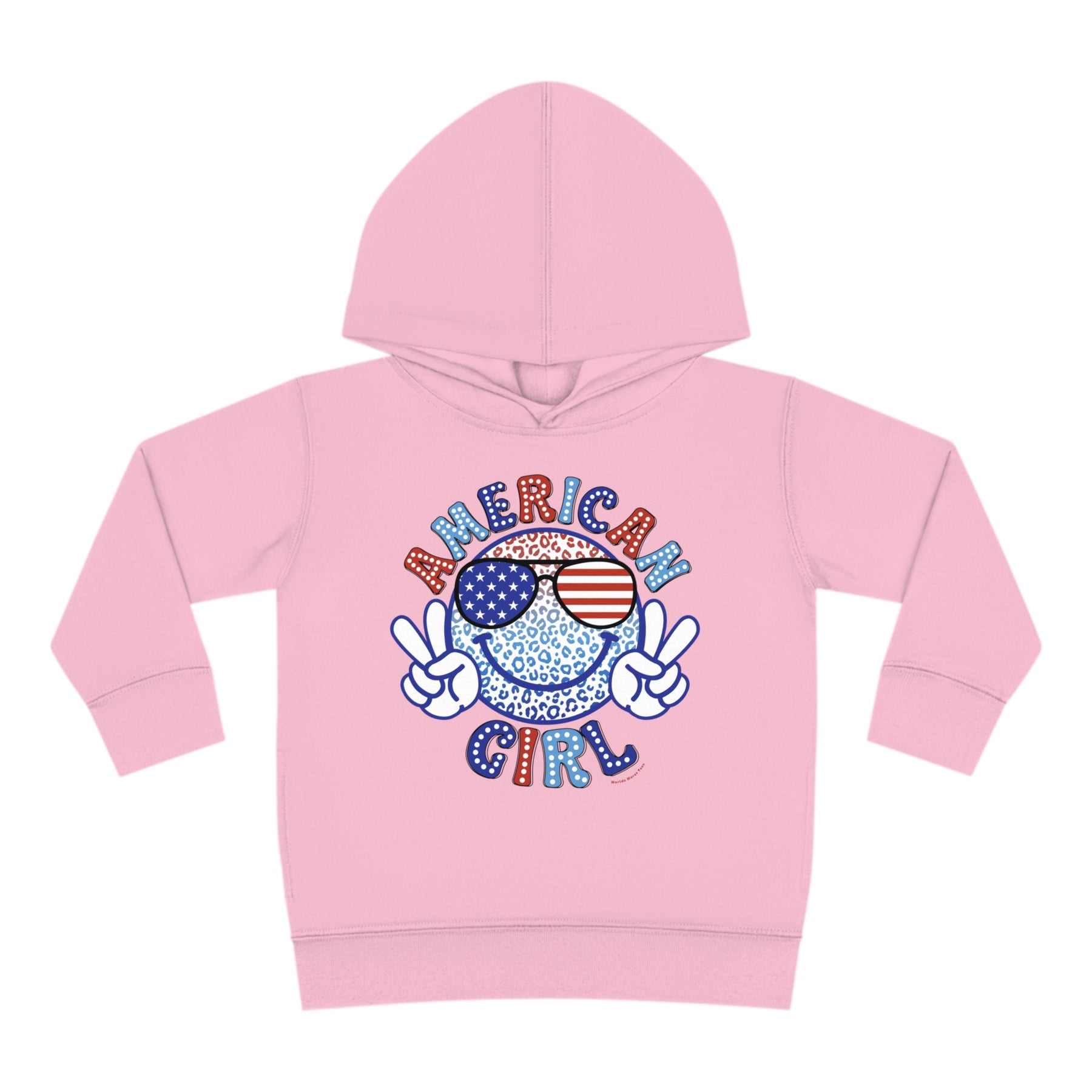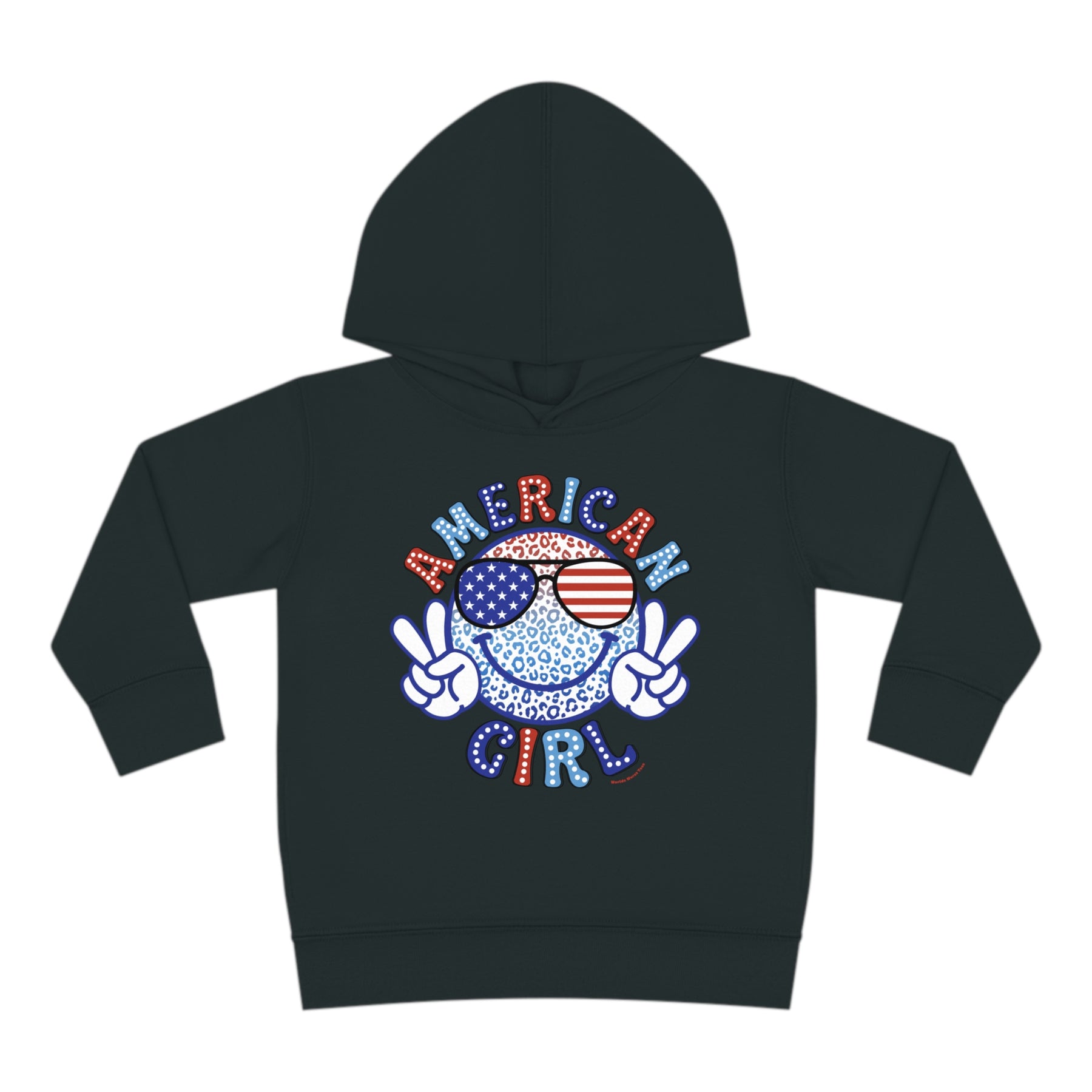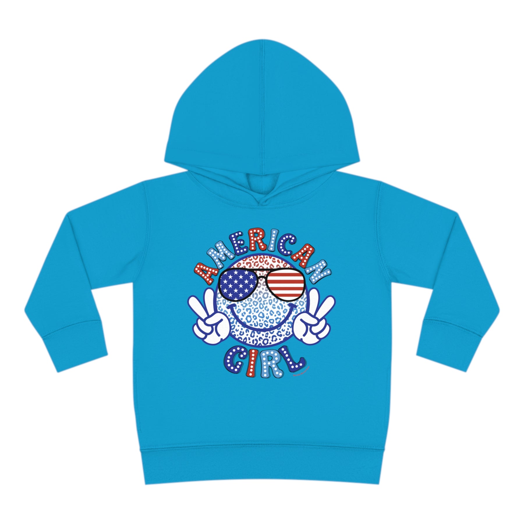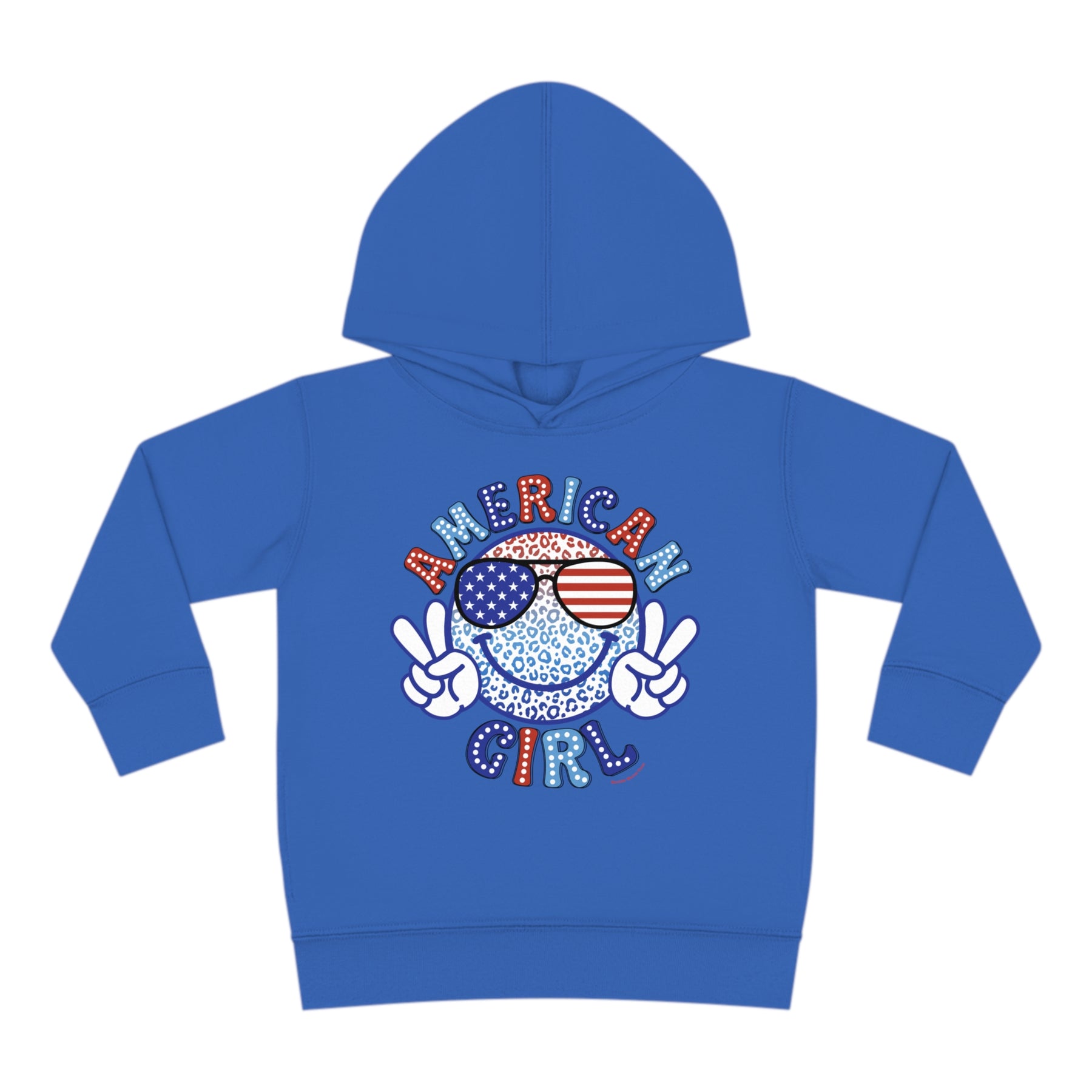 American Girl Toddler Hoodie featuring a logo with a face and sunglasses, a smiley face cartoon, and blue and white sunglasses with stars. Designed for comfort with durable construction and side seam pockets.