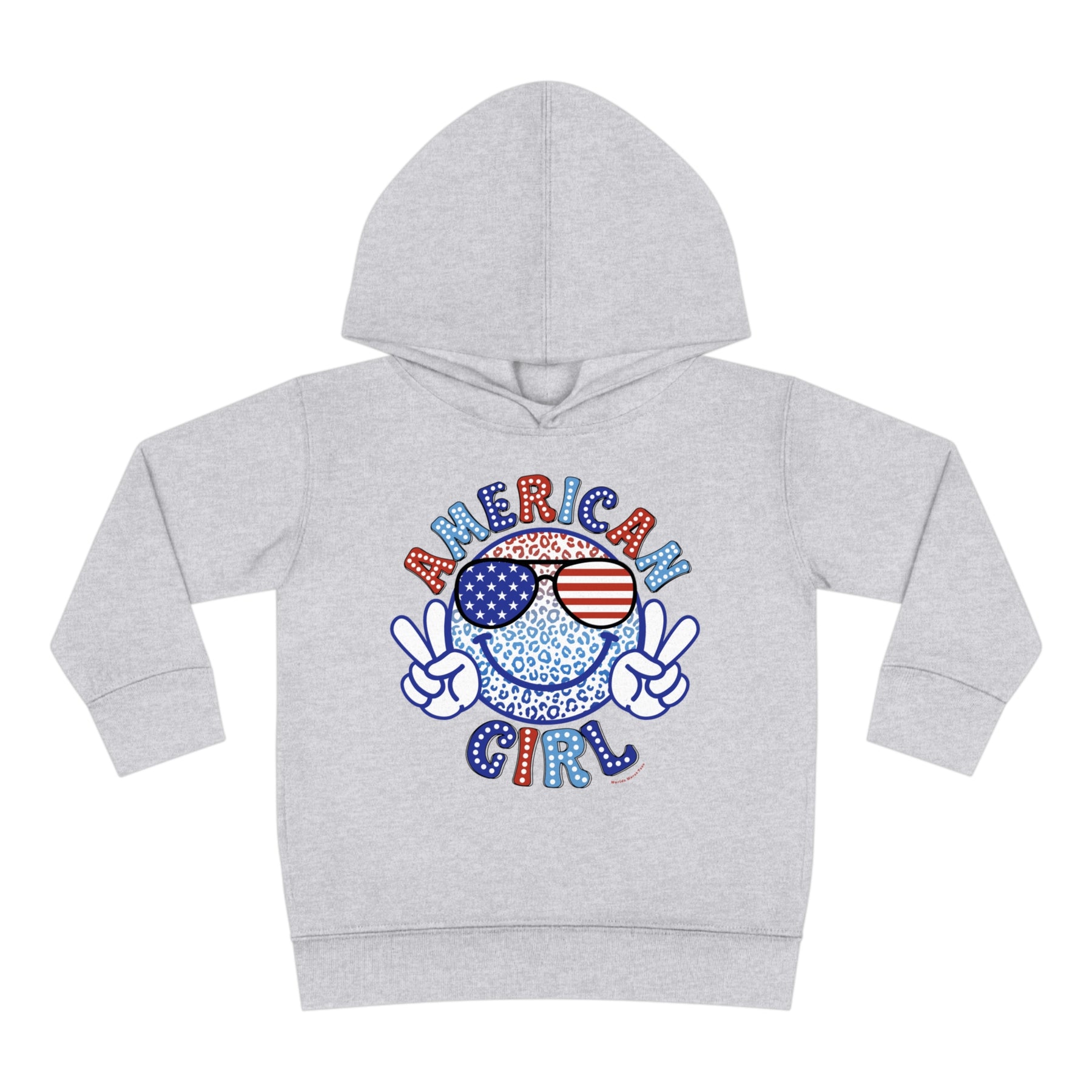 American Girl Toddler Hoodie featuring a smiley face with sunglasses, peace sign, and cartoon hand. Durable design with jersey-lined hood, cover-stitched details, and side seam pockets for cozy wear.