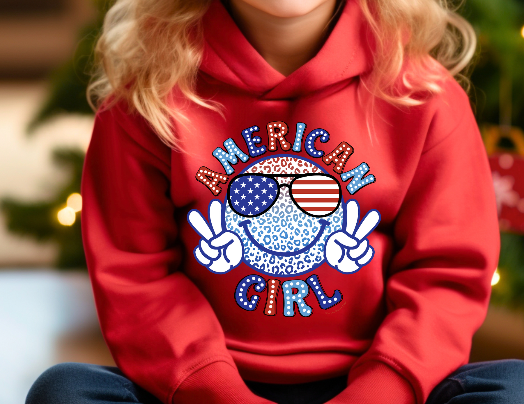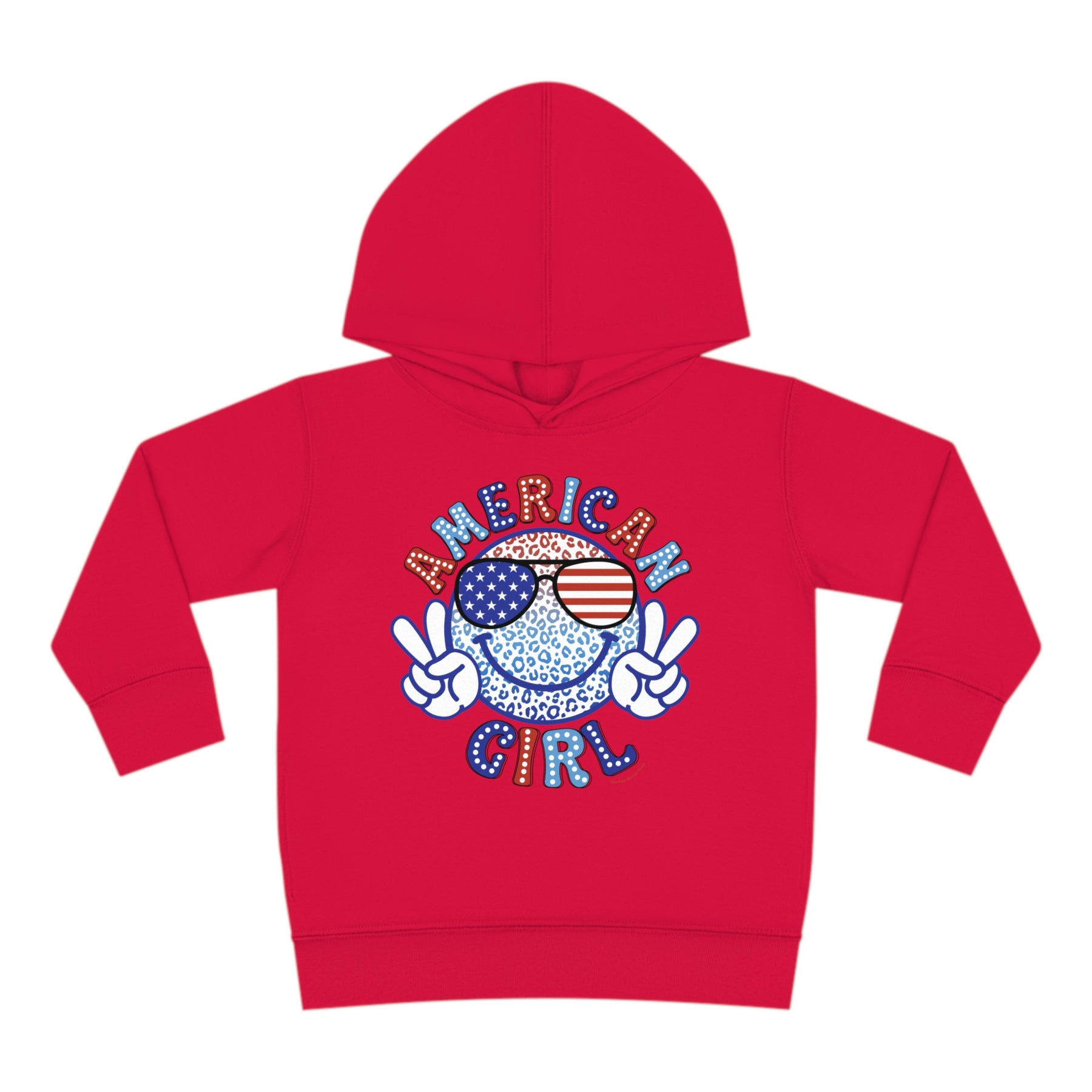 American Girl Toddler Hoodie featuring a red design with a smiley face and sunglasses. Jersey-lined hood, cover-stitched details, and side pockets for durability and coziness. Ideal for kids aged 2 to 6.
