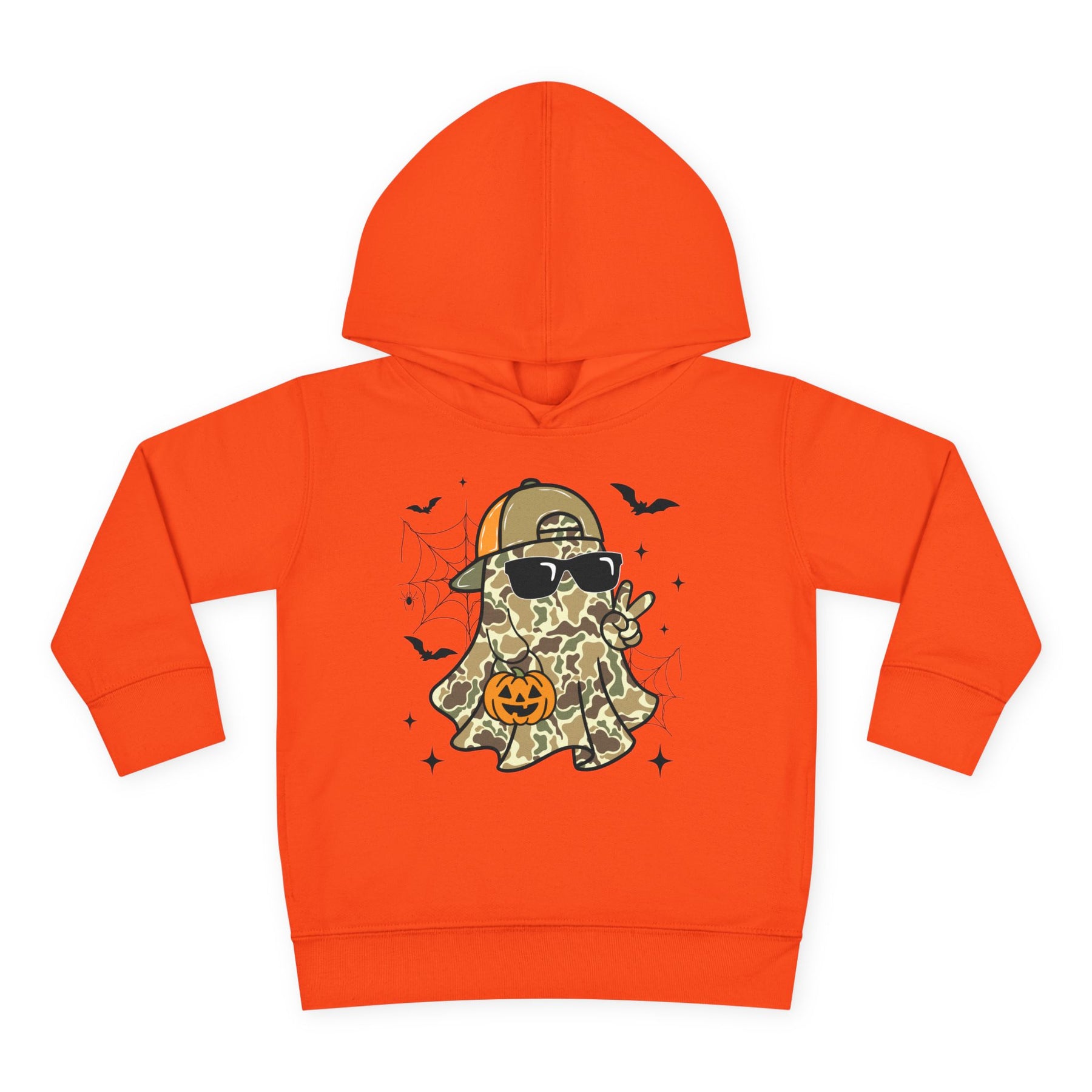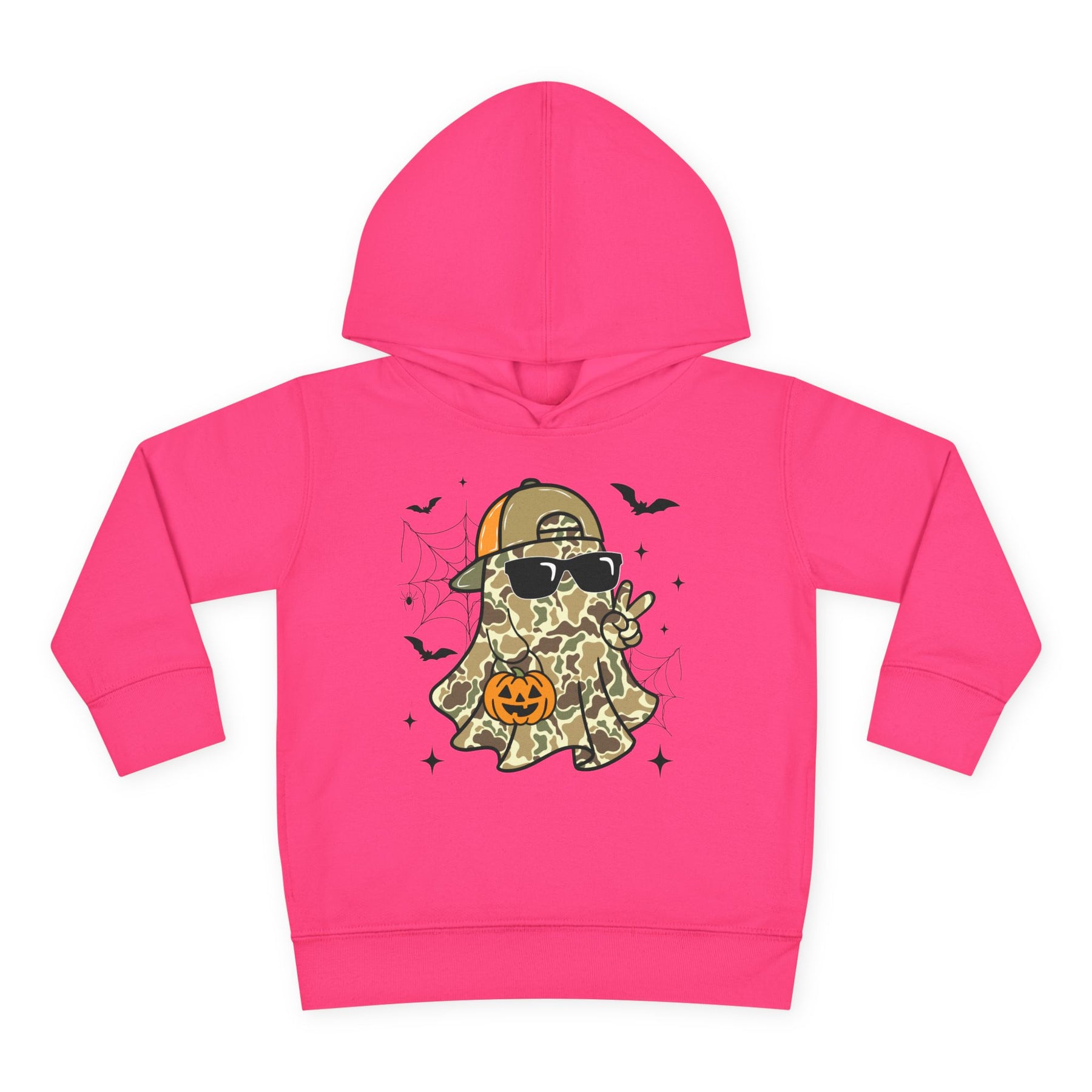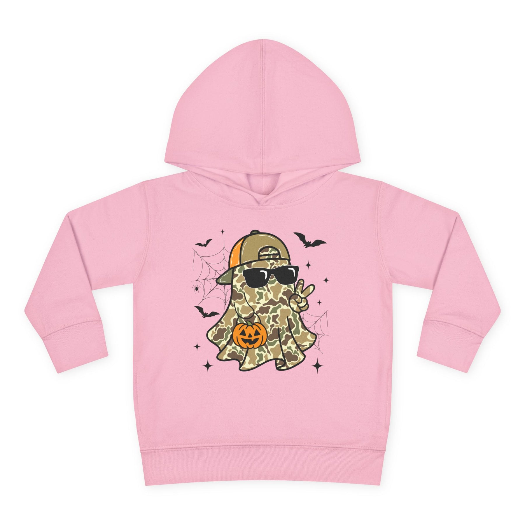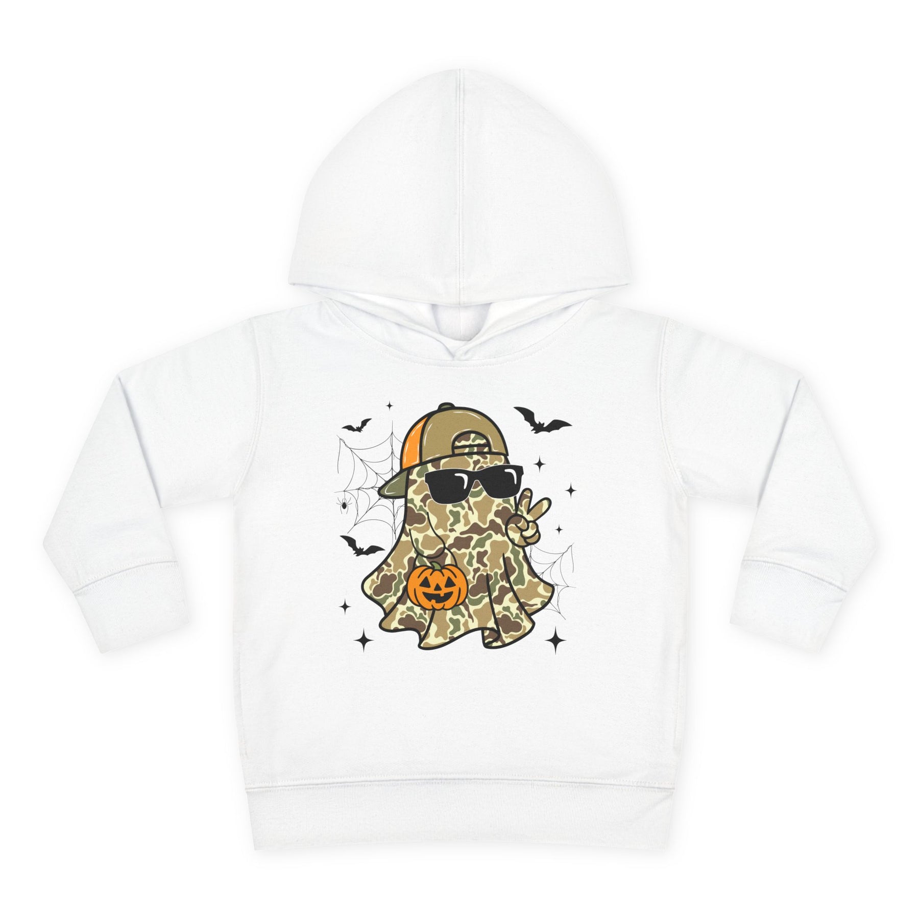 Candy Ghost Toddler Hoodie features a camo-patterned ghost with sunglasses, a cap, and Halloween elements, offering cozy comfort with durable jersey-lined hood and side-seam pockets.