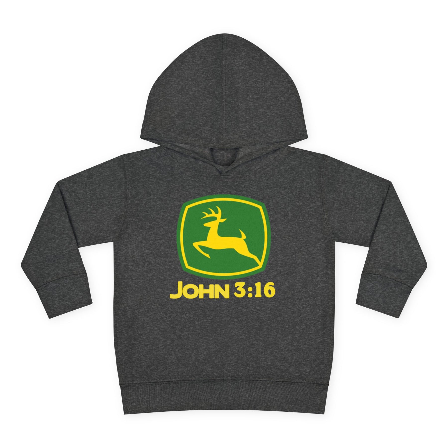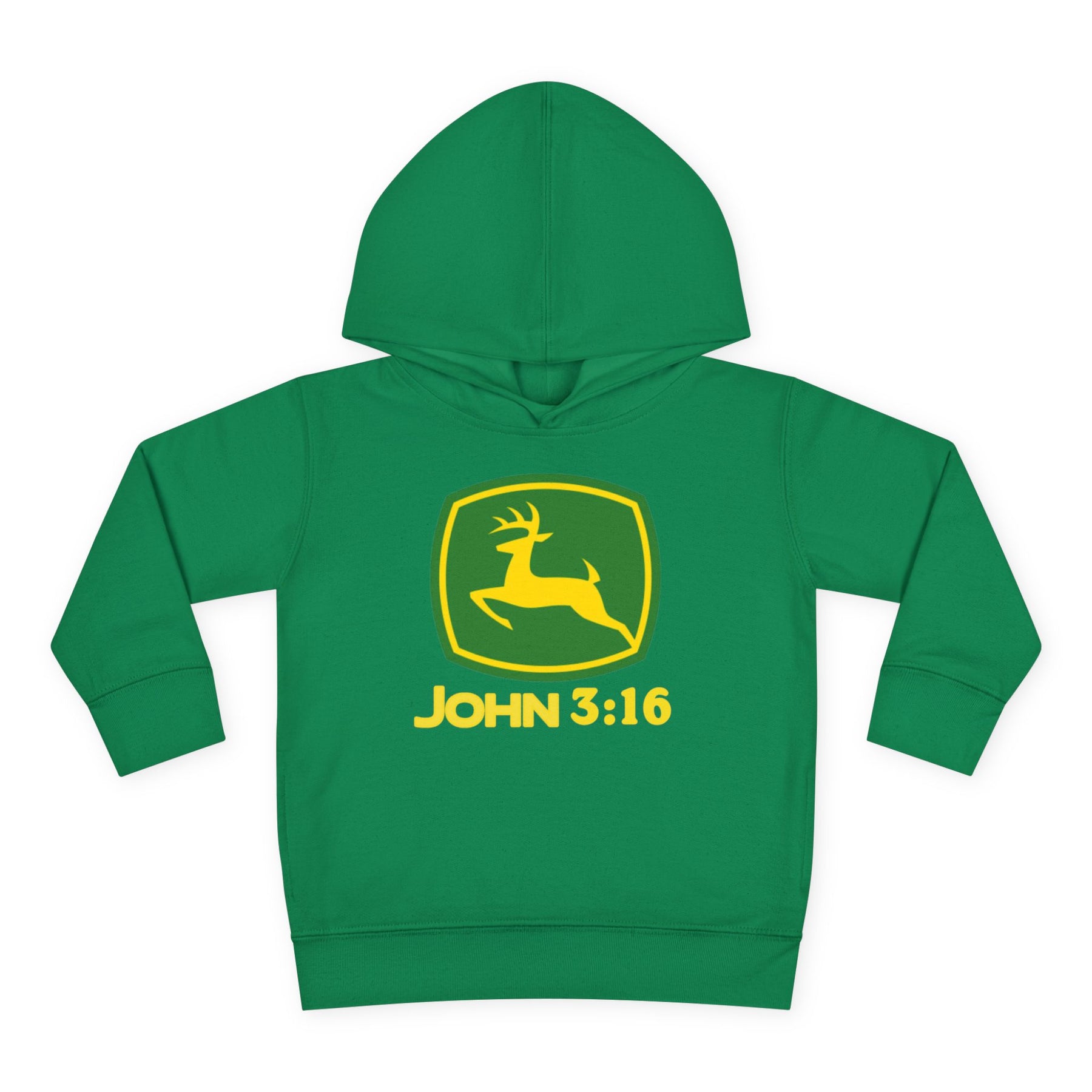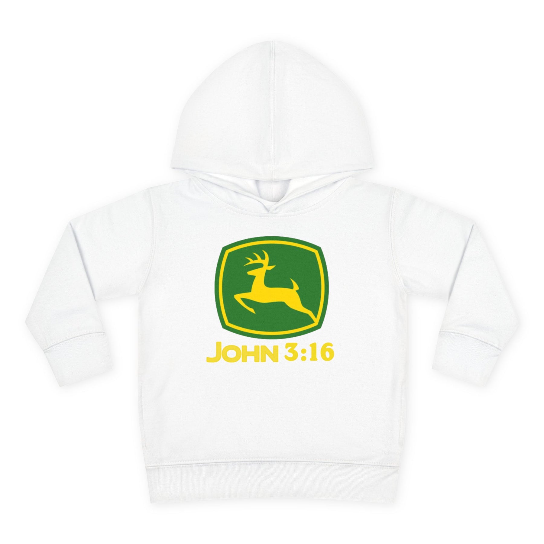 John 3:16 Toddler Hoodie featuring a spoof John Deere logo with a yellow deer on a green shield. Cozy design with durable stitching and side-seam pockets.