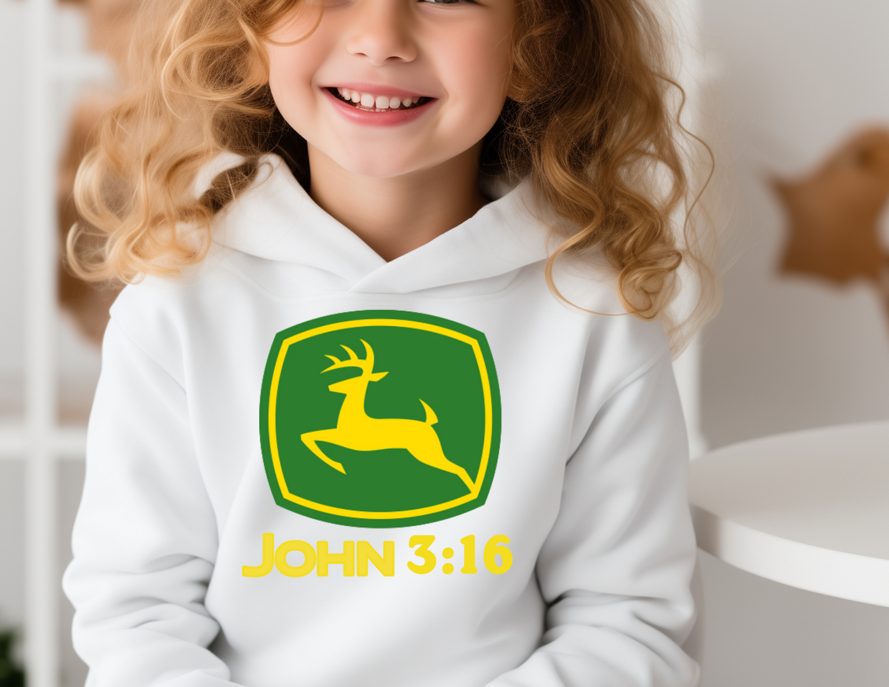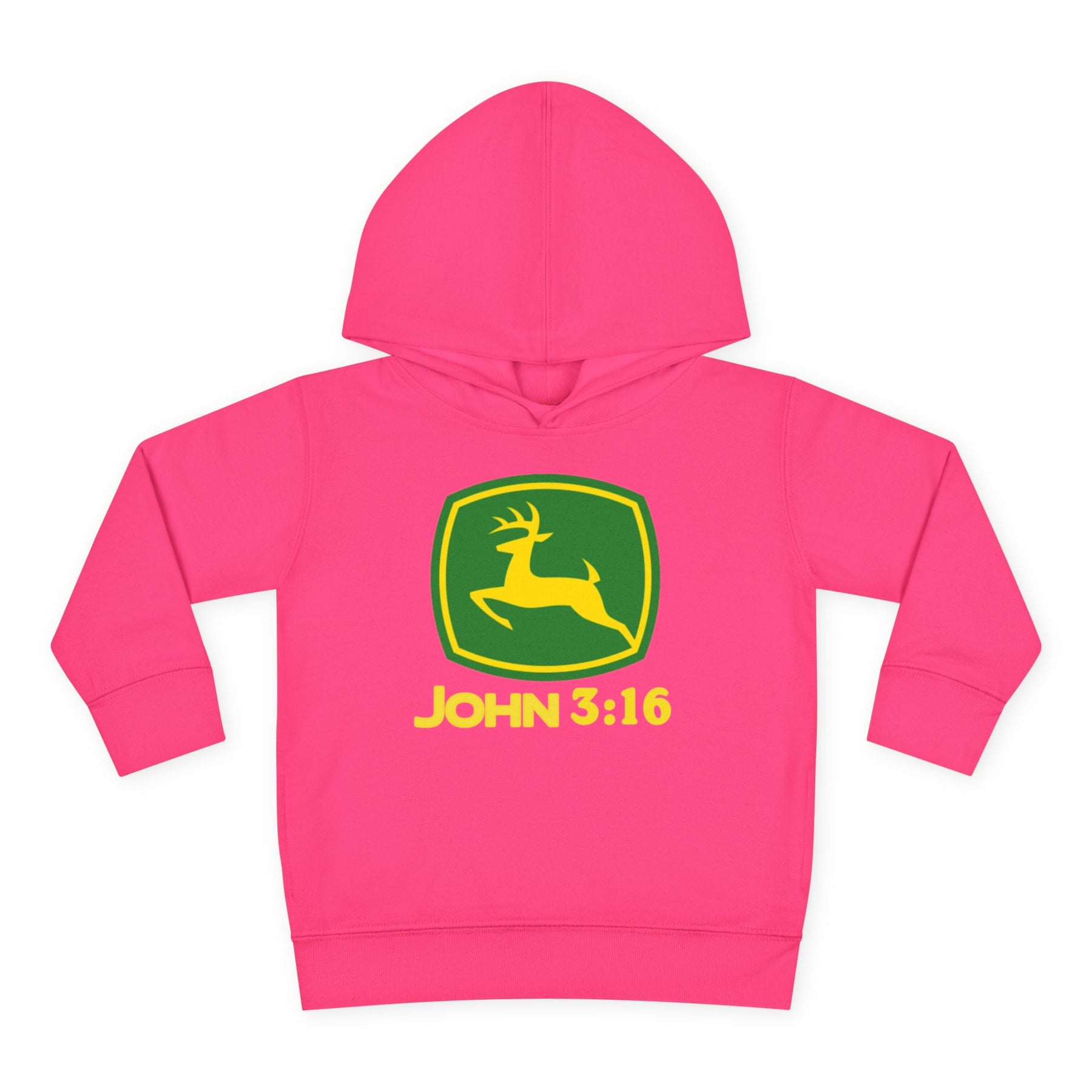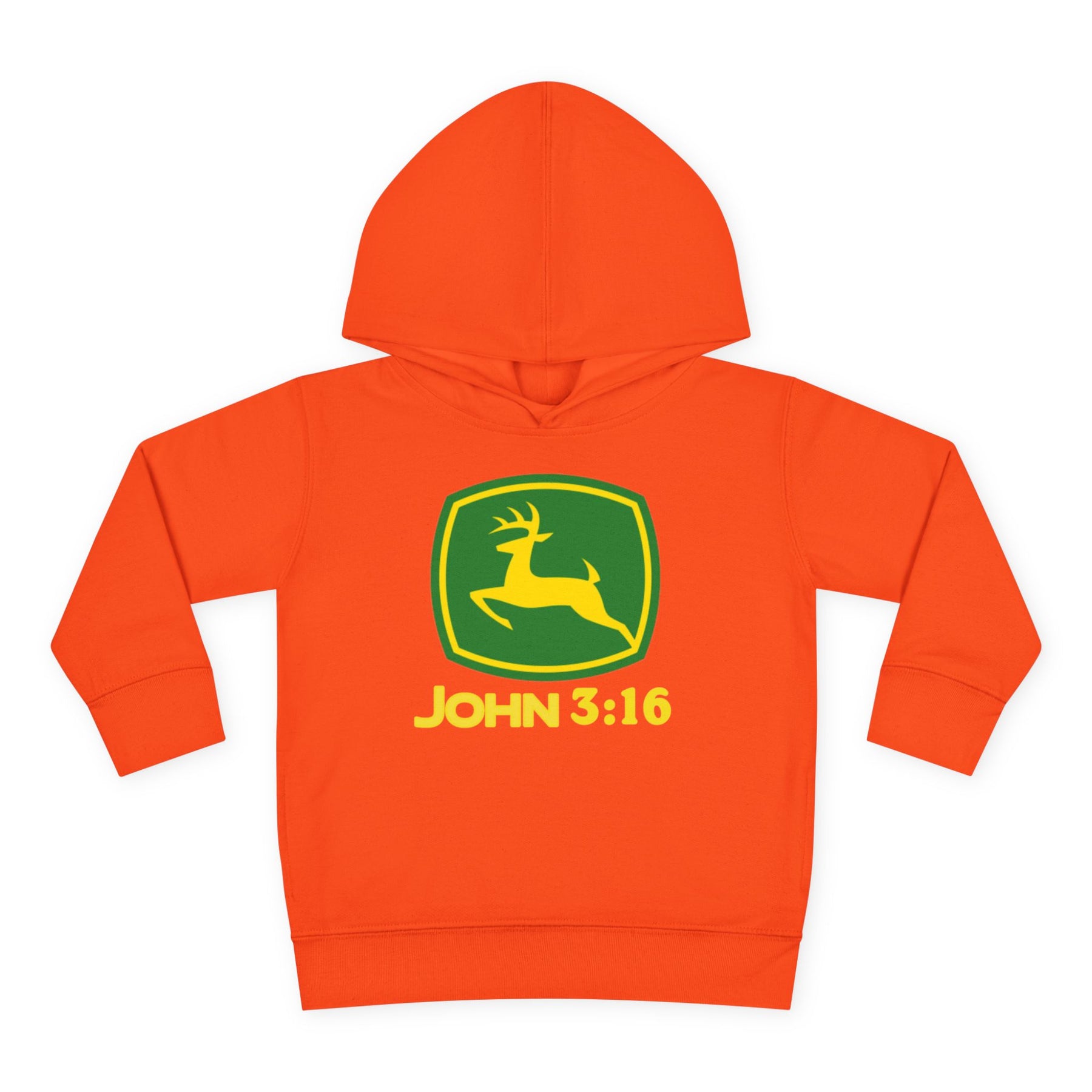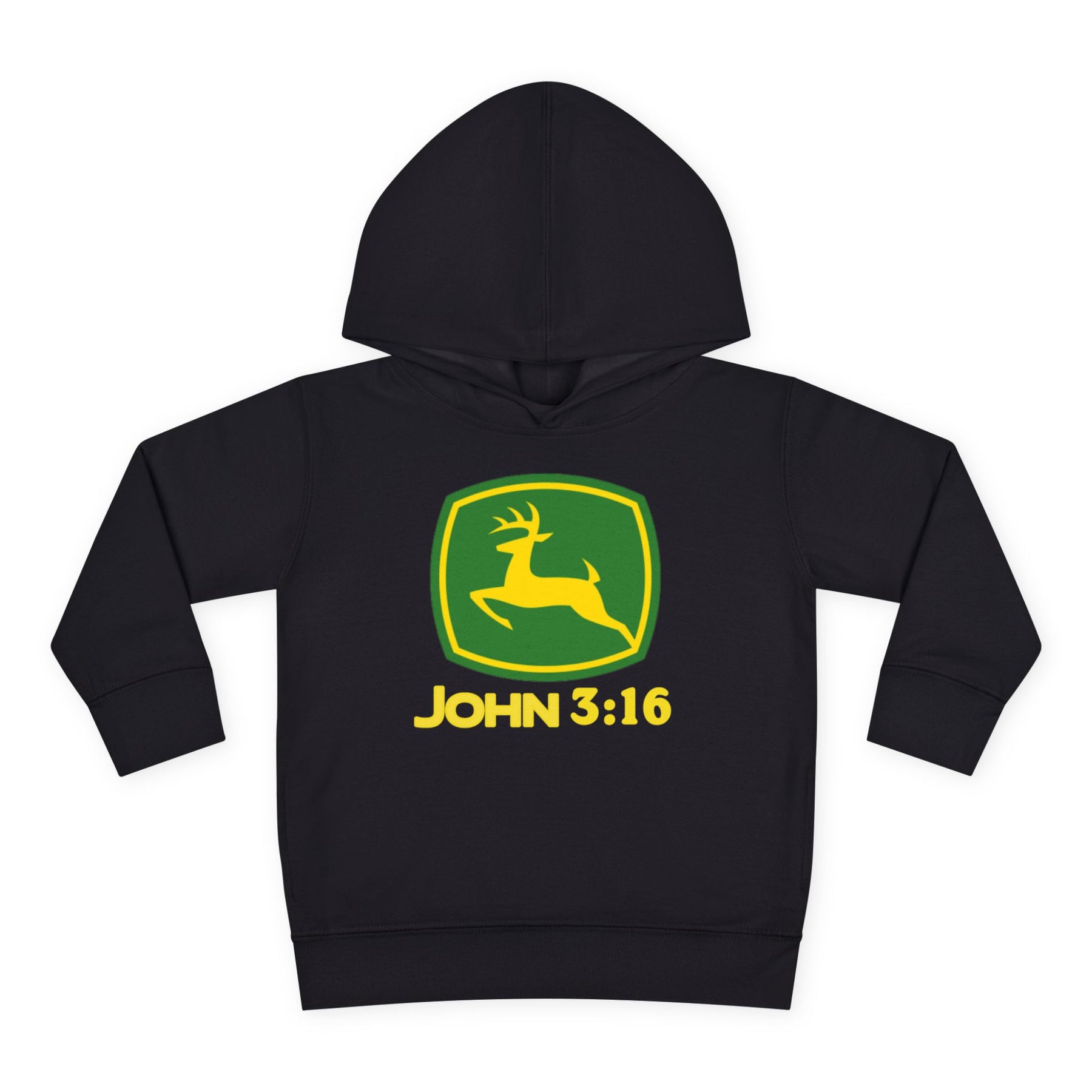 John 3:16 Toddler Hoodie featuring a spoof John Deere logo with a yellow deer on a green shield. Cozy design with durable stitching and side-seam pockets.