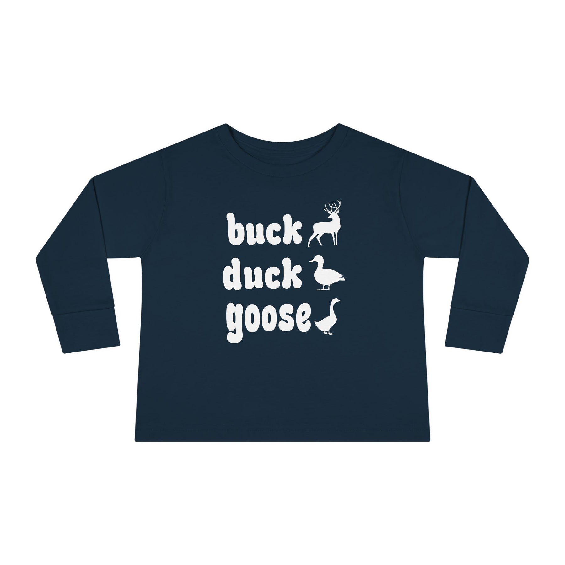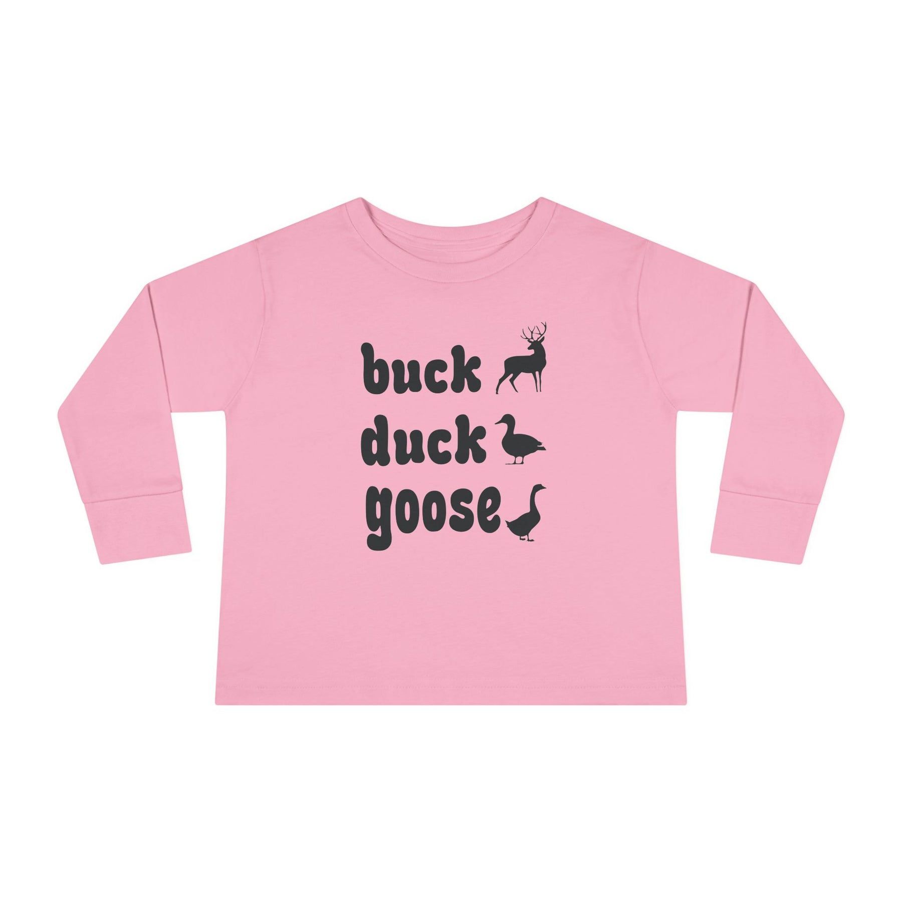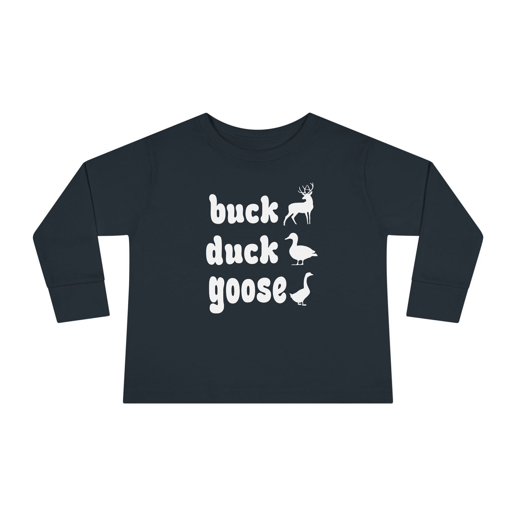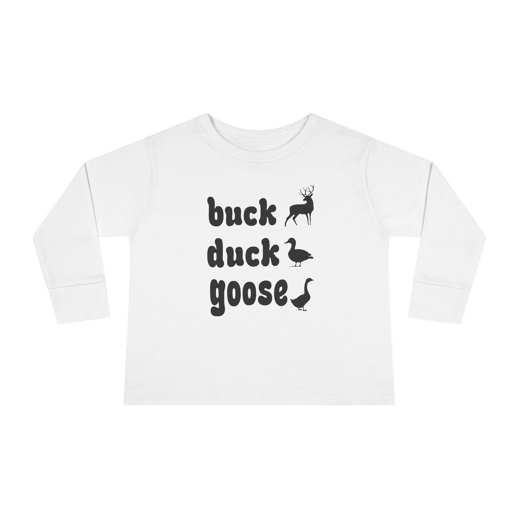 Buck, Duck, Goose, Toddler Long Sleeve Tee featuring playful animal silhouettes and text design, crafted from soft, durable cotton for comfort and longevity in toddler sizes.
