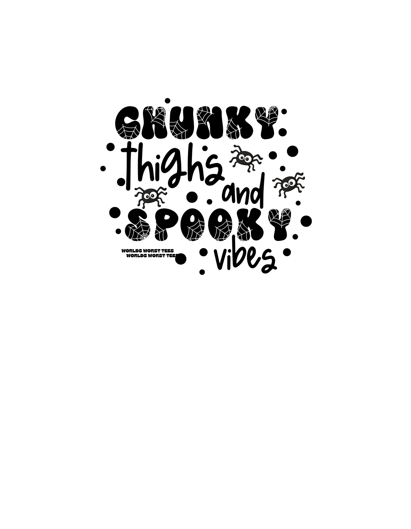 Chunky Thighs and Spooky Vibes Toddler Long Sleeve Tee featuring a cartoon spider design in the dark. 100% combed ringspun cotton for durability and comfort. Unisex fit with ribbed collar. From Worlds Worst Tees.