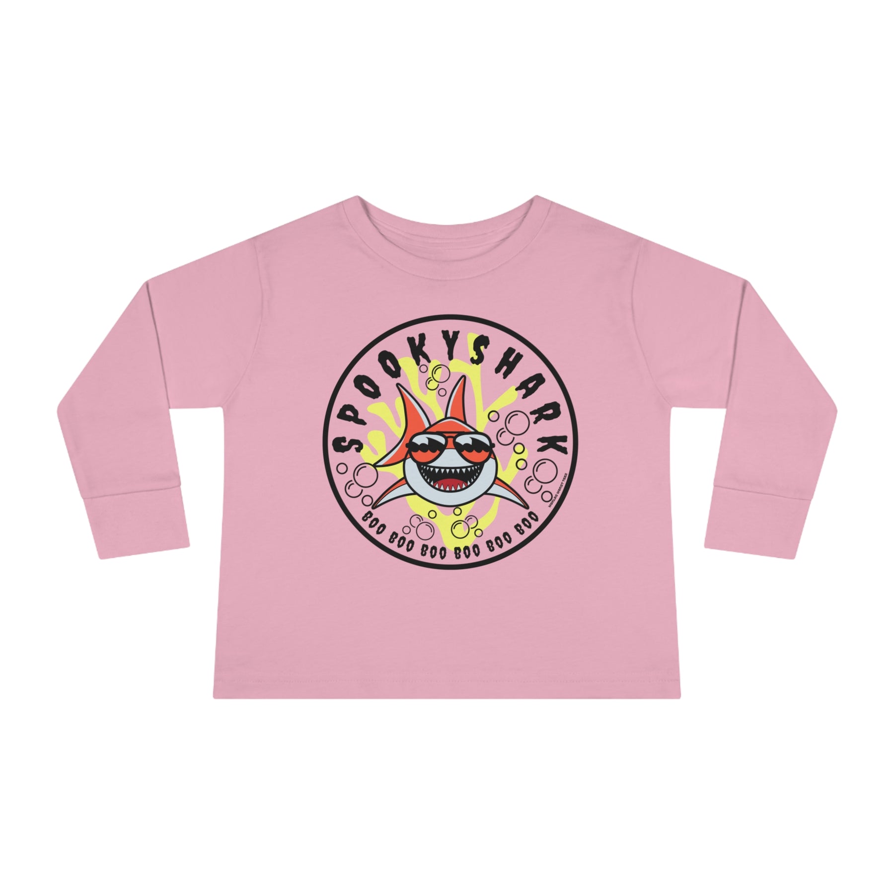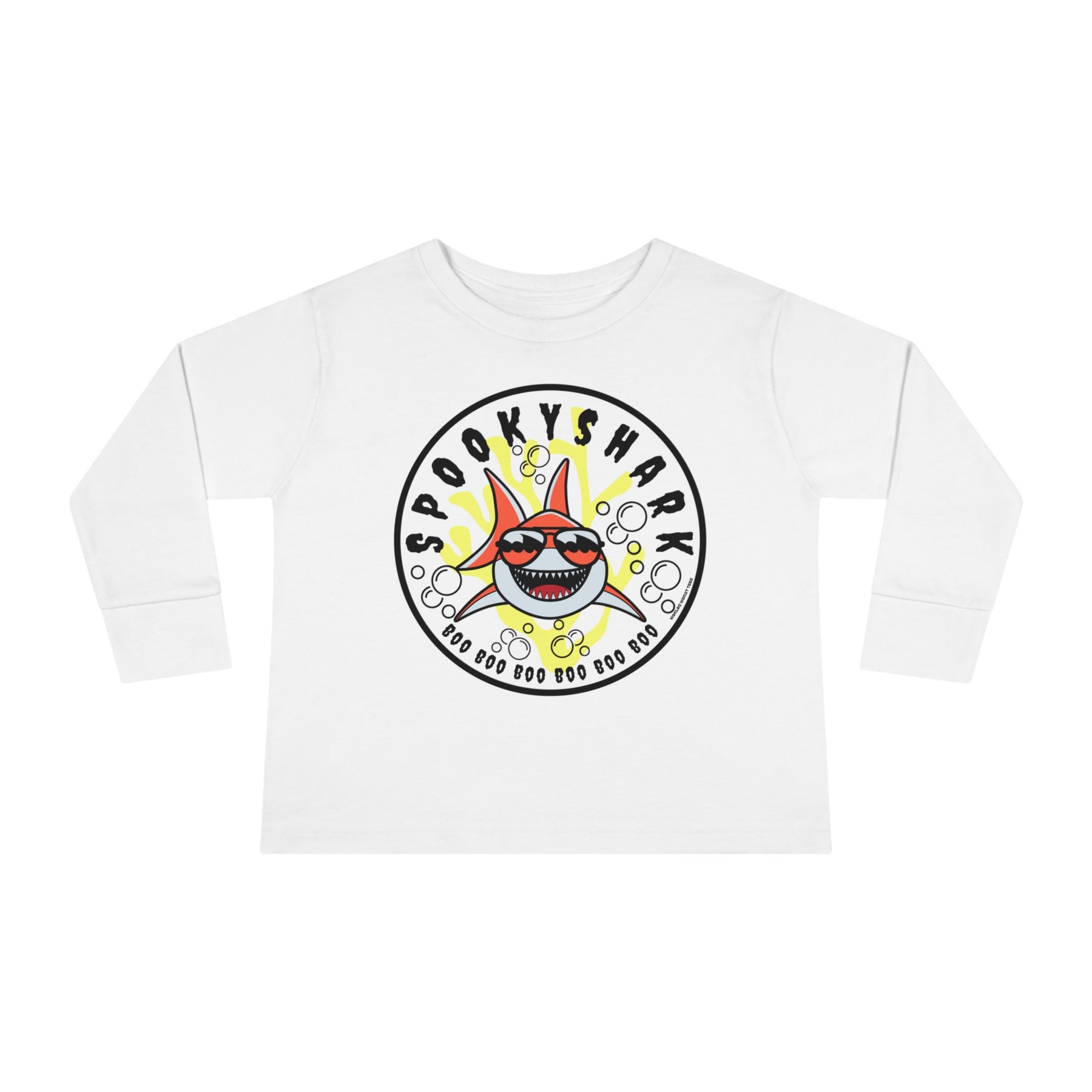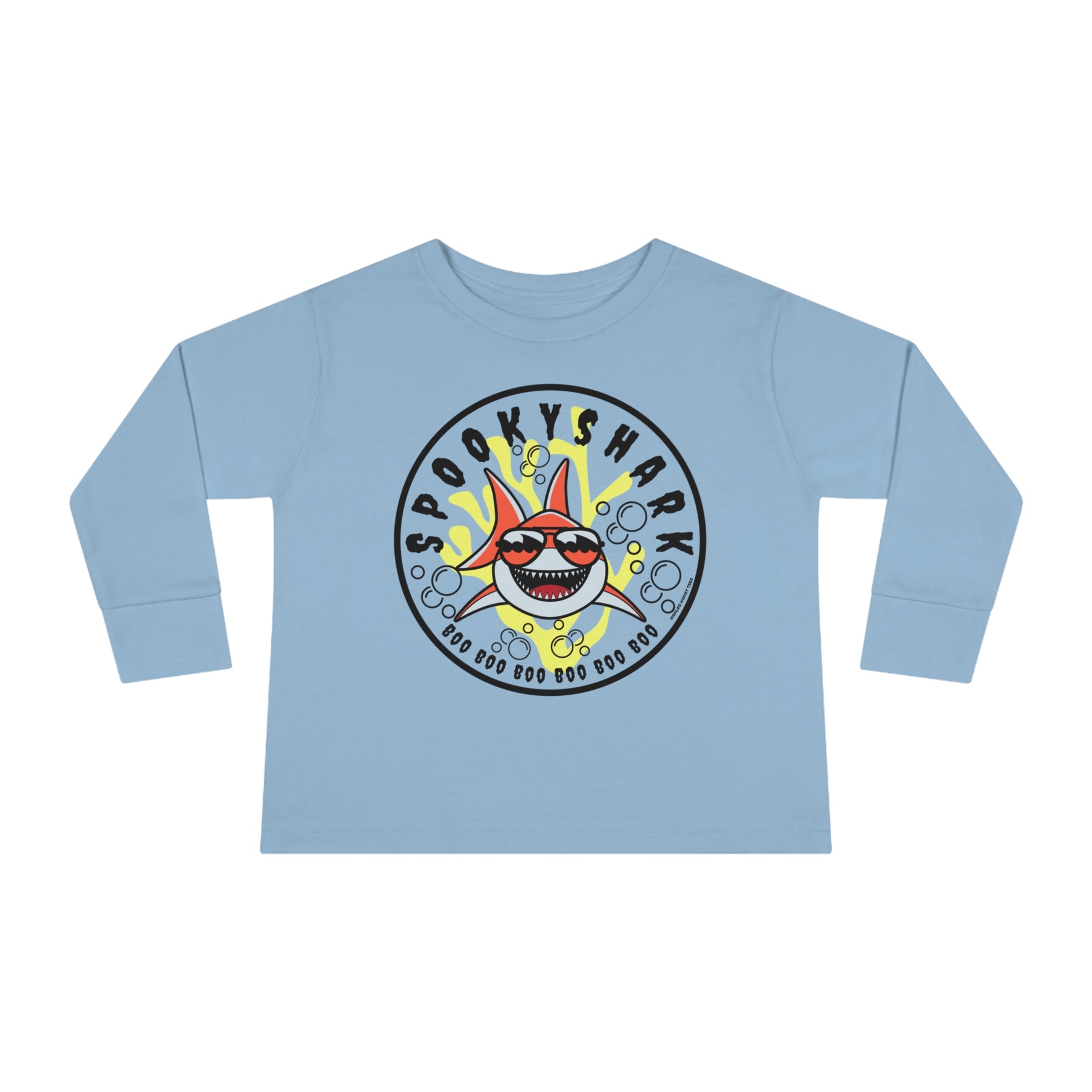 A custom toddler long-sleeve tee featuring a Spooky Shark design. Made of 100% combed ringspun cotton, with topstitched ribbed collar and EasyTear™ label for comfort and durability. From Worlds Worst Tees.