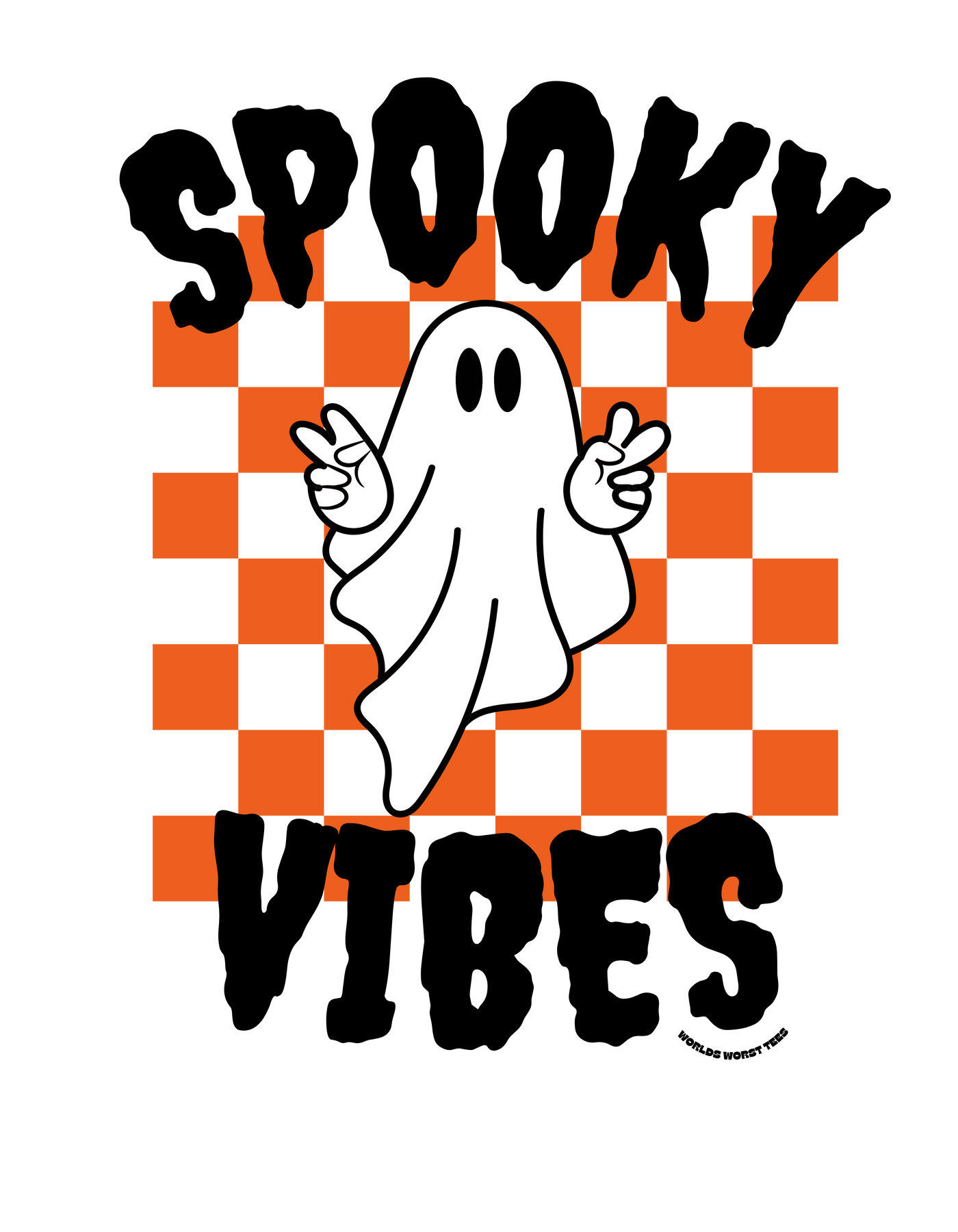 Spooky Vibes Toddler Long Sleeve Tee featuring a cartoon ghost illustration on a checkered background. 100% combed ringspun cotton, topstitched ribbed collar, and EasyTear™ label for durability and comfort.