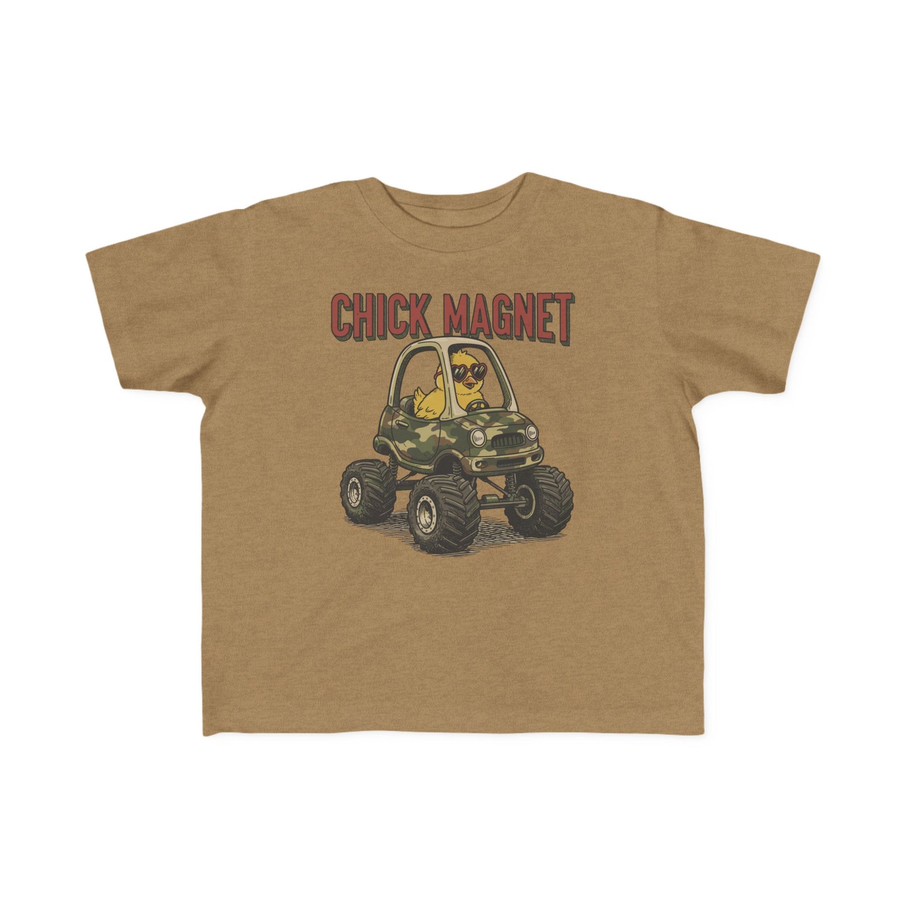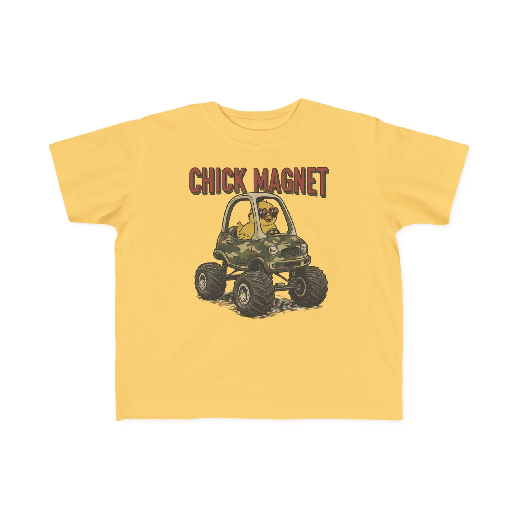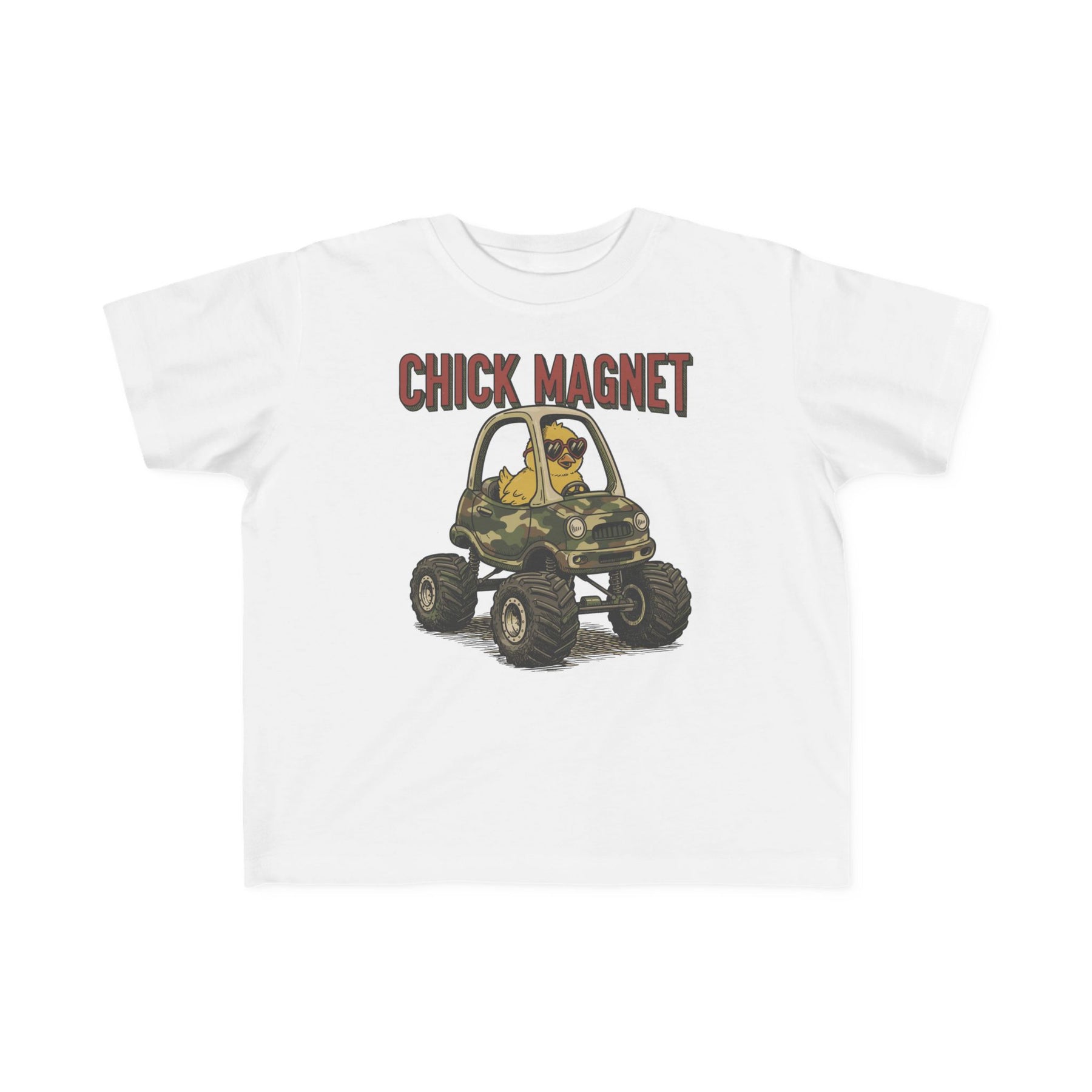 Chick Magnet Toddler Tee featuring a cute yellow chick in heart sunglasses driving a camo monster-truck, with a humorous CHICK MAGNET caption. Soft, durable, perfect for toddlers.