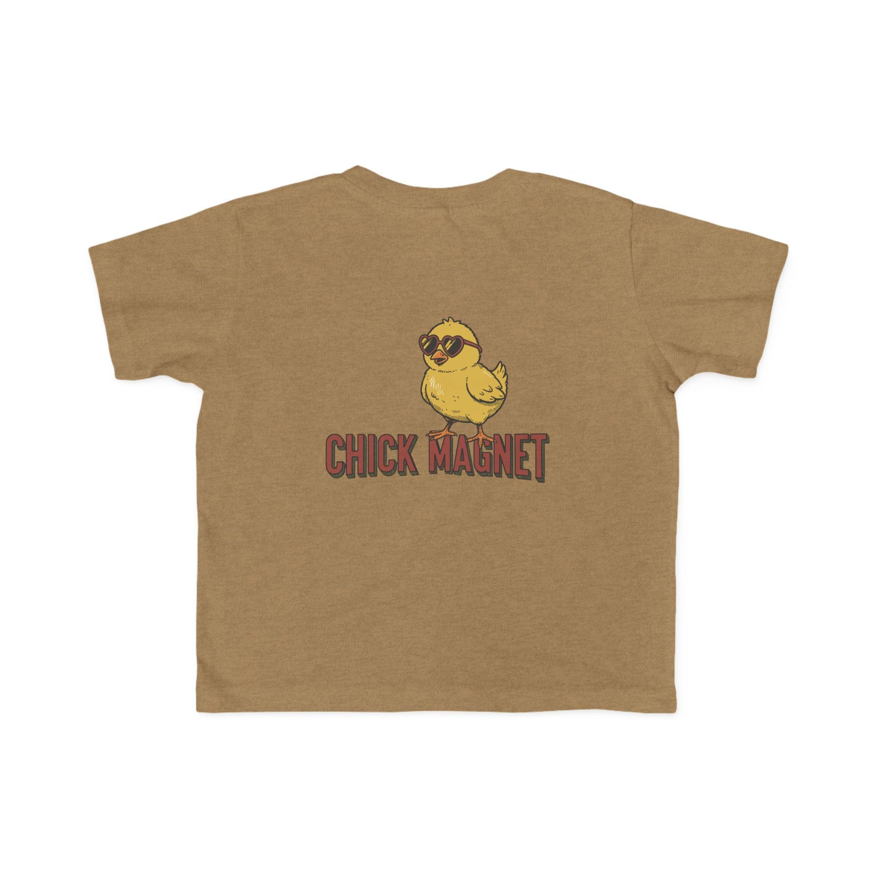 Chick Magnet Toddler Tee featuring a cartoon yellow chick in heart-shaped sunglasses with the slogan “CHICK MAGNET” on the back. Ideal for toddlers’ comfort and style.