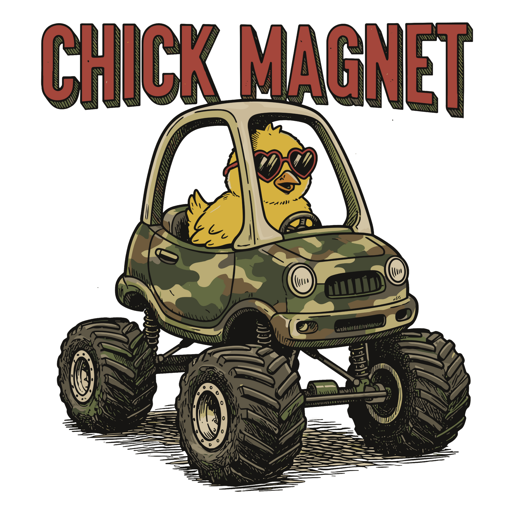 Chick Magnet Toddler Tee featuring a cartoon chick in sunglasses driving a camouflage monster truck, perfect for toddlers with its soft, durable cotton fabric.