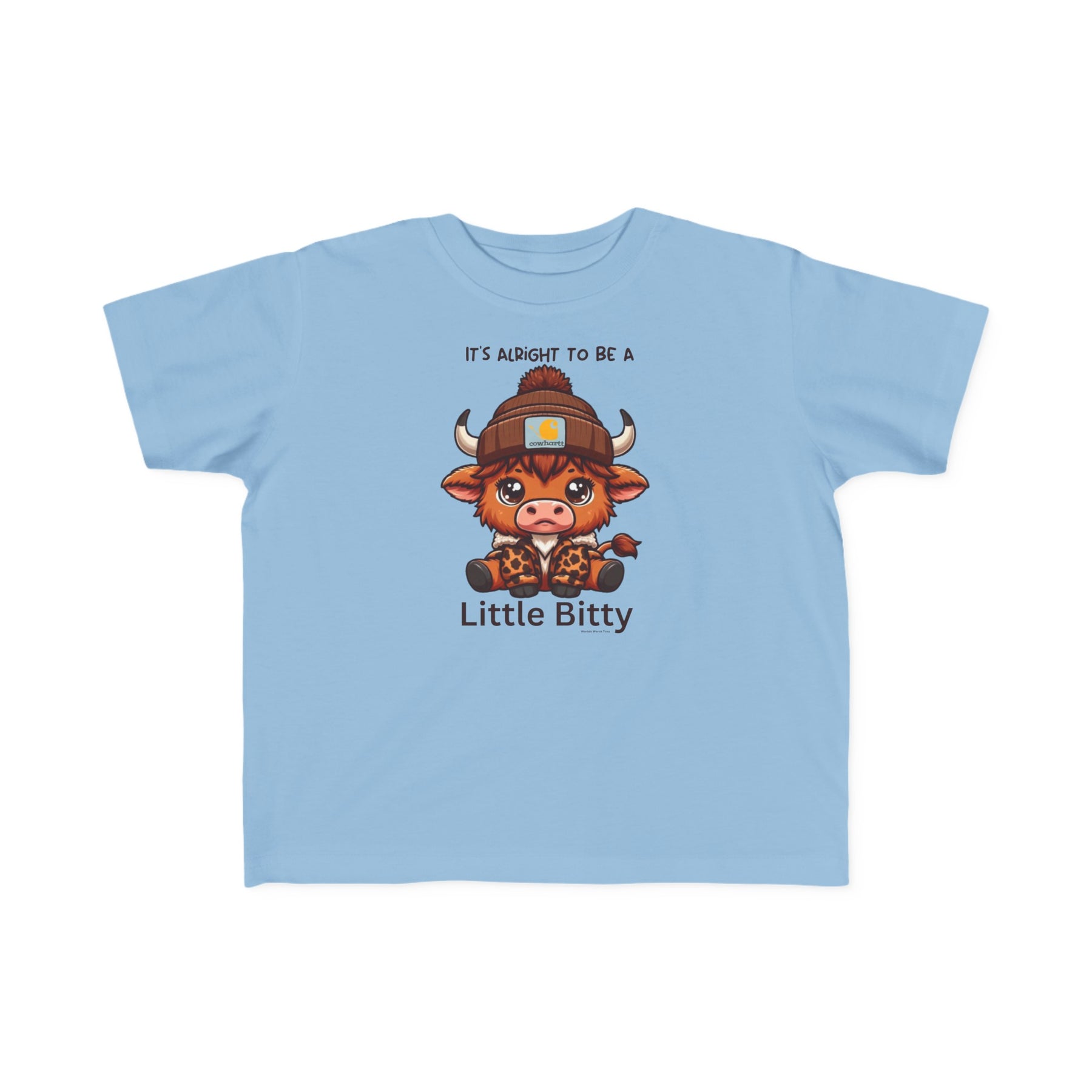 A Little Bitty Toddler Tee featuring a cartoon cow with a hat, perfect for sensitive skin. 100% combed ringspun cotton, light fabric, tear-away label, classic fit. Sizes: 2T, 3T, 4T, 5-6T.