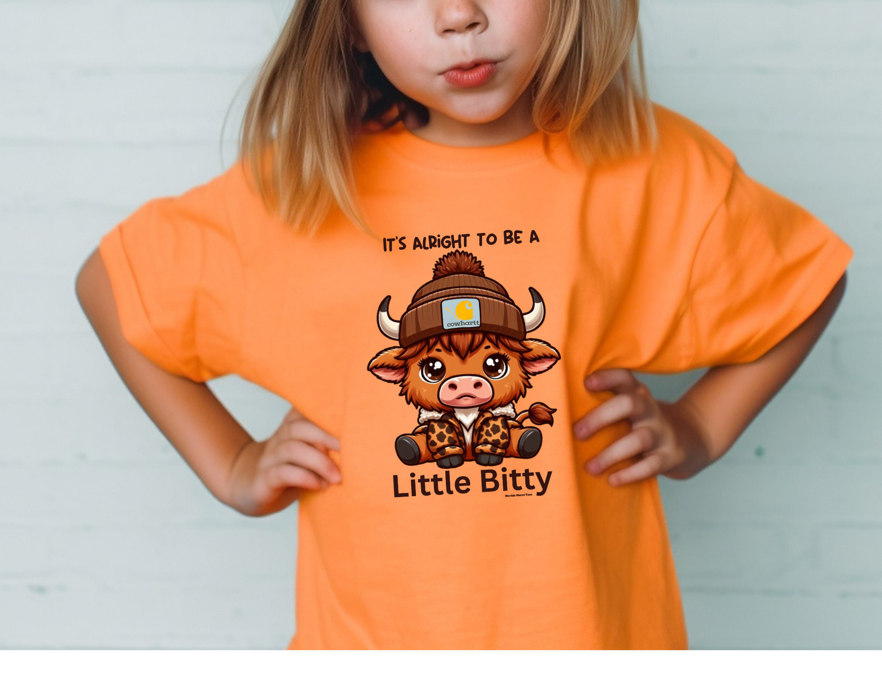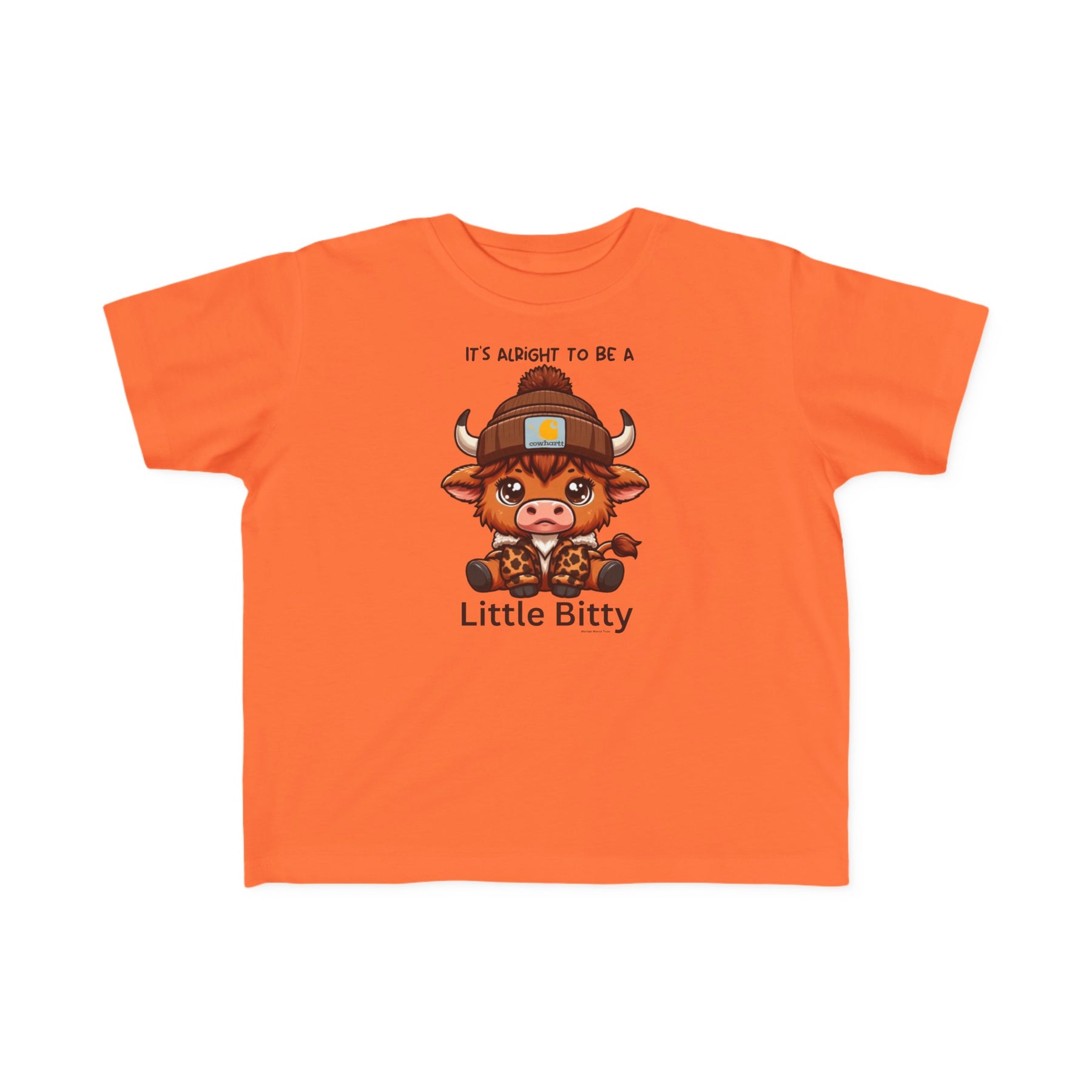 Little Bitty Toddler Tee featuring a cartoon cow graphic on an orange shirt. Soft 100% combed ringspun cotton, tear-away label, classic fit. Available in sizes 2T to 5-6T.
