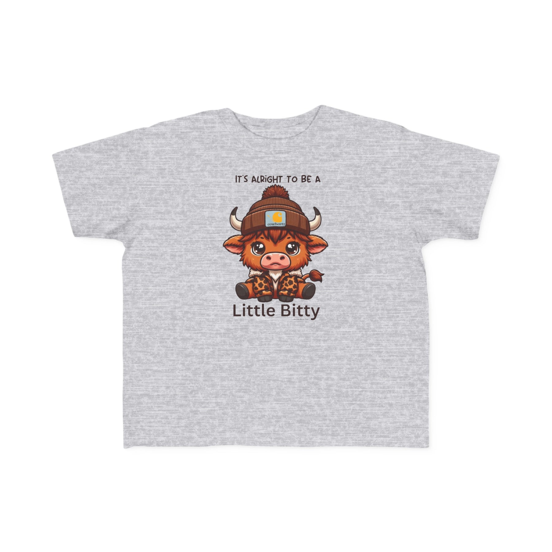 Little Bitty Toddler Tee featuring a cartoon cow on a grey shirt. Soft 100% combed ringspun cotton, tear-away label, classic fit. Available in sizes 2T to 5-6T. Ideal for sensitive skin.