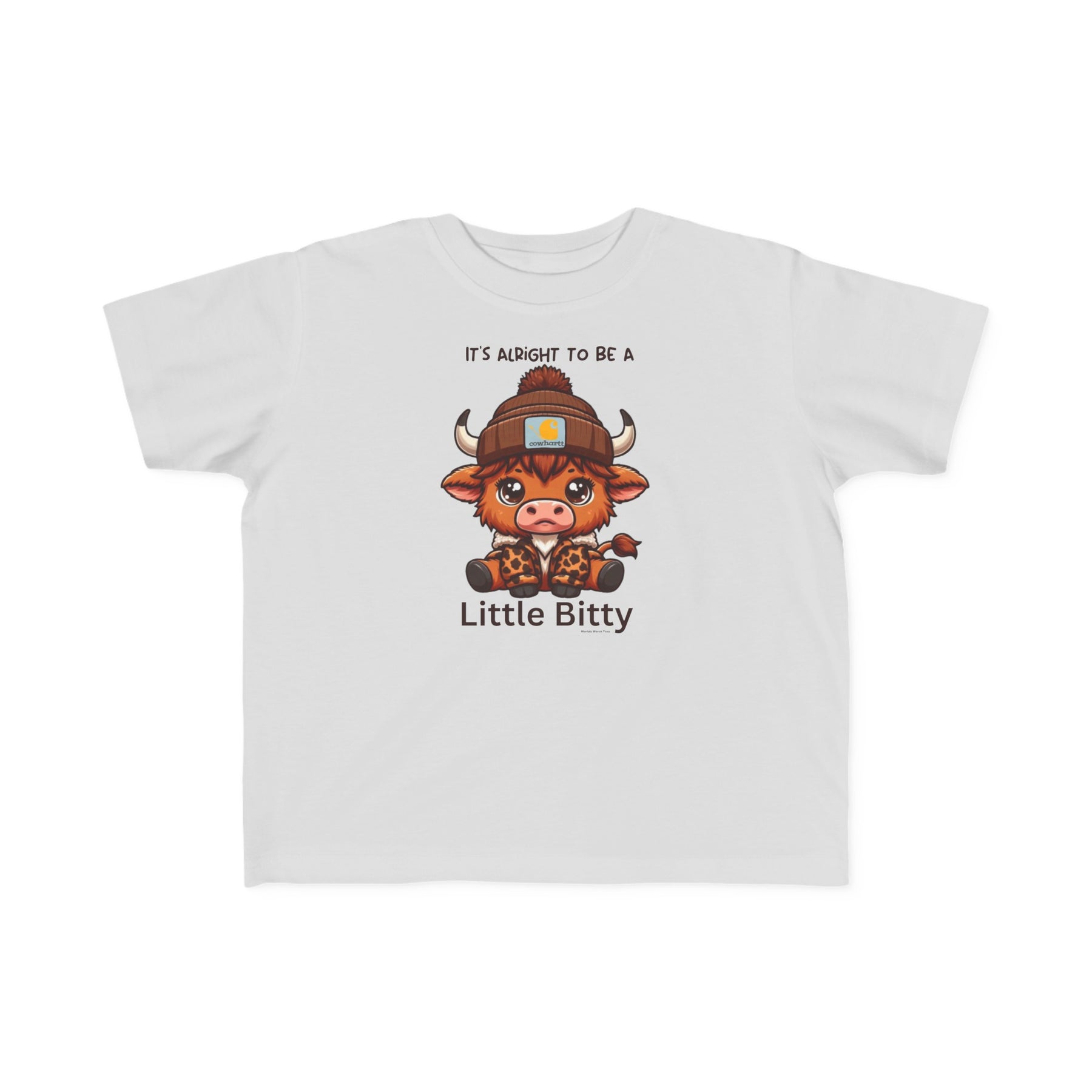 A Little Bitty Toddler Tee featuring a cartoon cow design on white fabric. Made of soft 100% combed ringspun cotton, light and durable for sensitive skin. Classic fit with tear-away label.