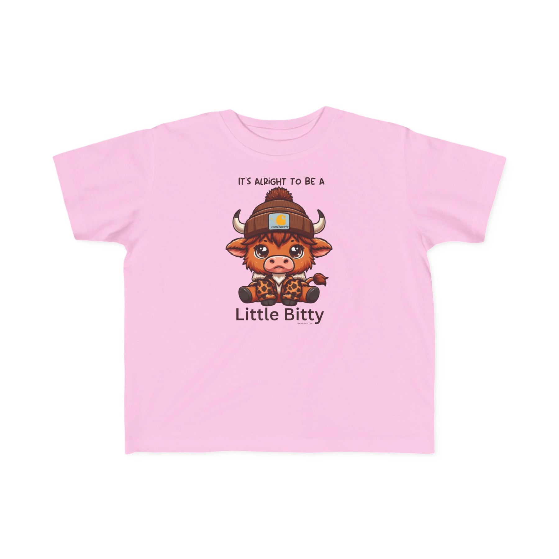Little Bitty Toddler Tee featuring a cartoon cow design on pink fabric. Soft 100% combed ringspun cotton, tear-away label, and classic fit. Available in sizes 2T to 5-6T.