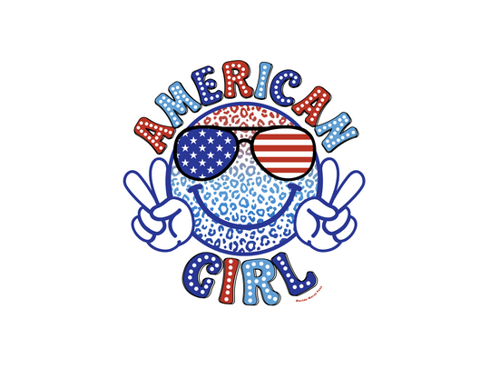 American Girl Toddler Hoodie featuring a logo with a face and sunglasses, a smiley face cartoon, and blue and white sunglasses with stars. Designed for comfort with durable construction and side seam pockets.
