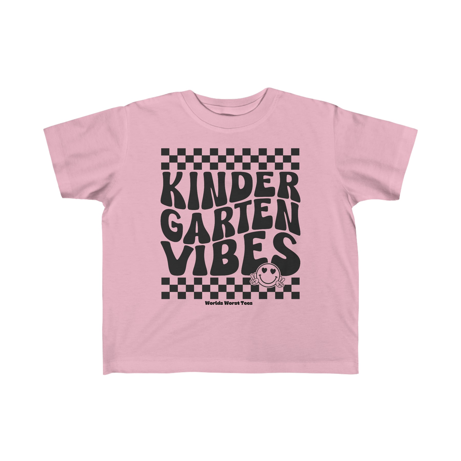 A Kindergarten Vibes Toddler Tee featuring black text on a pink shirt. Made of 100% combed ringspun cotton, light fabric, and a tear-away label. Ideal for sensitive skin, with a classic fit for toddlers.