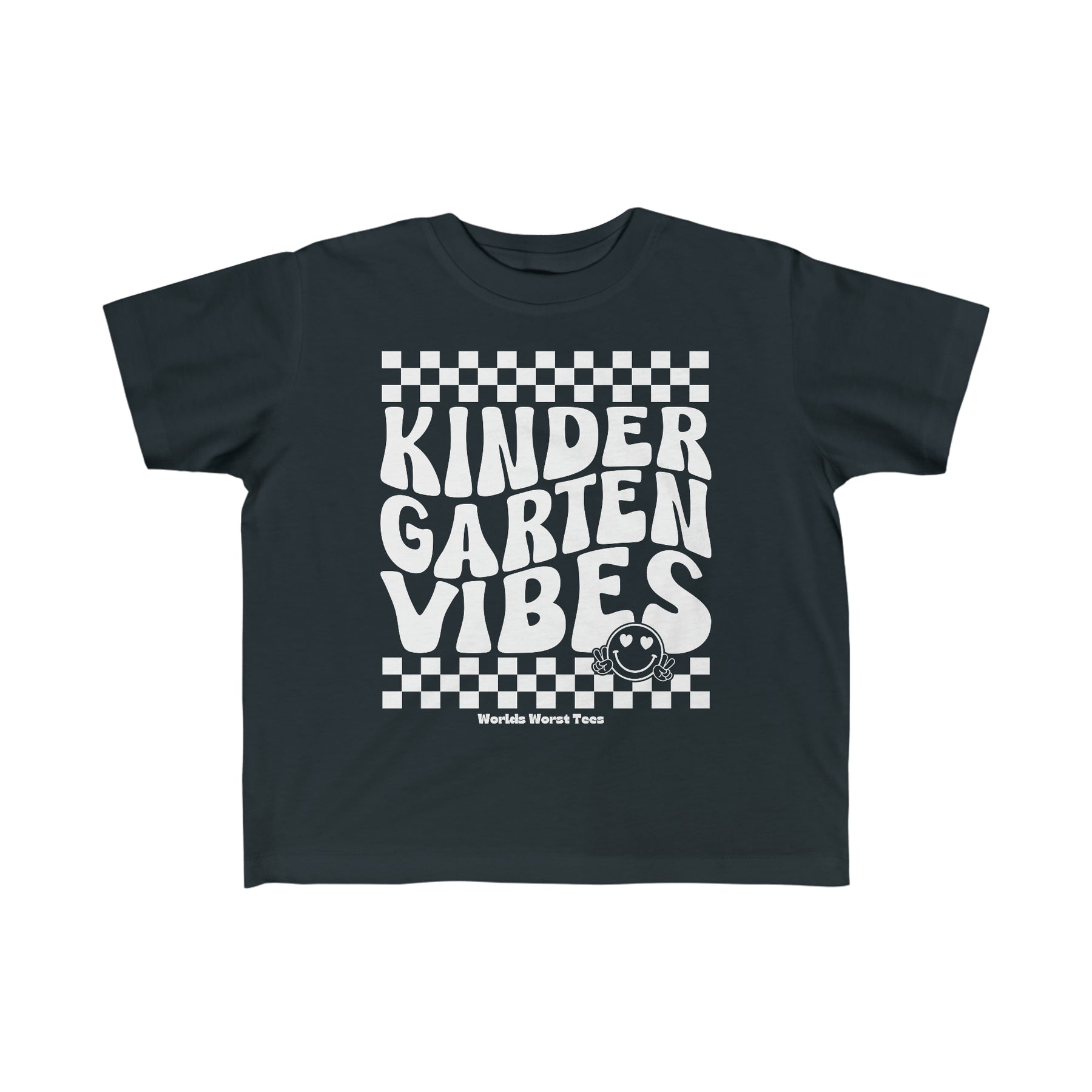 A Kindergarten Vibes Toddler Tee featuring black text on a white shirt. Made of 100% combed ringspun cotton, light fabric, classic fit, tear-away label, perfect for sensitive skin.