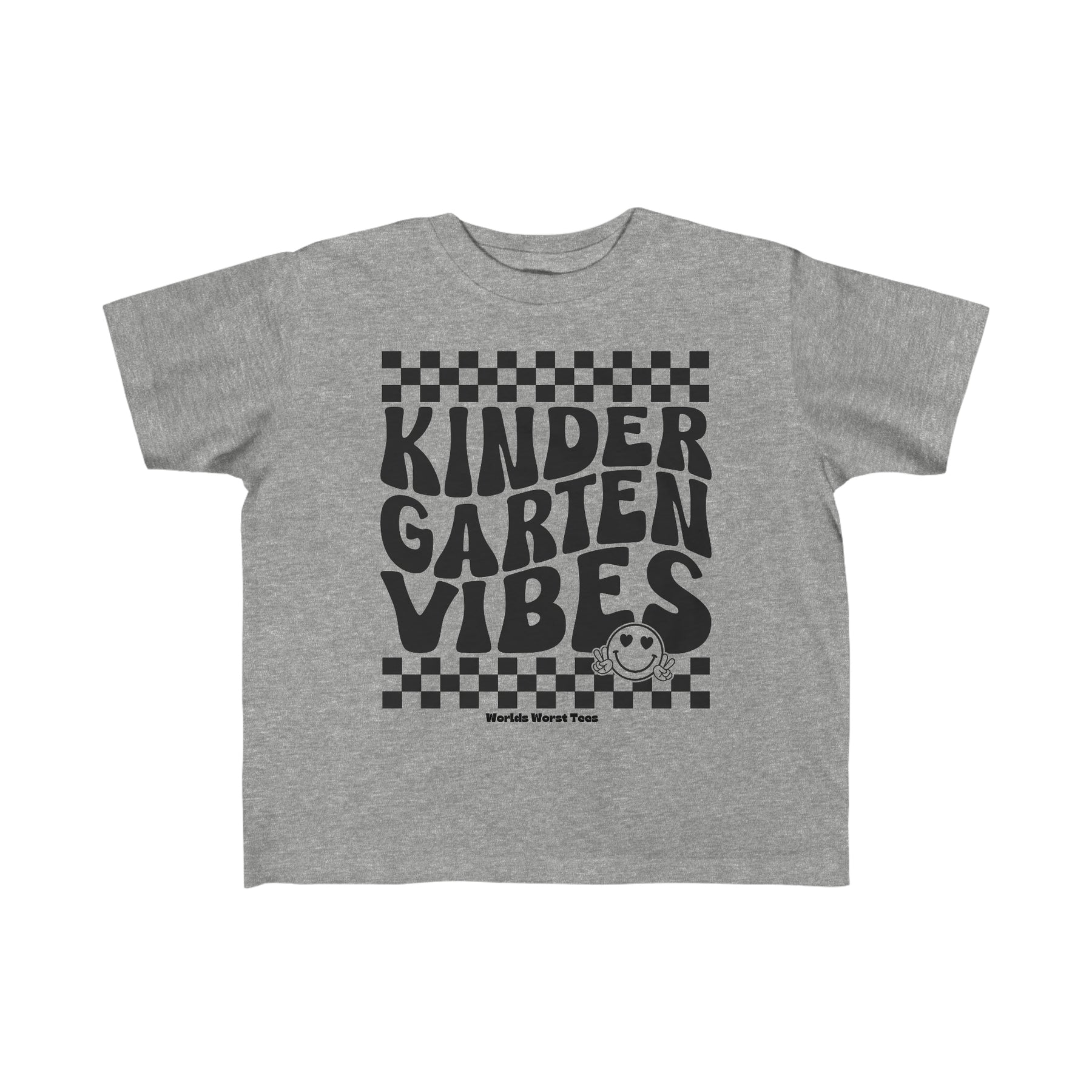 A Kindergarten Vibes Toddler Tee in grey with black text, featuring a durable print perfect for sensitive skin. Made of 100% combed ringspun cotton, light fabric, classic fit, tear-away label, and true-to-size.
