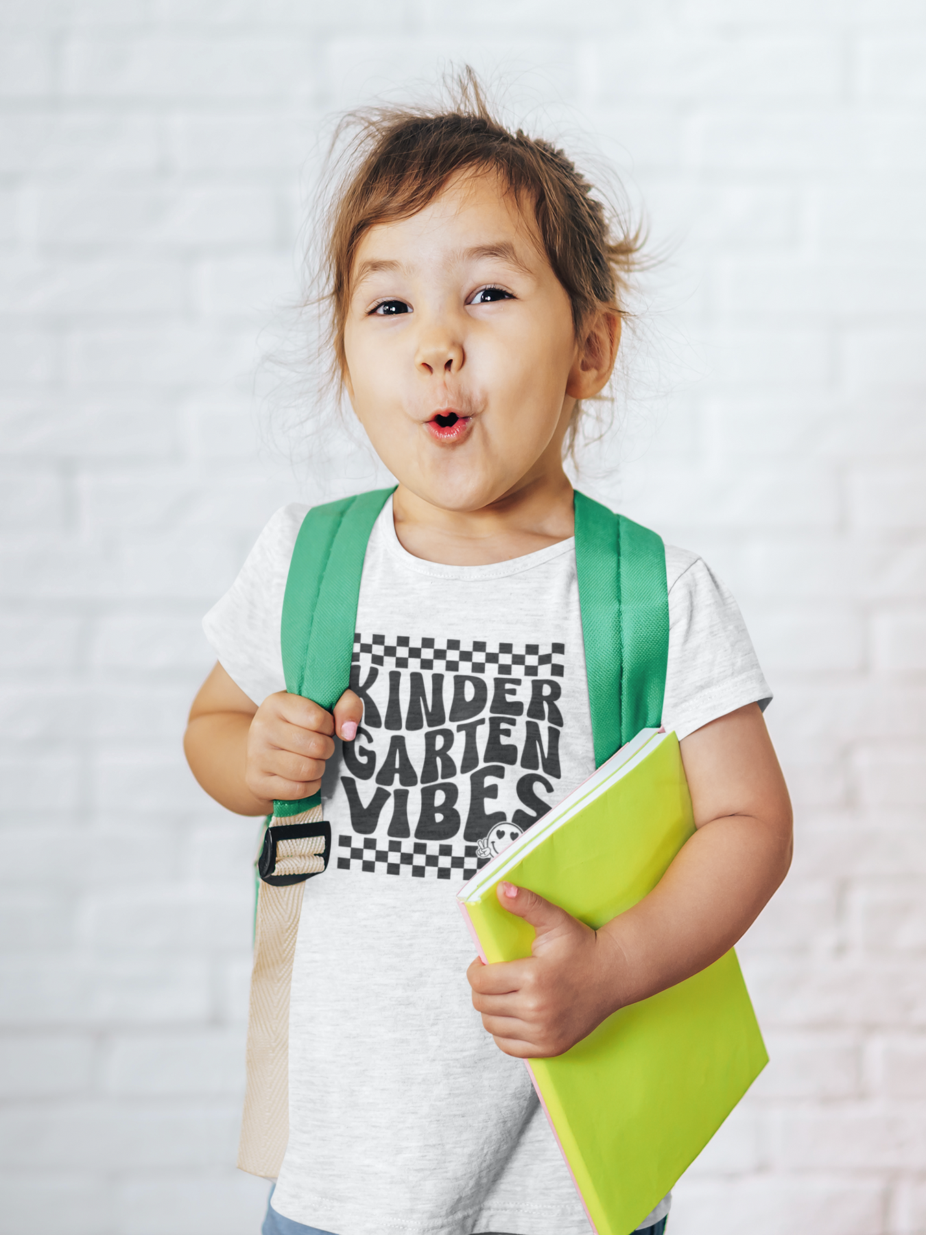 A Kindergarten Vibes Toddler Tee featuring a child with a backpack and a book. Soft 100% combed ringspun cotton, light fabric, tear-away label, and a classic fit for comfort and durability. Ideal for young explorers.