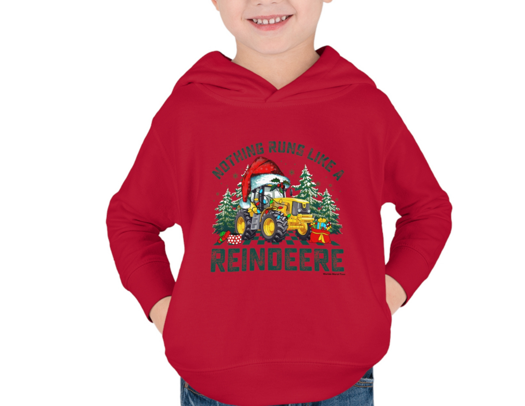 Reindeere Toddler Hoodie with tractor design. Jersey-lined hood, double-needle hem, cover-stitched details, and side-seam pockets for durability and comfort. Ideal for cozy playtime.