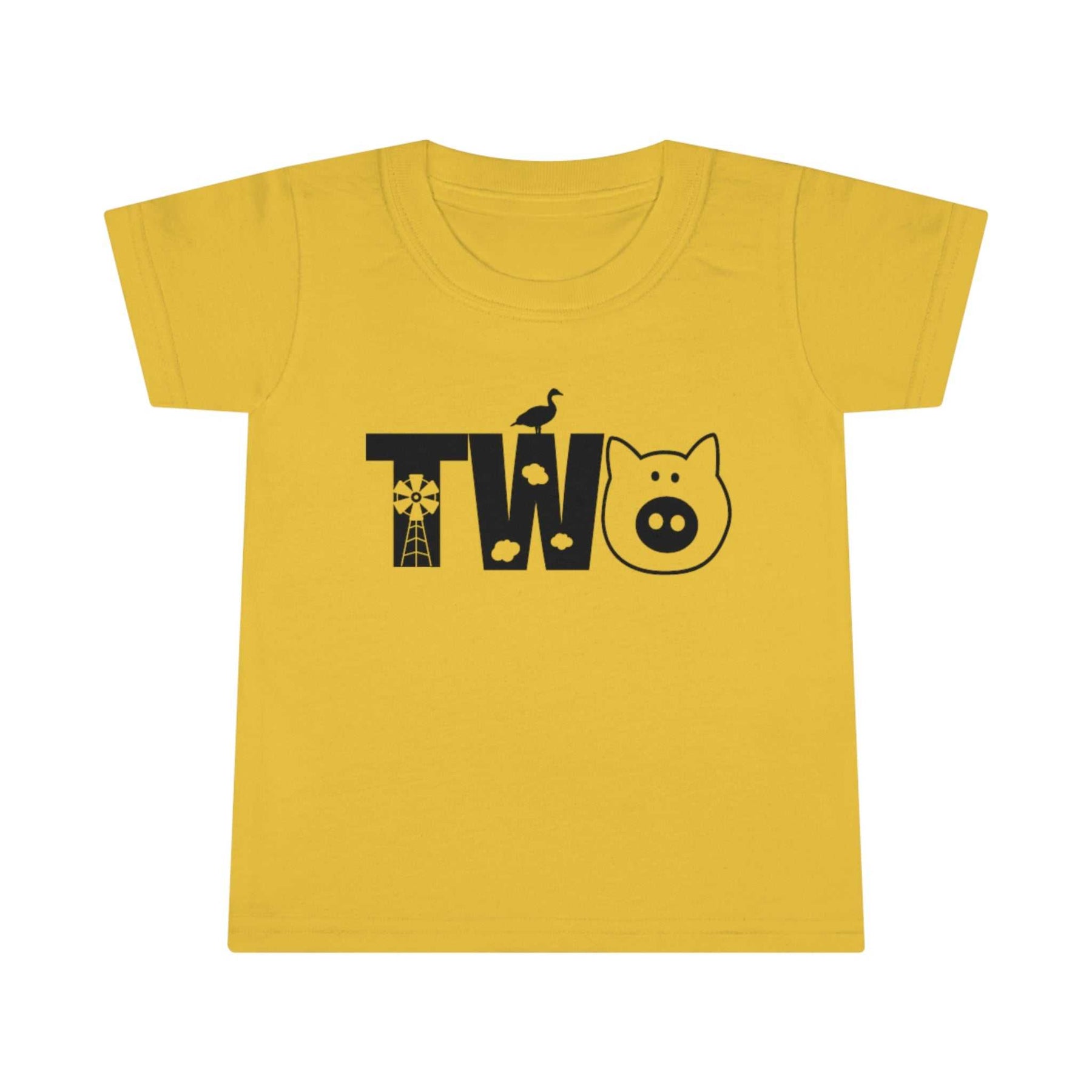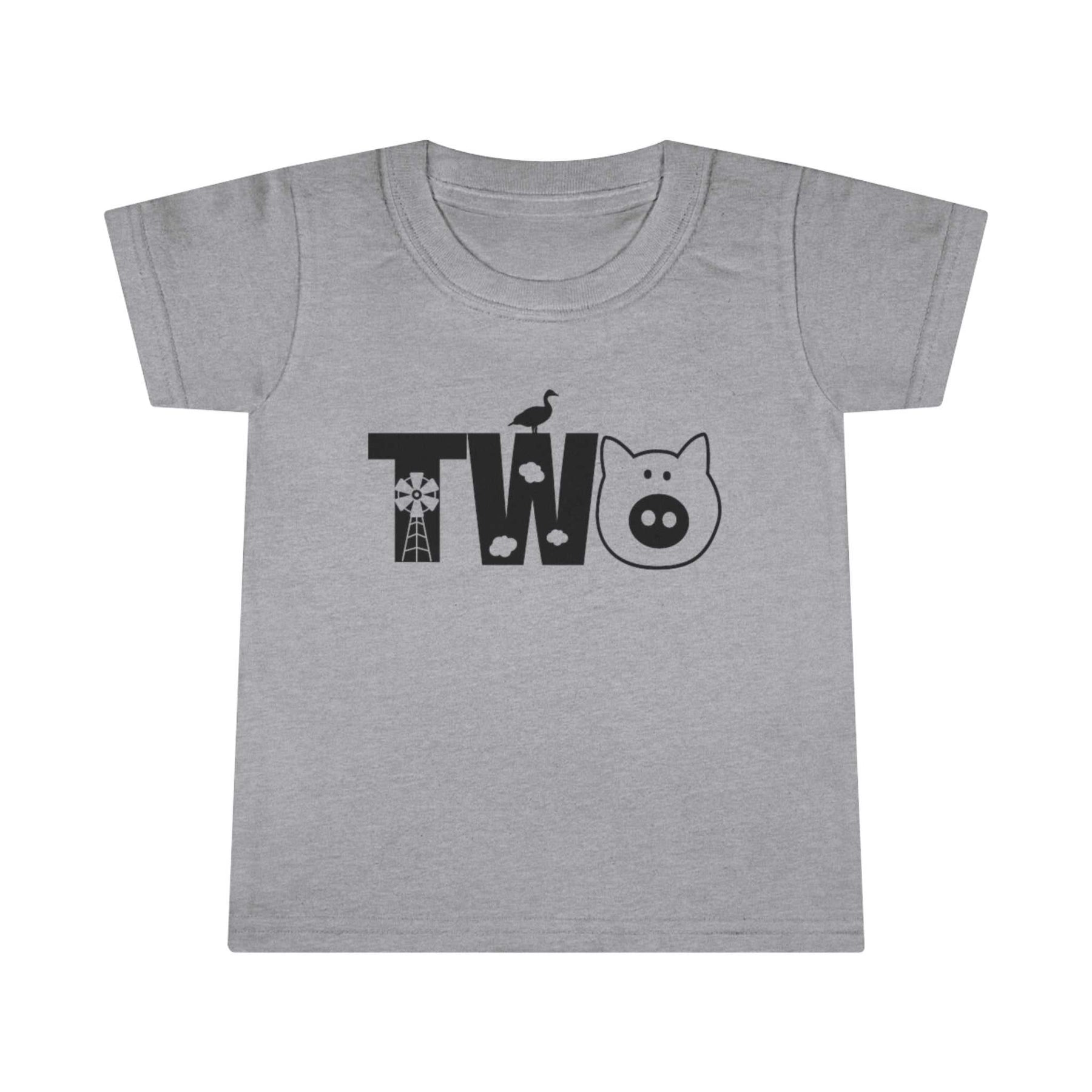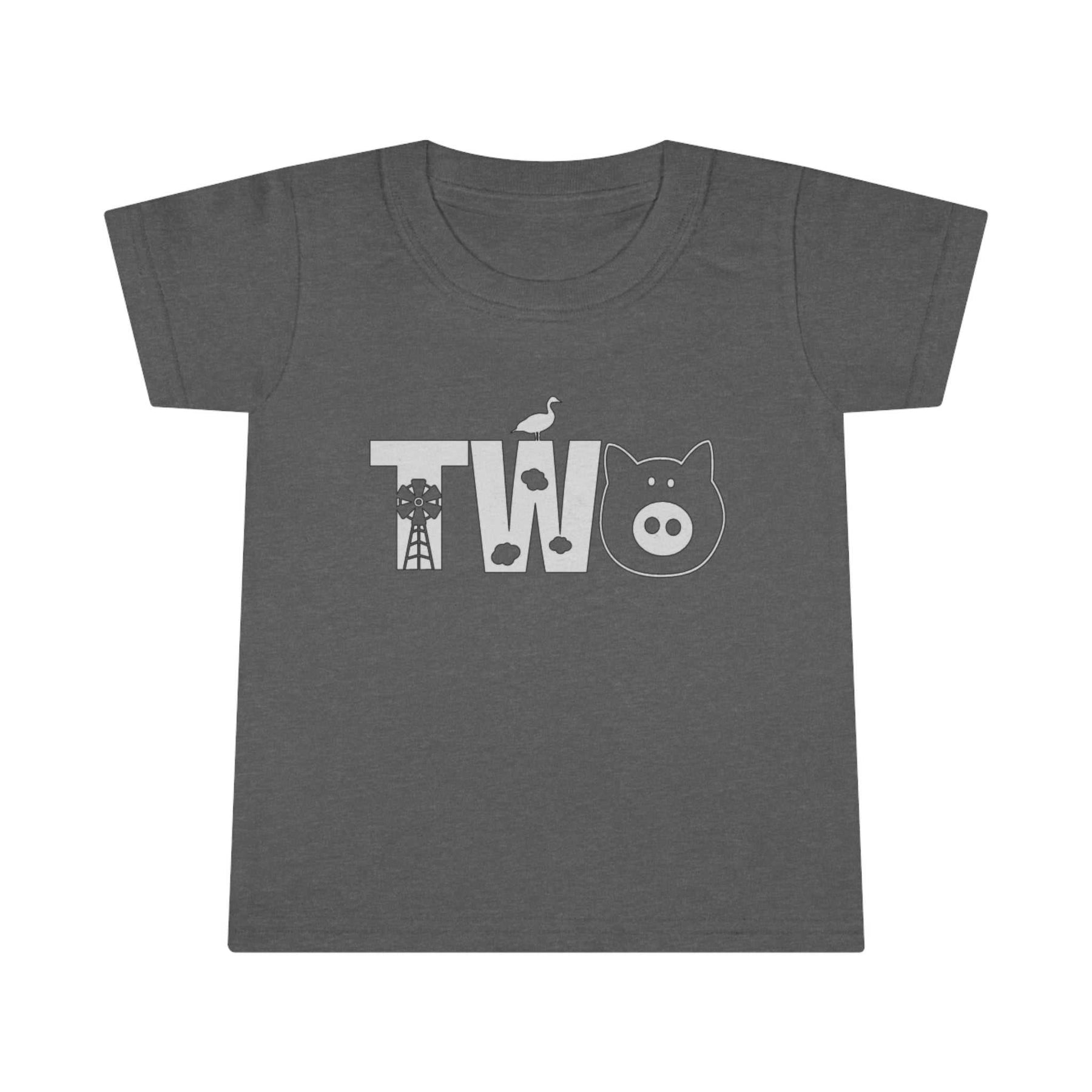 A classic fit Two Toddler Tee in grey with white text and animal designs. Made of 100% Ringspun cotton, featuring a 3/4 double-needle topstitched collar for durability. From Worlds Worst Tees.